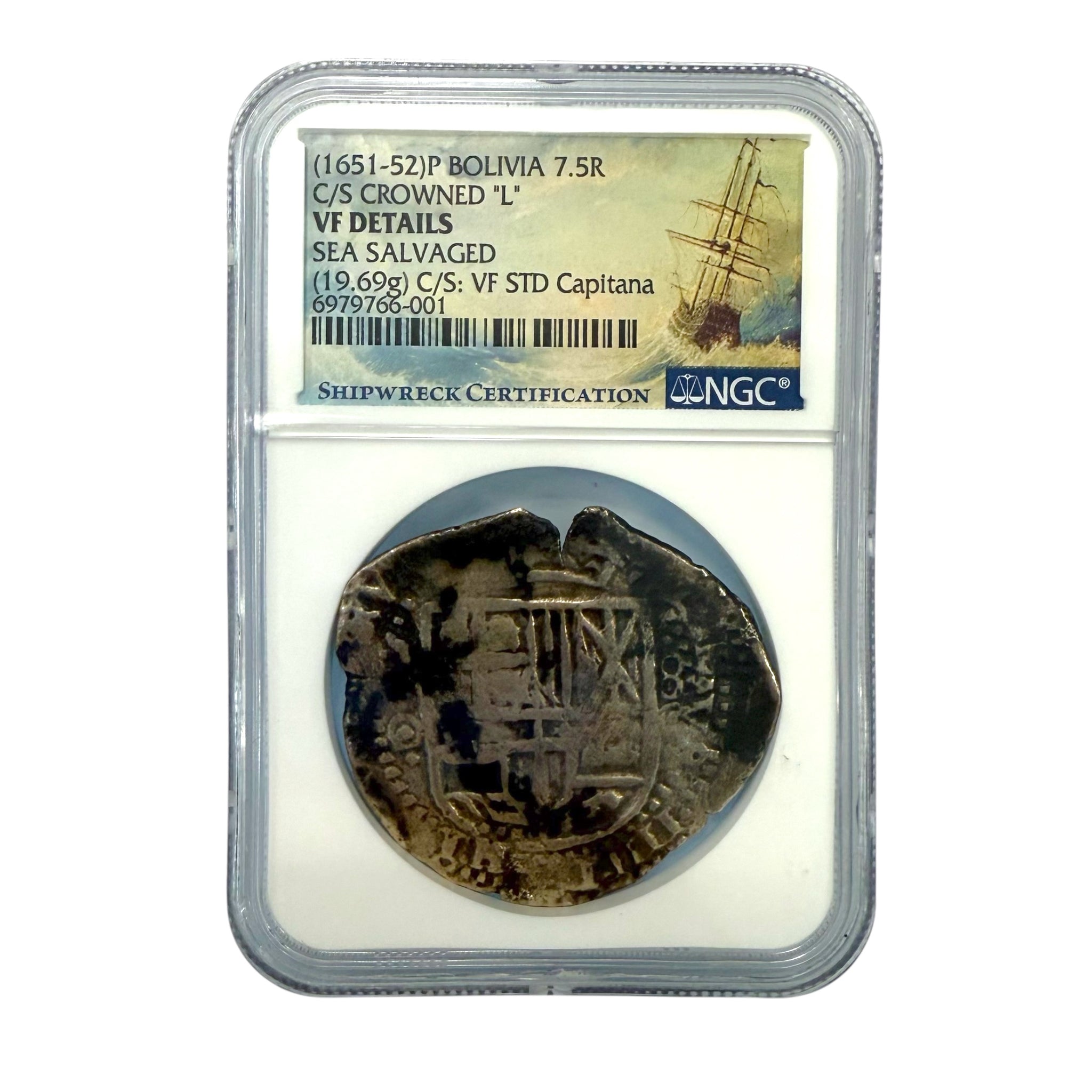 Shipwreck: La Capitana - Sank off Chanduy, Ecuador in 1654 Denomination: 8 Reales Mint: Potosi, Bolivia Assayer: "E" Erqueta 1651 Date: Not Visible Weight: 24.08 gm...
