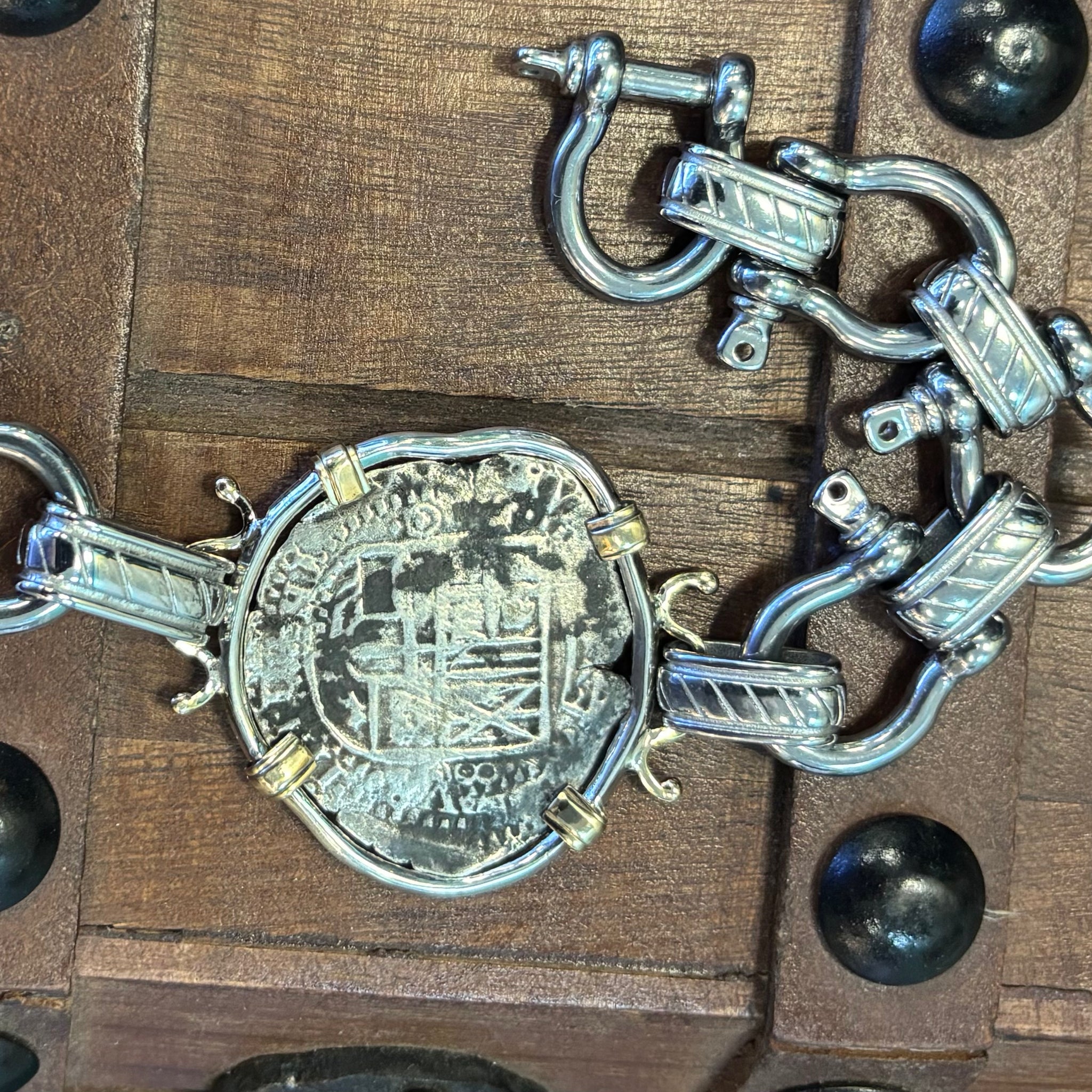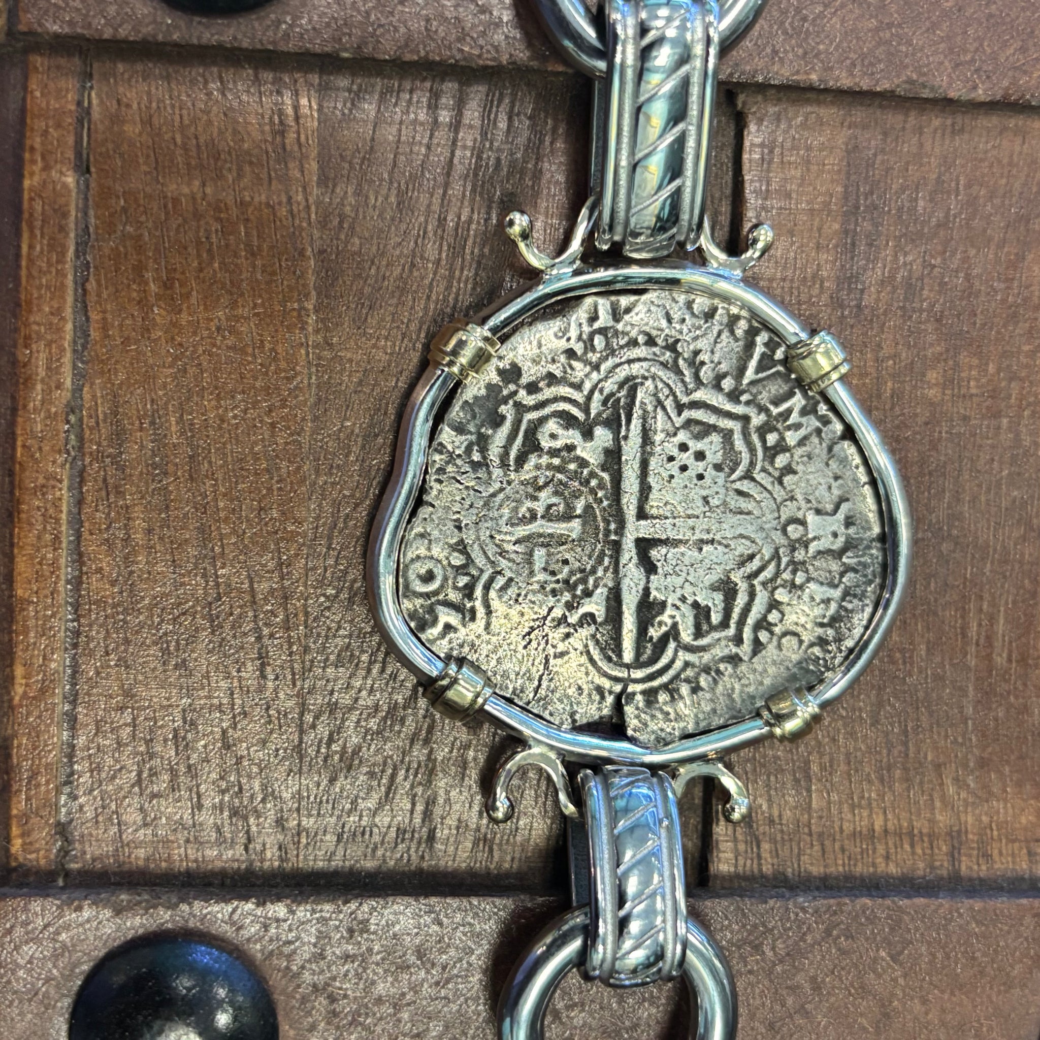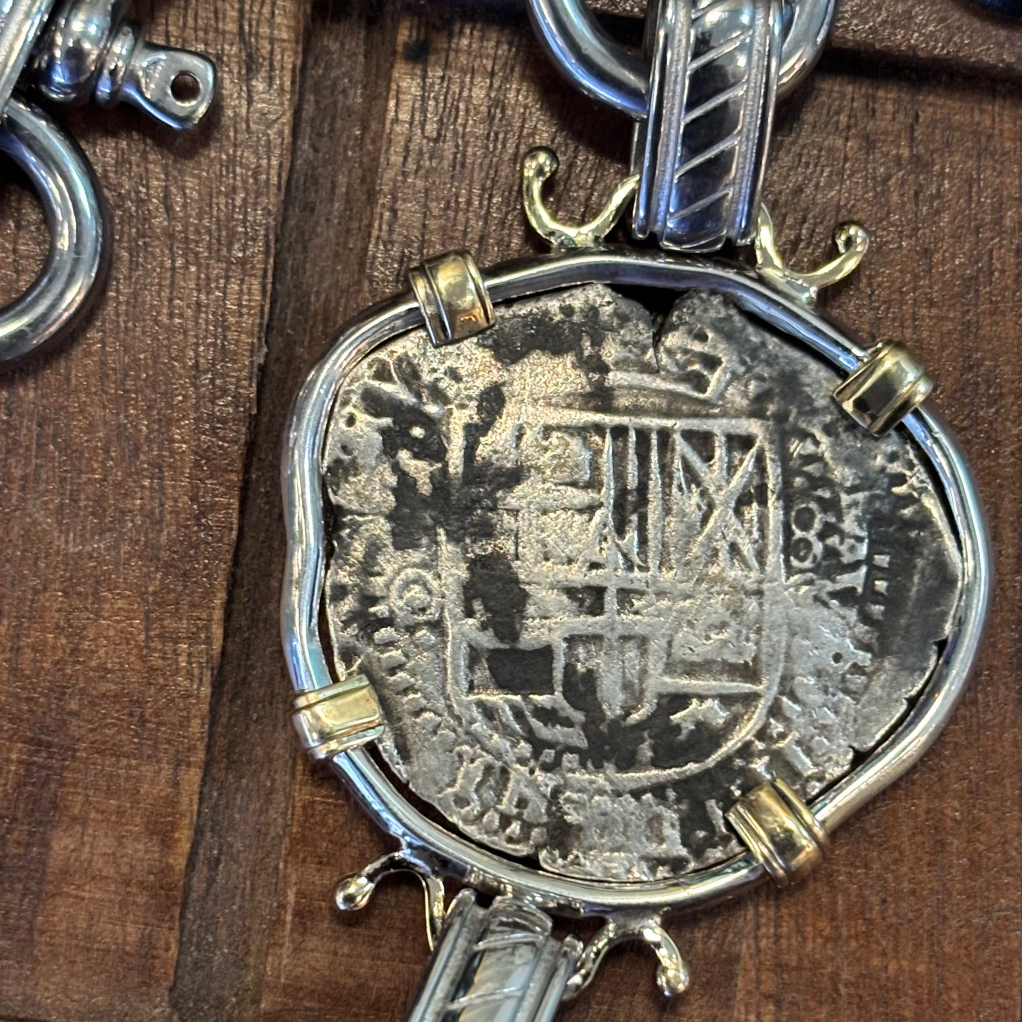 Denomination: 8 Reales Reign: Philip IV Mint: Potosi Assayer: Erqueta "E" Weight: 20.2 g Date: Not Visible Coin History: Pillars & Wave, Transitional coin - Type IV/A Mount: 14K Gold Description: This...