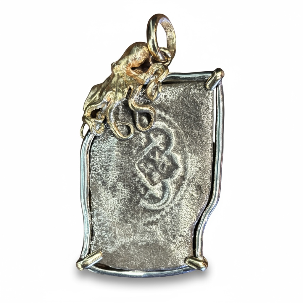 Denomination:Â 8 Reales Date:Â Full Date 1714 Mint: Mexico Reign: Philip V Weight:Â 18.56 gm Assayer: Not Visible Grade:Â 2Â Mount: Custom 14K gold Octopus. Â Wearable on both sides....
