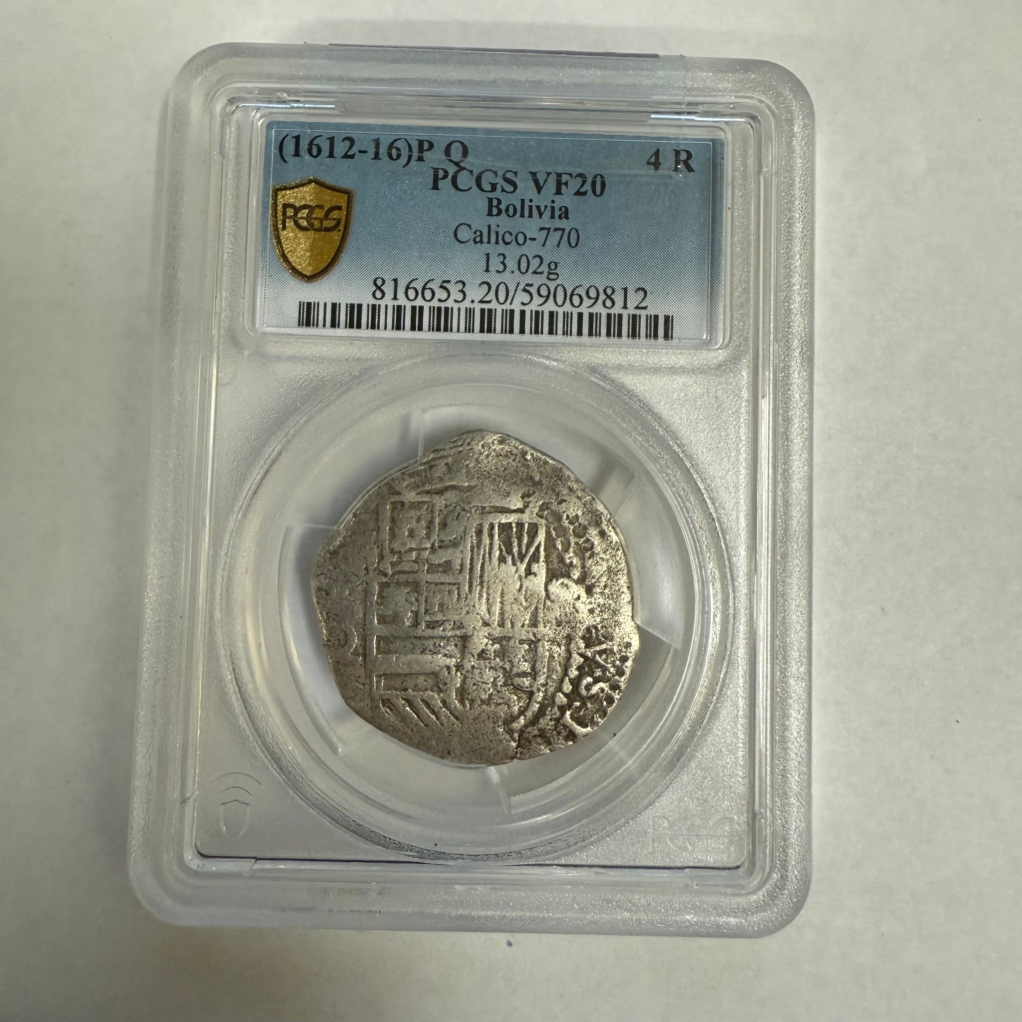 Denomination: 4 Reales Date: Not Visible Assayer: "Q" Augustin del la Quadra (1612-1616) Weight: 13.02 gm Grade: PCSG – 59069812 - VF20 ...
