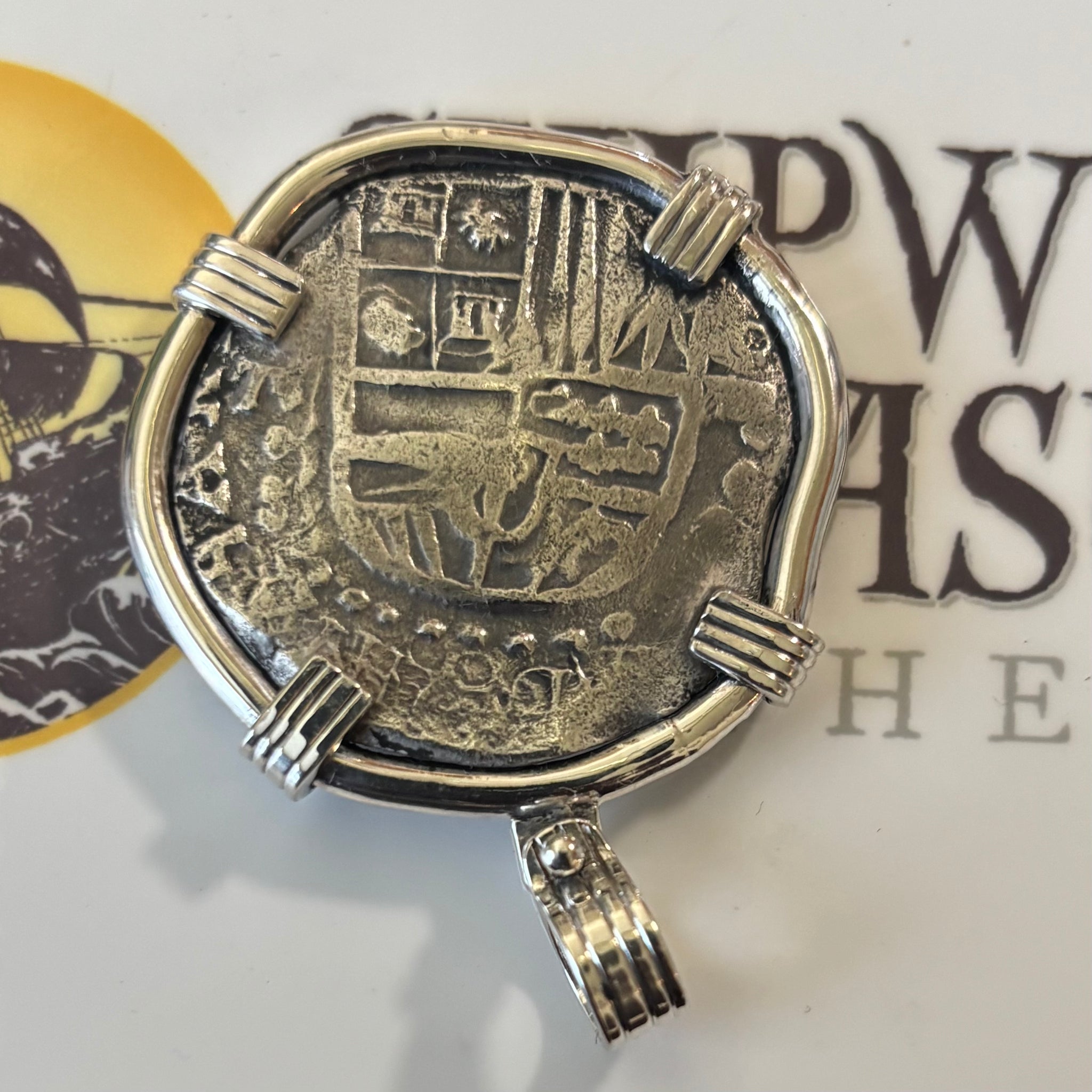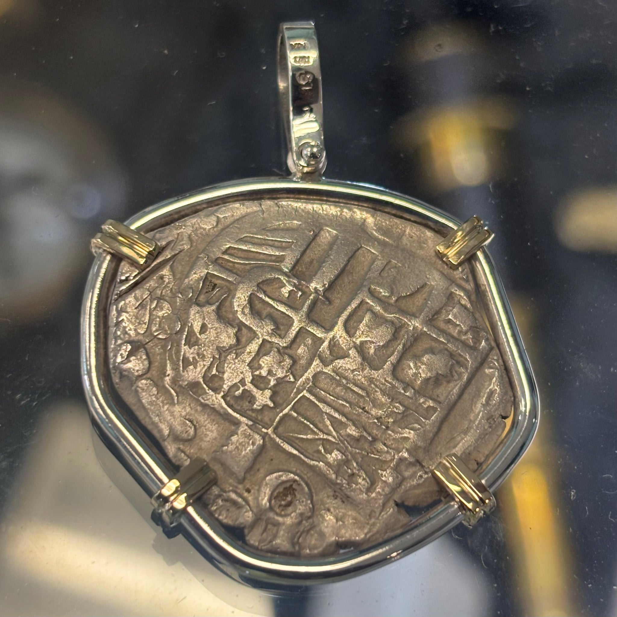Denomination: 8 Reales Date: Circa 1589-1598 Assayer: Not Visible Reign: Philip Mount: Sterling Silver with 18k Gold Prongs & Bale Mint: Seville Description: Obverse: Crowned shield of the...