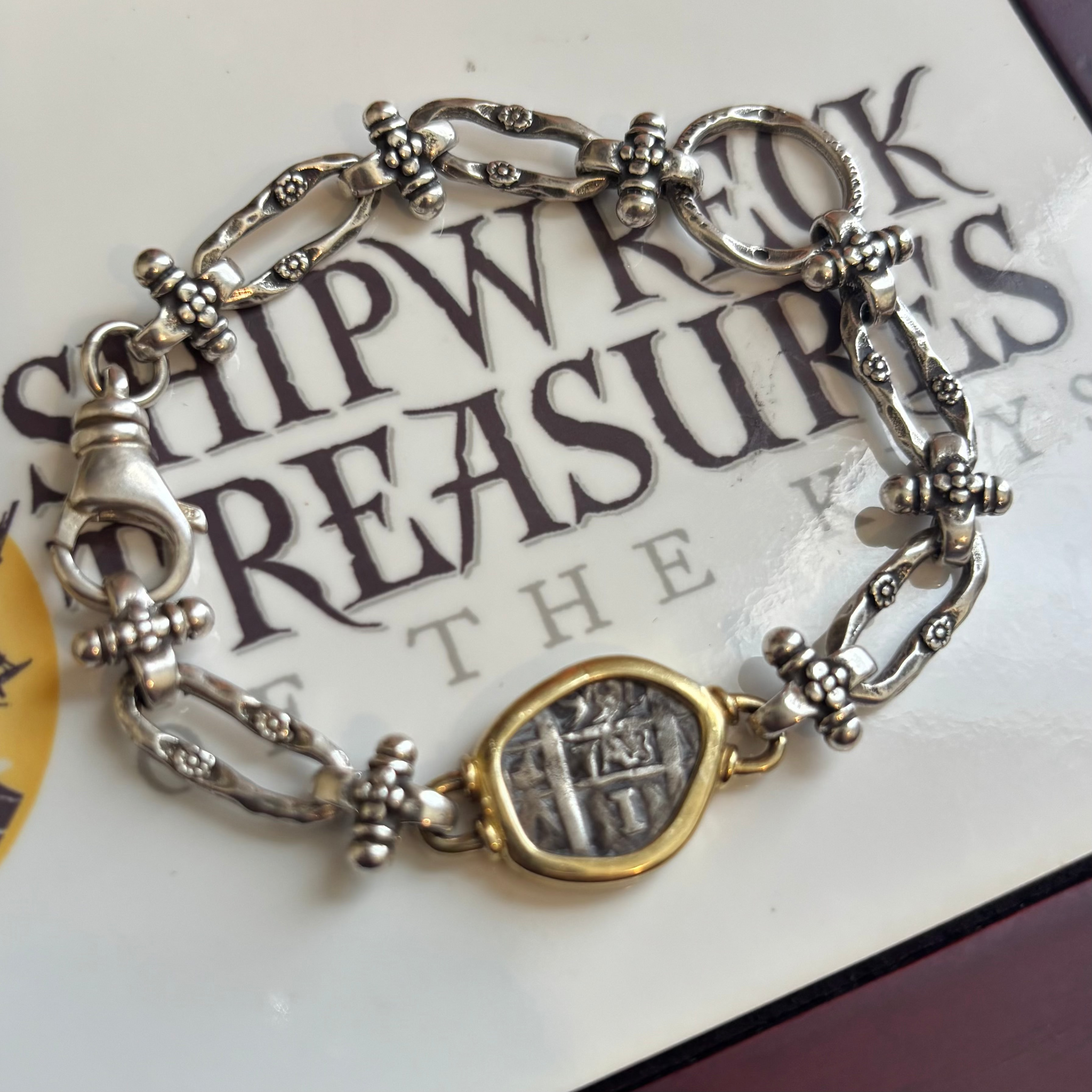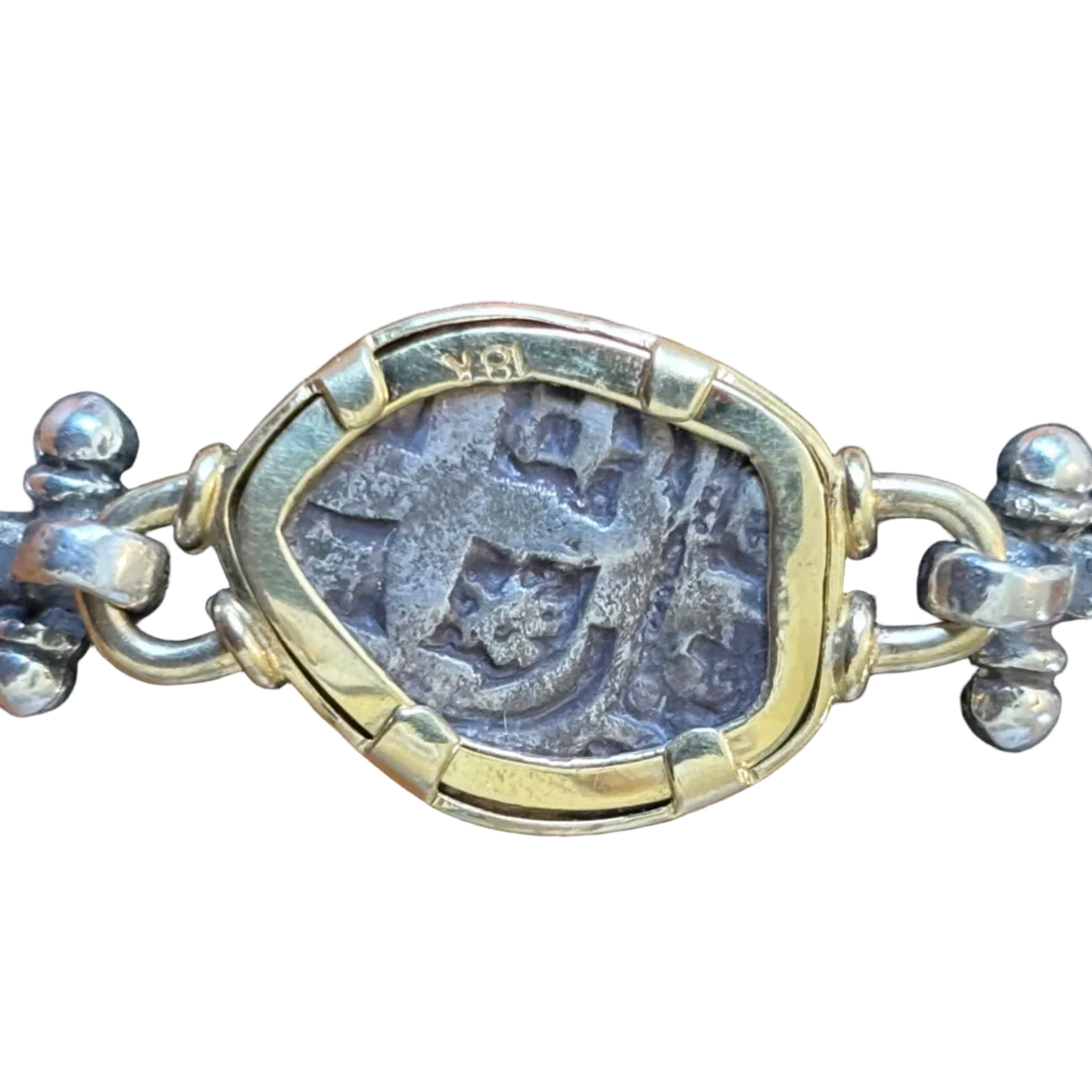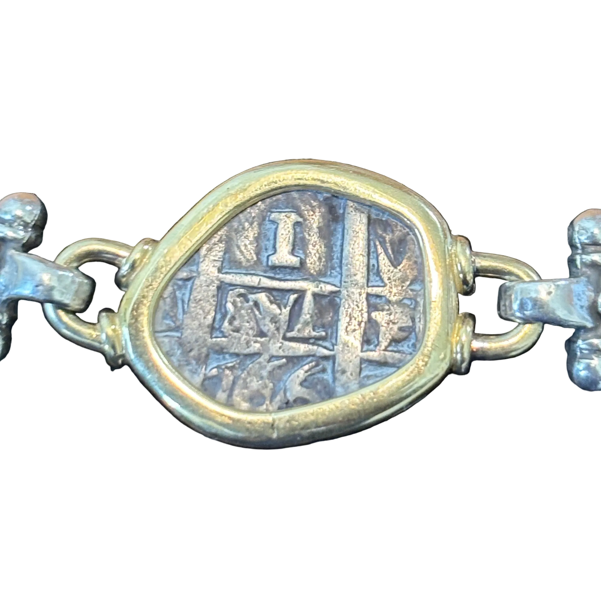 Denomination: 1/2 Reales Date: 1766 Mint: Mexico Assayer: Not Visible Mount: Sterling Silver bracelet with 18K gold bezel. Description: 1/2 Reales Cob. Environmental damage. Obverse: Off centered...