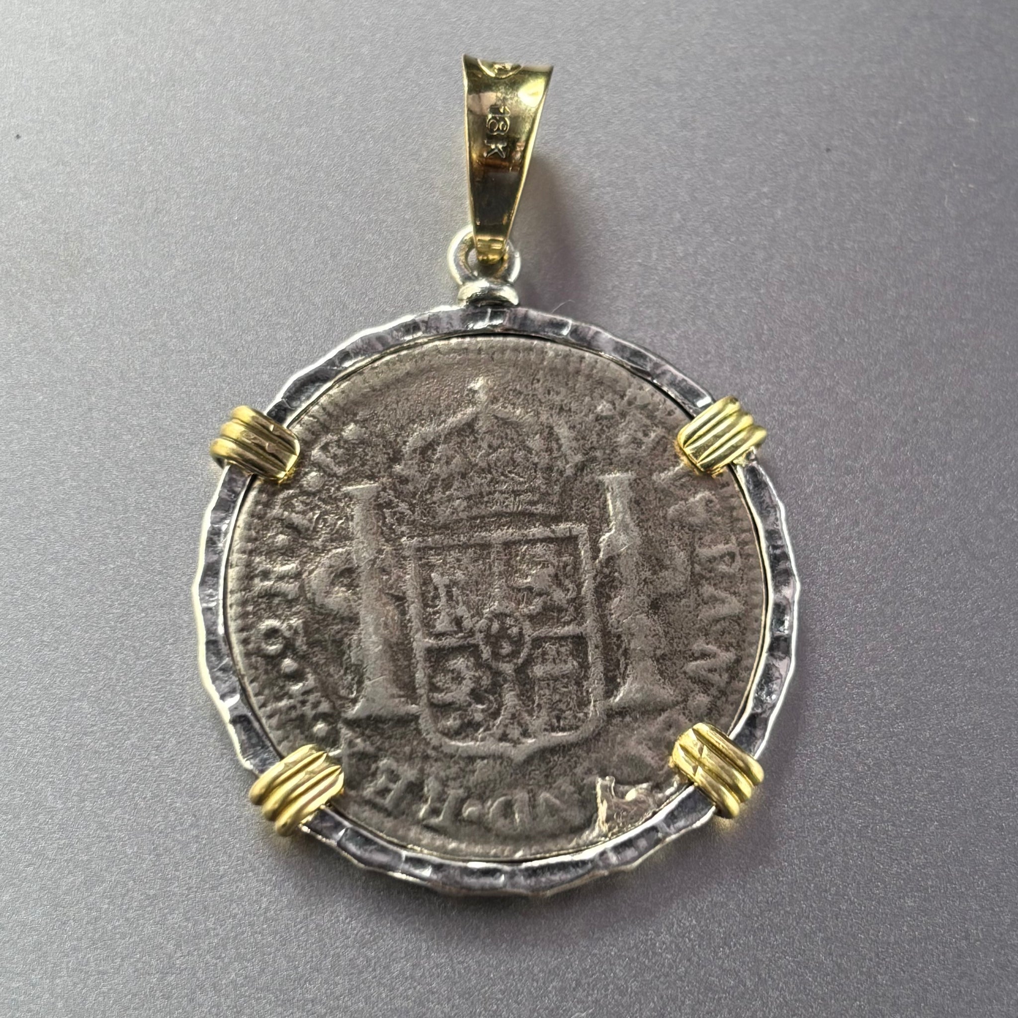 Denomination: 2 Reales Mint: Mexico Date: 1783 Assayer: FF Reign: Carlos III Weight: 5.9 grams Grade: Fine Plus Mount: Sterling Silver w/ 18K gold prongs...