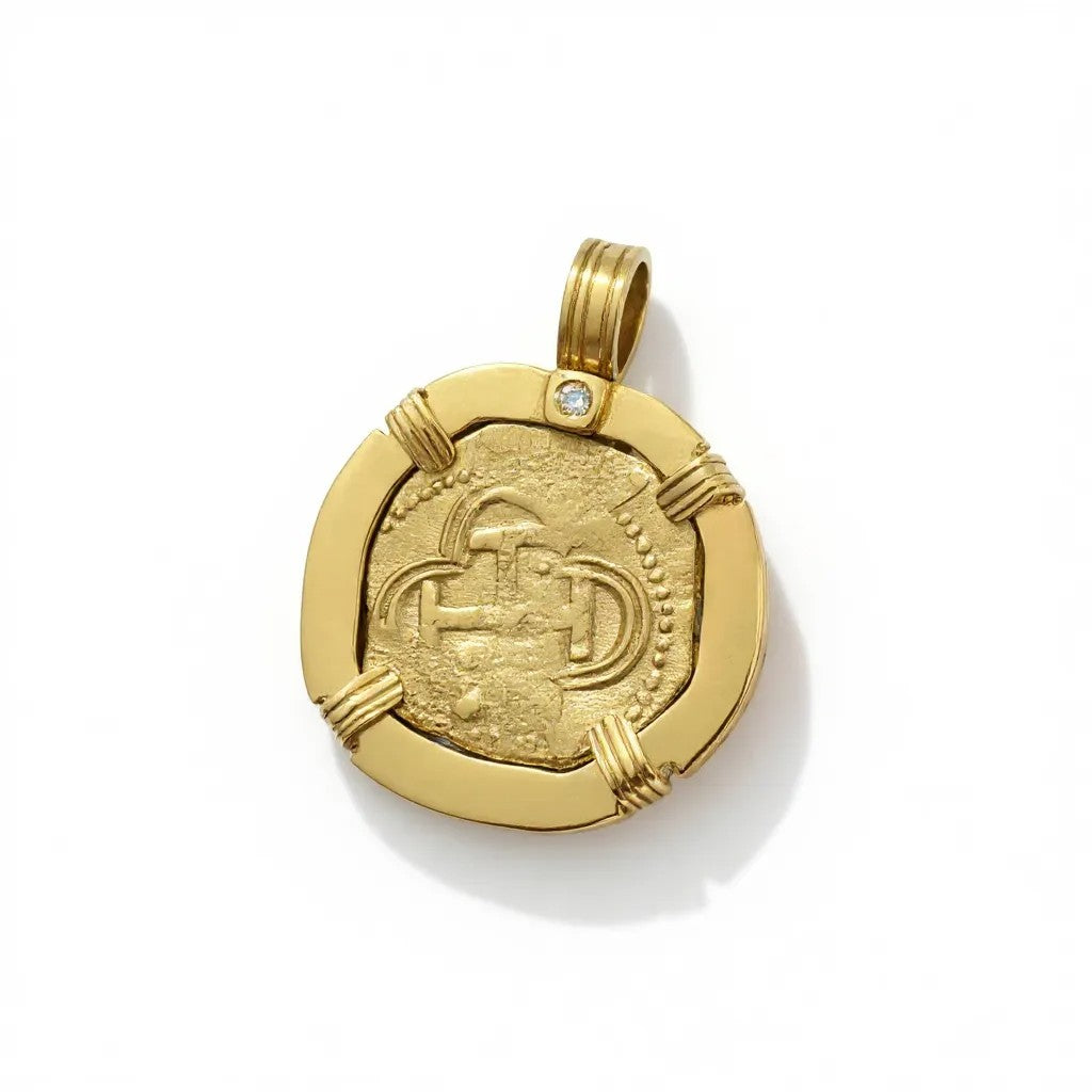 Denomination: 1 Reales Mint:Ā Potosi Mount:Ā Sterling Silver with 18K Bezel Date: Not Visible Reign: Philip III Assayer:Ā Not Visible Description: Private collection Spanish cob. Reign of Philip...