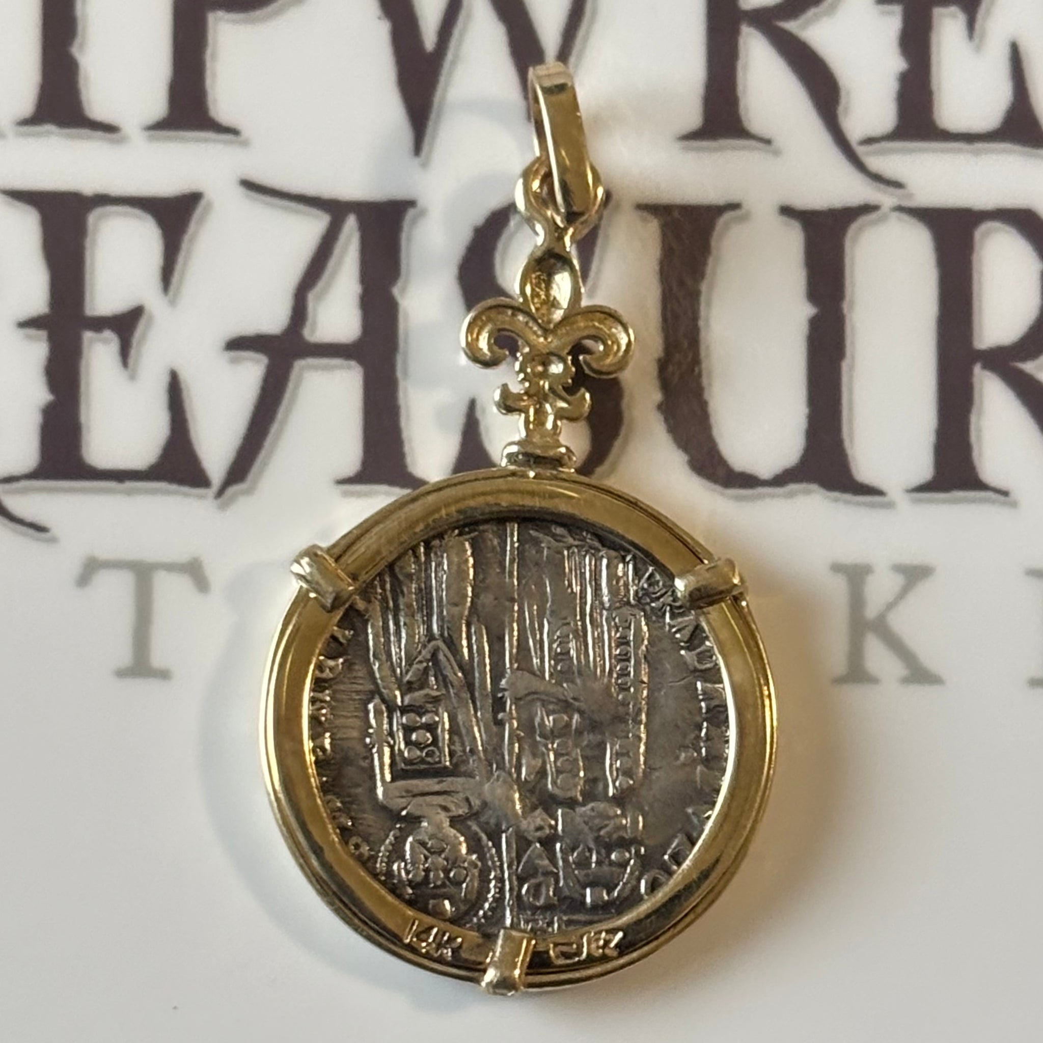 Denomination: Silver "Indian" weight drachm. Date: Circa 174-165 BCE Weight: 2.38 gm., Dim: 15 x 16 mm Mount: 14K gold Description: Obverse: Elephant walking right,...