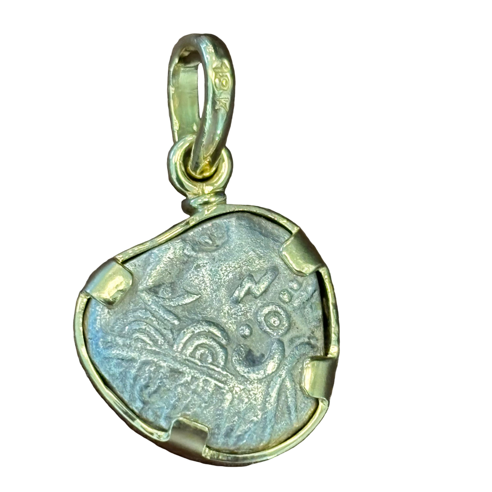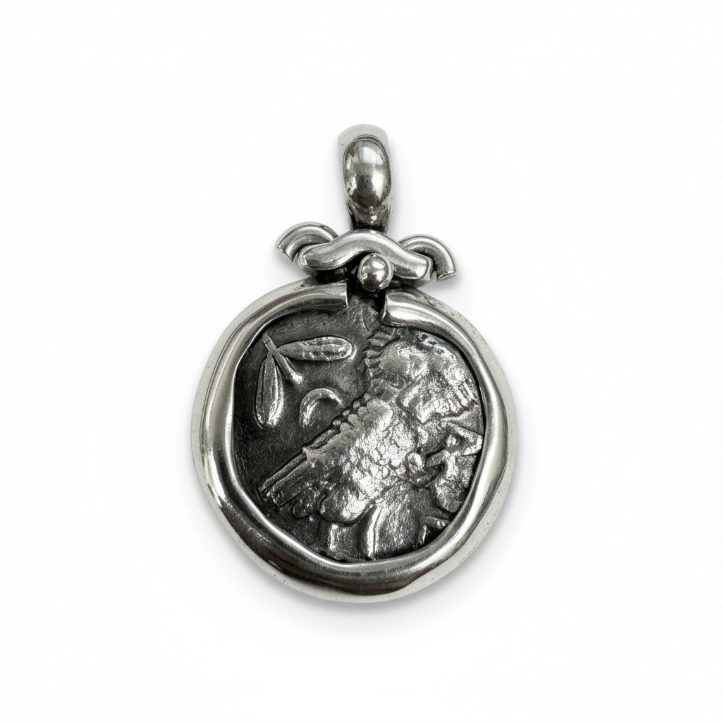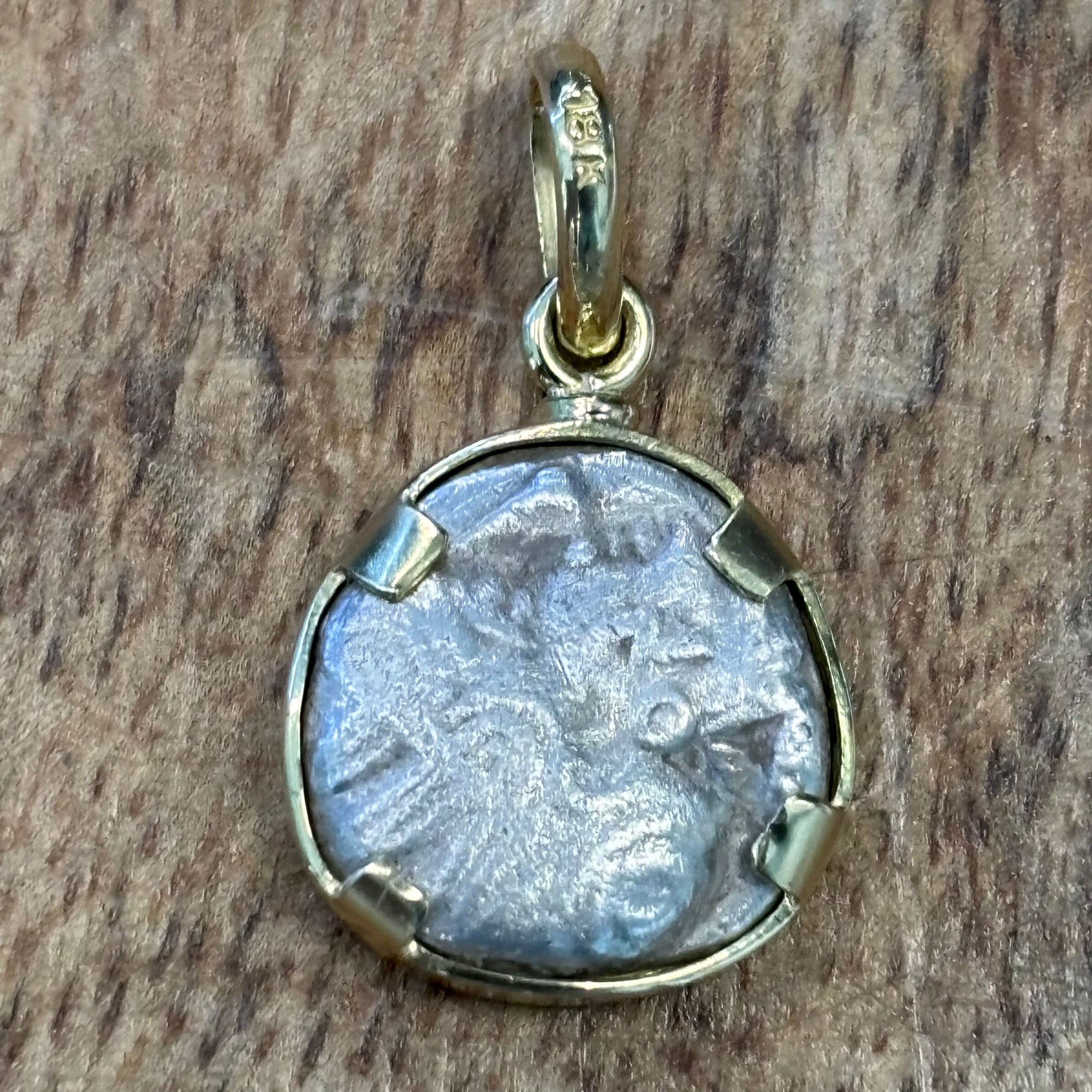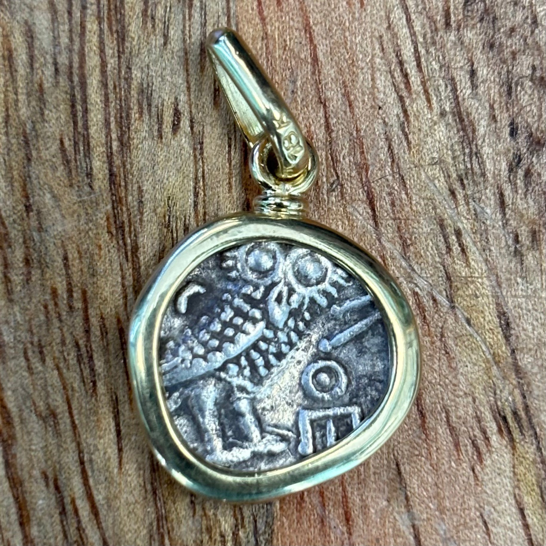 Denomination: AR Tetradrachm Mint: Egypt Mount: Sterling silver with 14K gold prongs embedded with rubies and 14K gold bale Date: Circa 440-400 BCE...