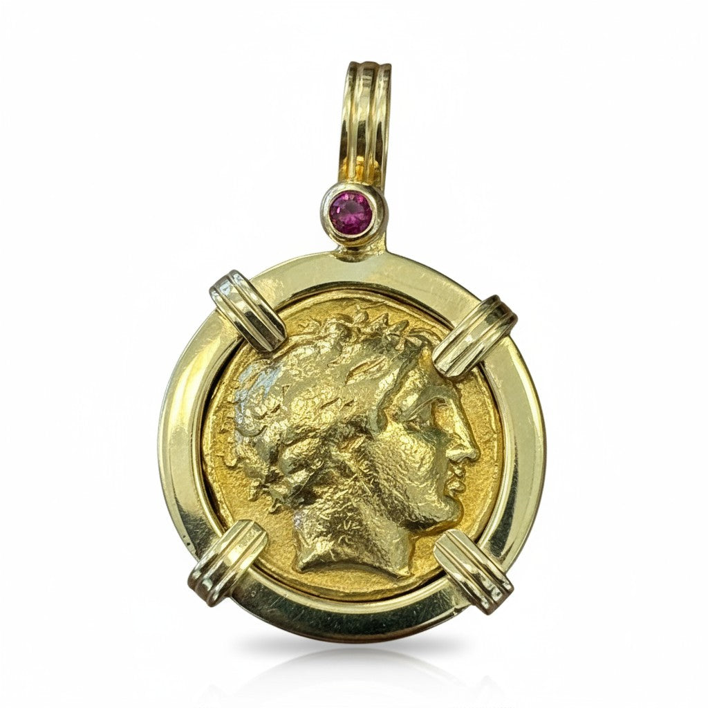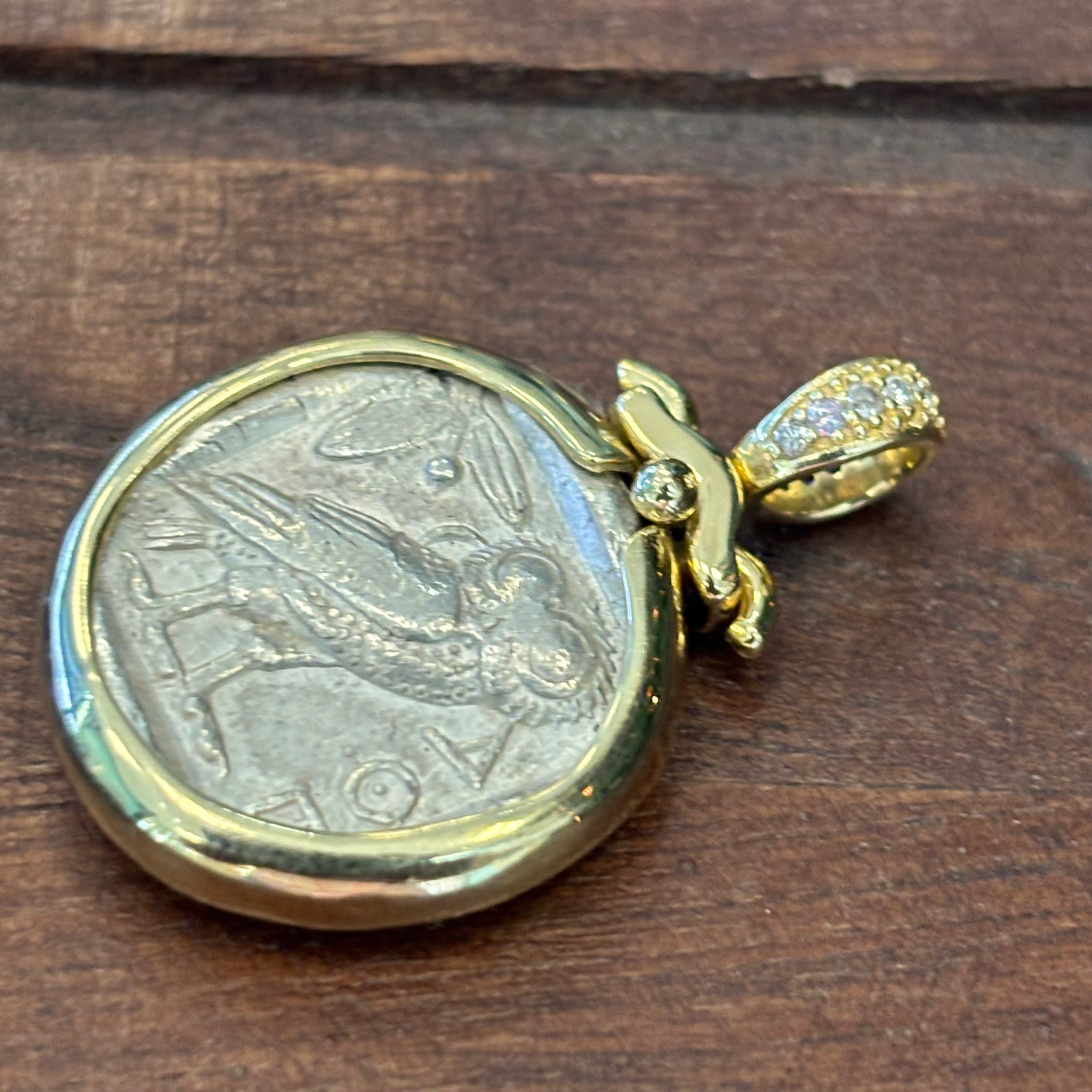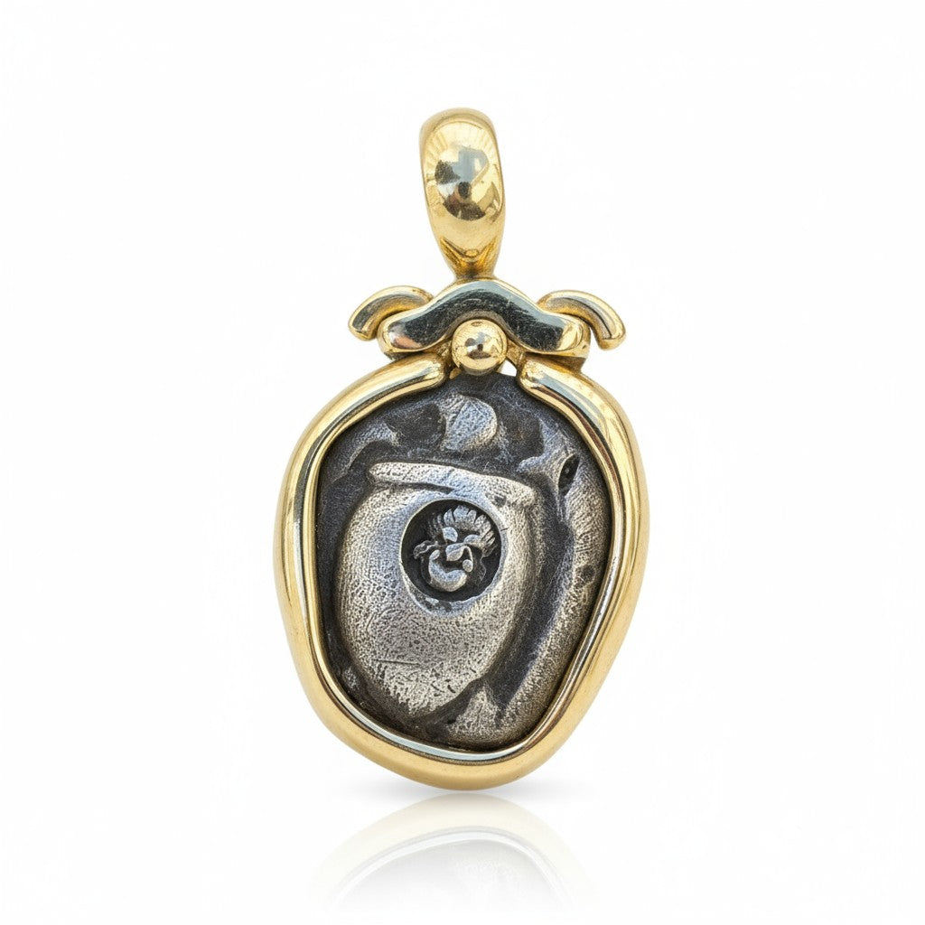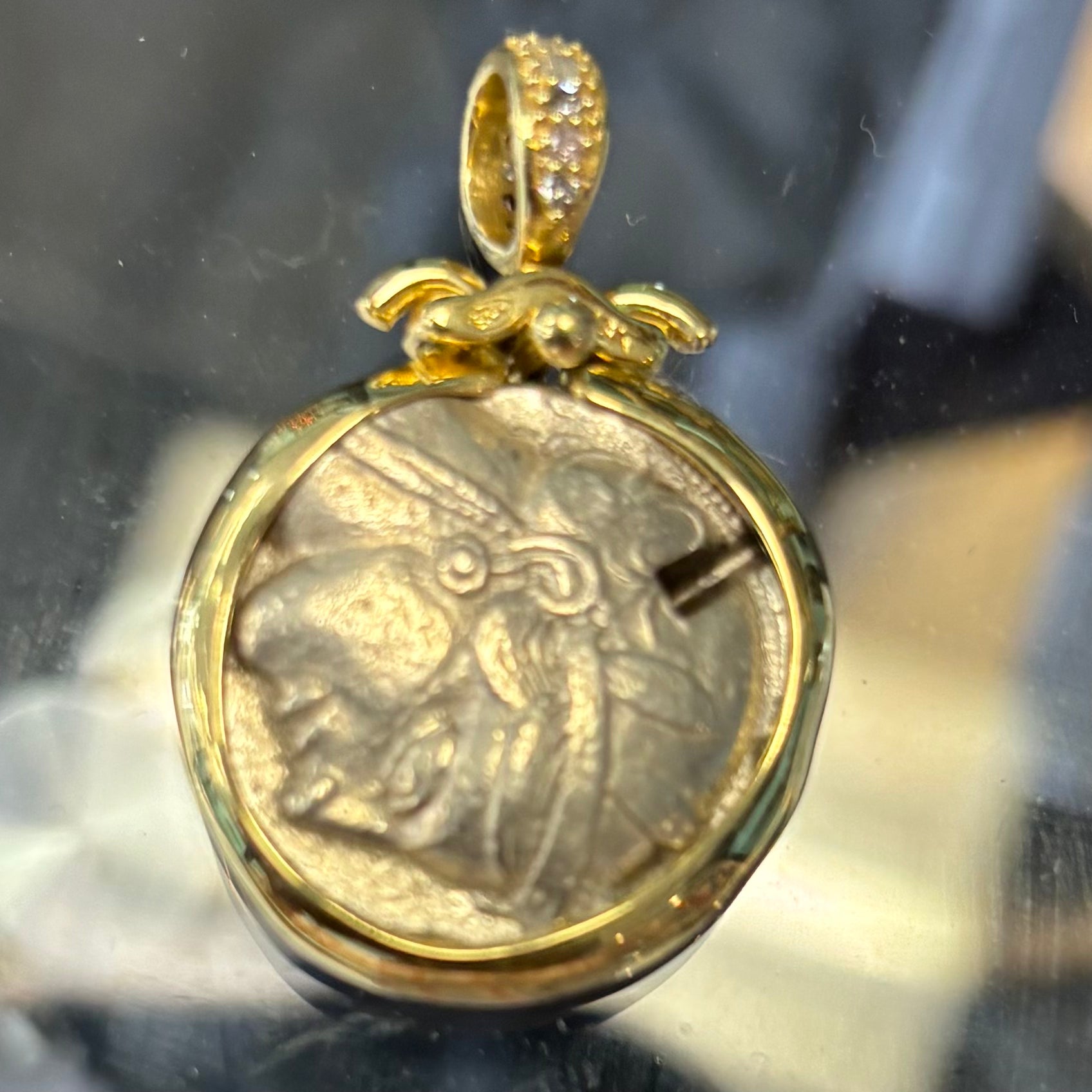 Denomination: AR Tetradrachm Mint: Egypt Mount: Sterling silver with 14K gold prongs embedded with rubies and 14K gold bale Date: Circa 440-400 BCE...