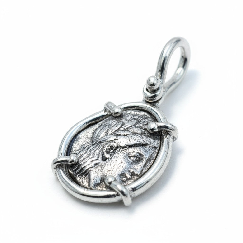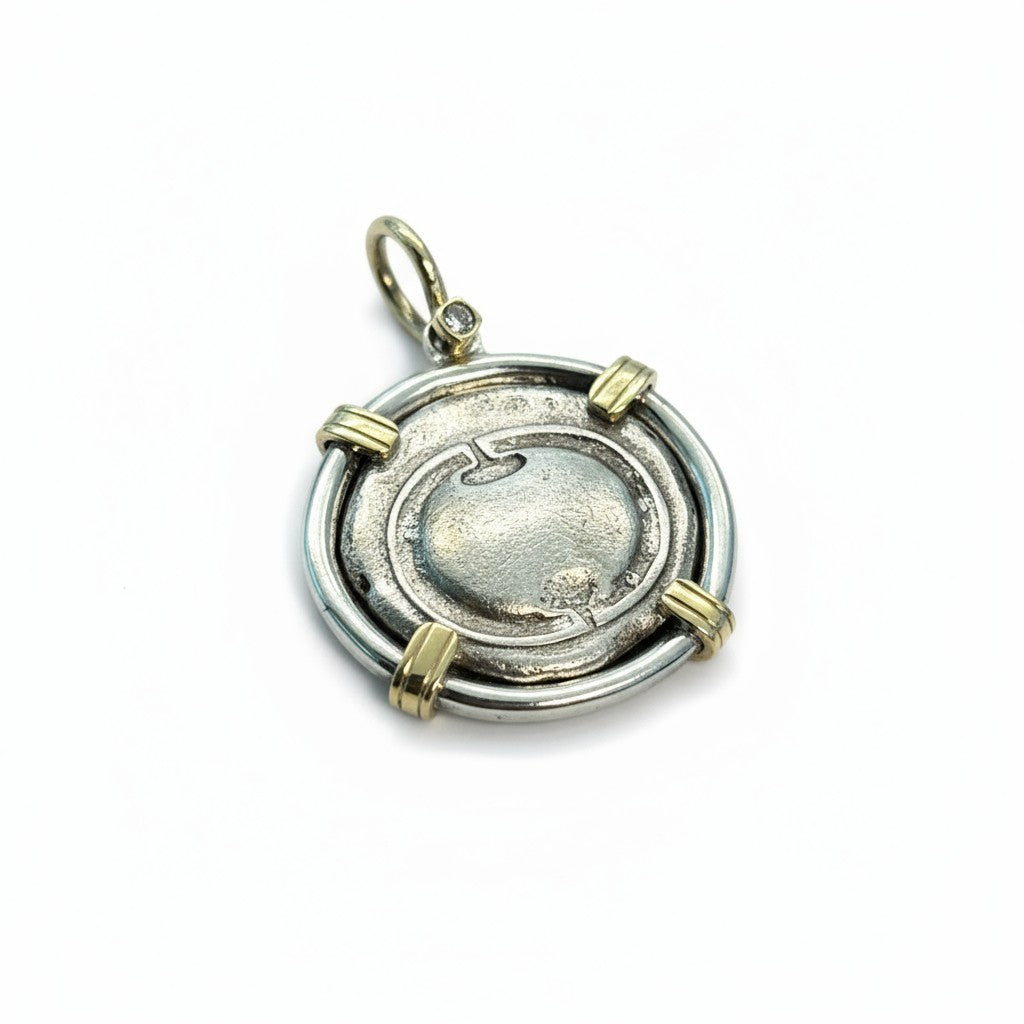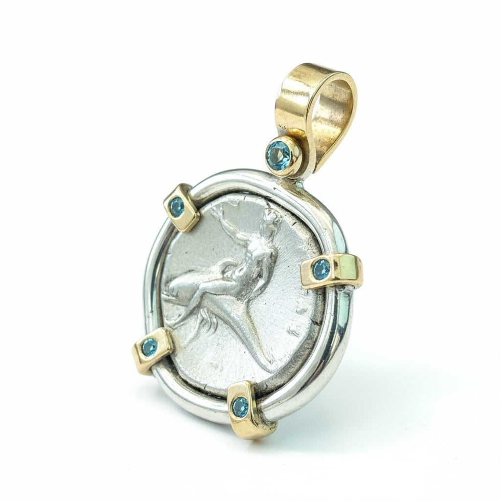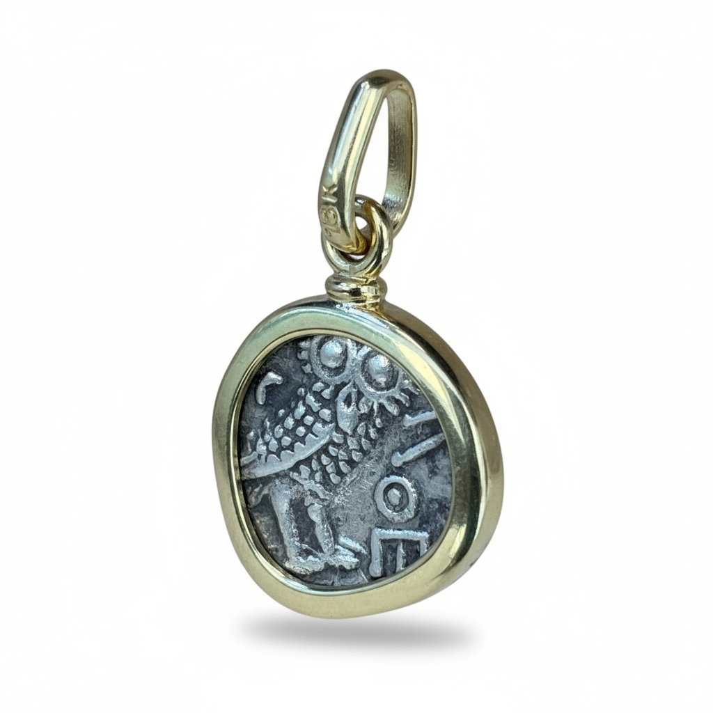 Denomination: AR Tetradrachm Mint: Egypt Mount: Sterling silver with 14K gold prongs embedded with rubies and 14K gold bale Date: Circa 440-400 BCE...
