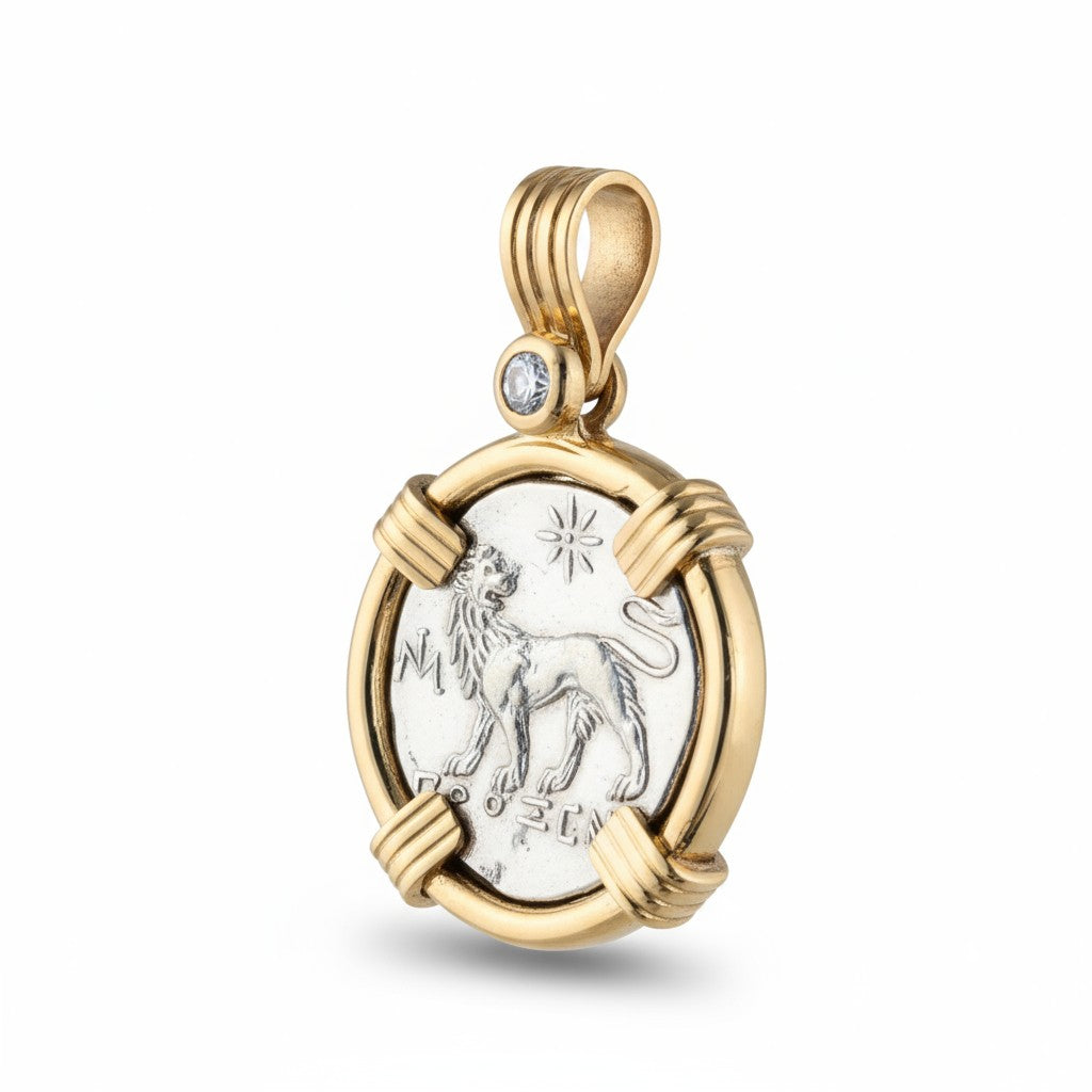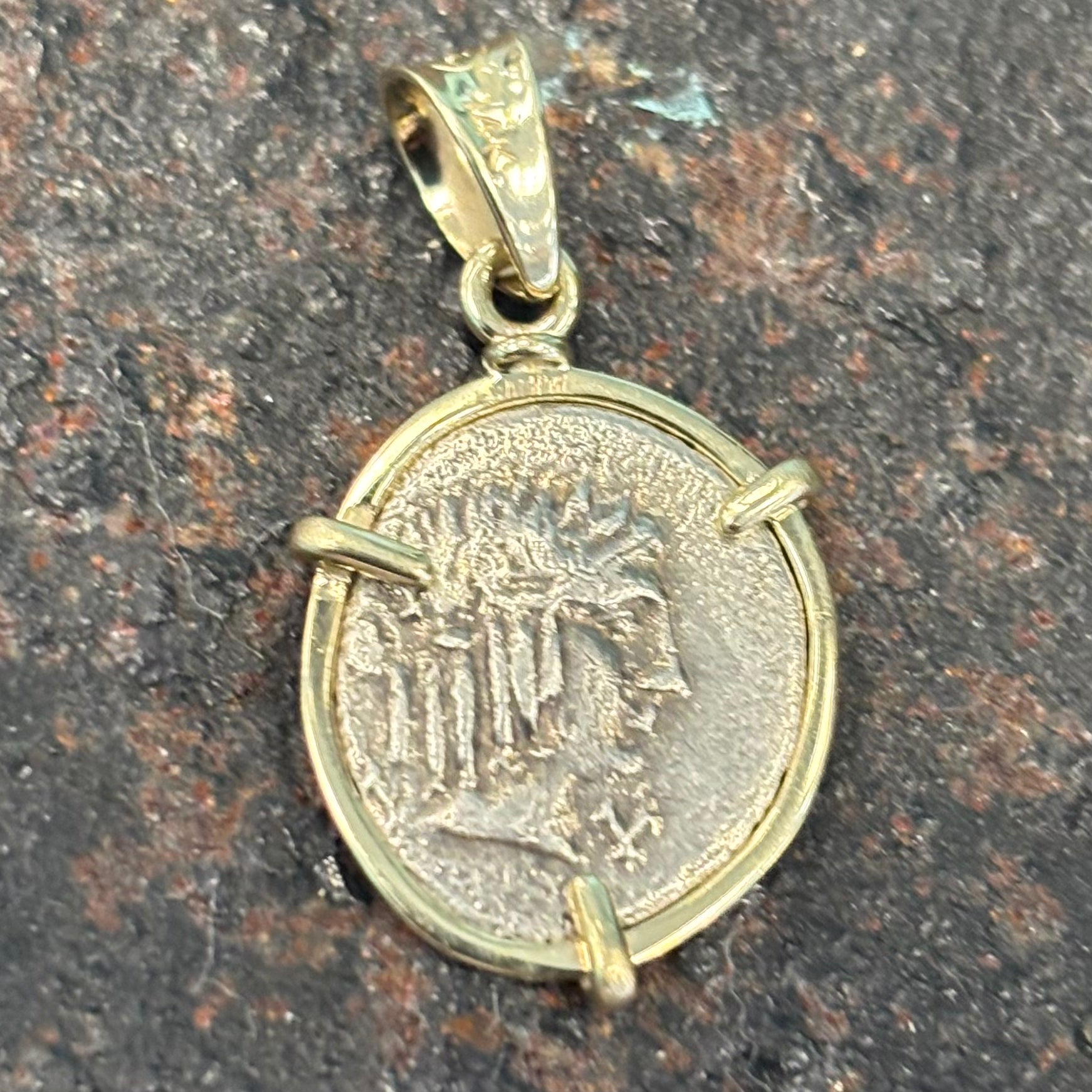 Denomination: AR Tetradrachma Date: Circa: 95 BCE Mint: Tyre Mount: 18K gold Description: Shekle of Tyre. Obverse: Laureate head of beardless Melkarth. Reverse: Eagle standing on the...