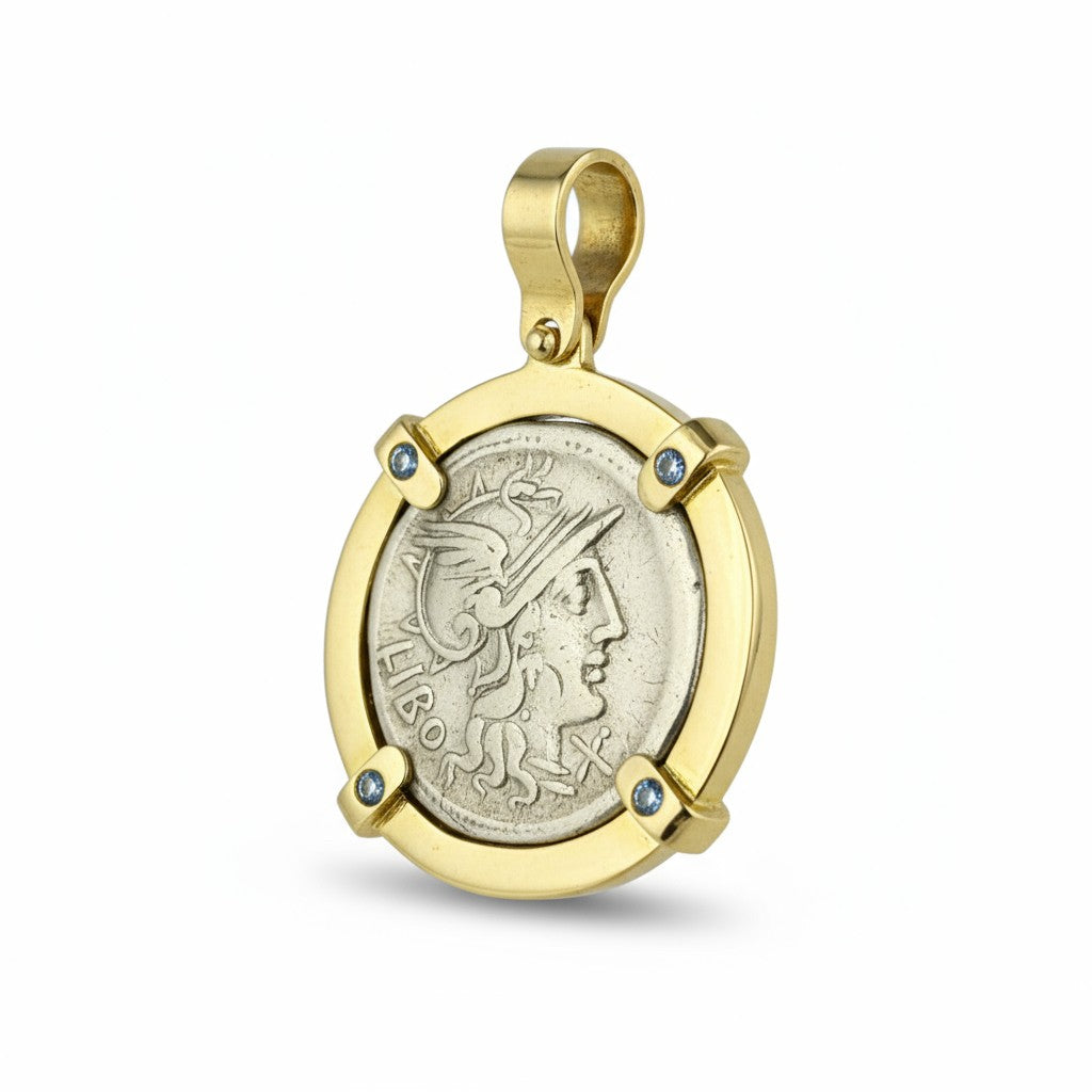 Denomination: AR Denarius Mint: Rome Weight: 3.71 gm (18 mm) Date: 148 BC Mount: 14K gold with Sapphire accent on all four prongs Grade: Choice...