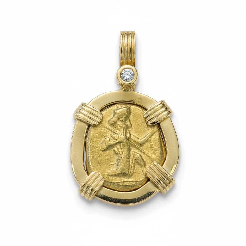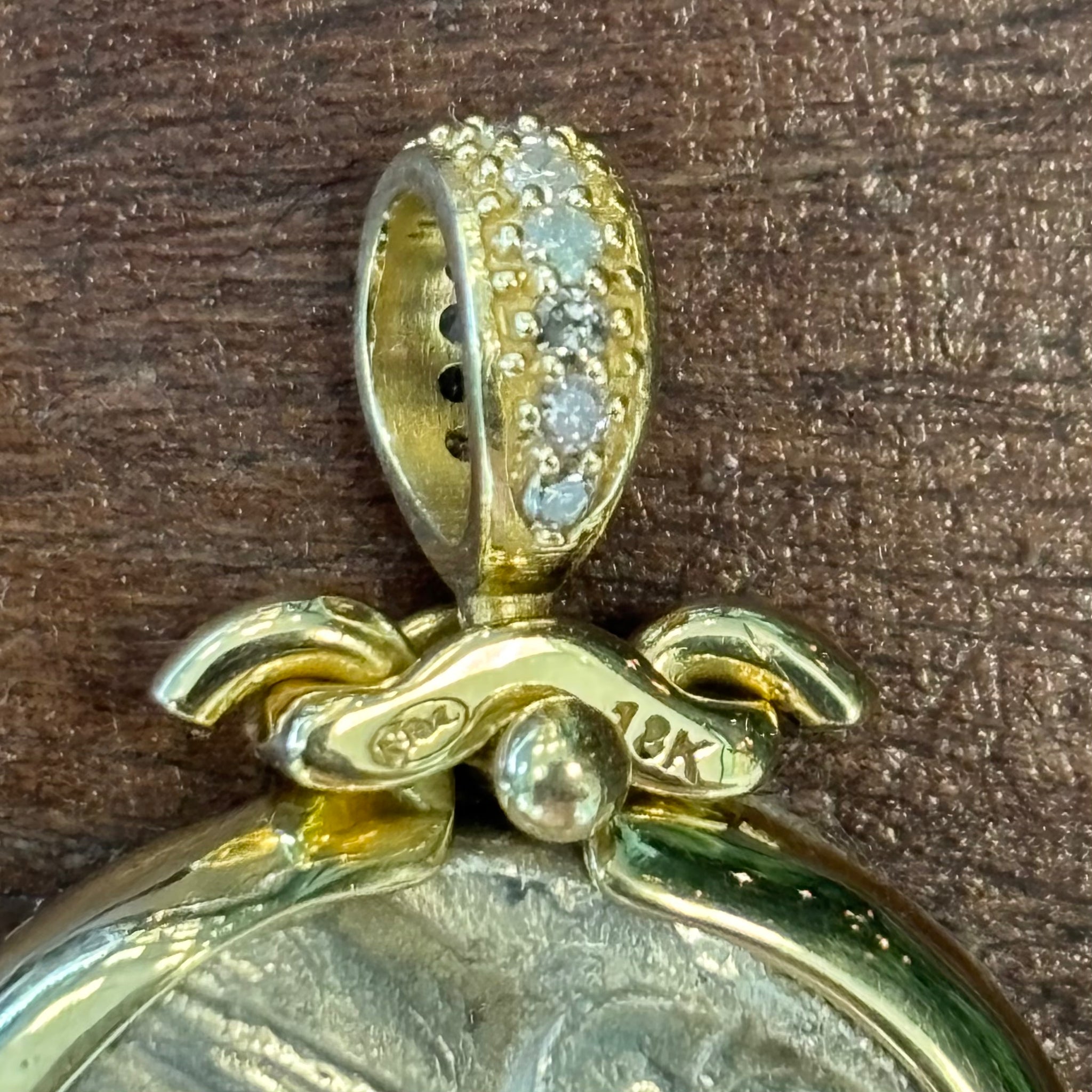 Denomination: AR Stater Mint: Lucania. Metapontum Date: Circa 470-440 BC Mount: 14K gold with diamond accents on the bale. Grade: NGC 4327610-018. XF Description: LUCANIA. Metapontum. Ca. 470-440...