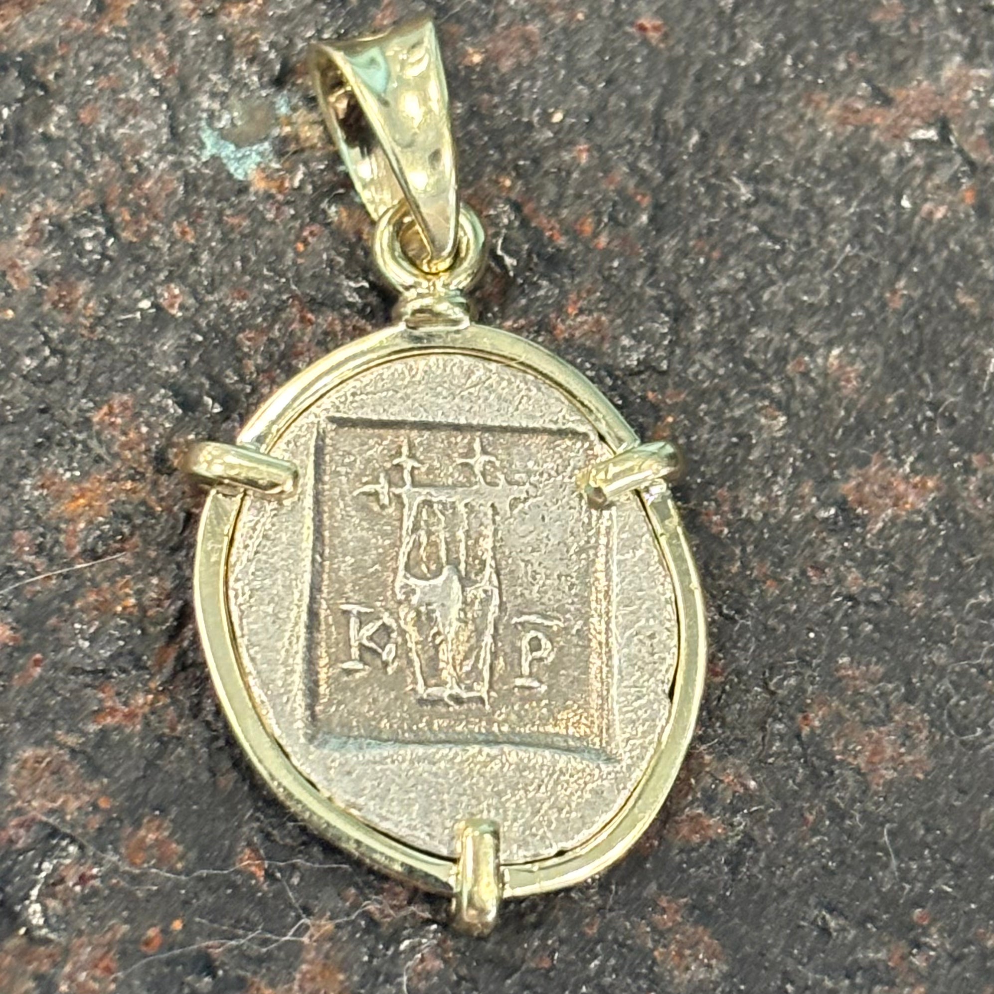Denomination: Bar Kochba, 24-26mm. Bronze. Date: Circa 133-134 CE Mount: 14K gold Description: The 24-26mm. bronzes of Bar Kochba. Obverse: A grape vine...