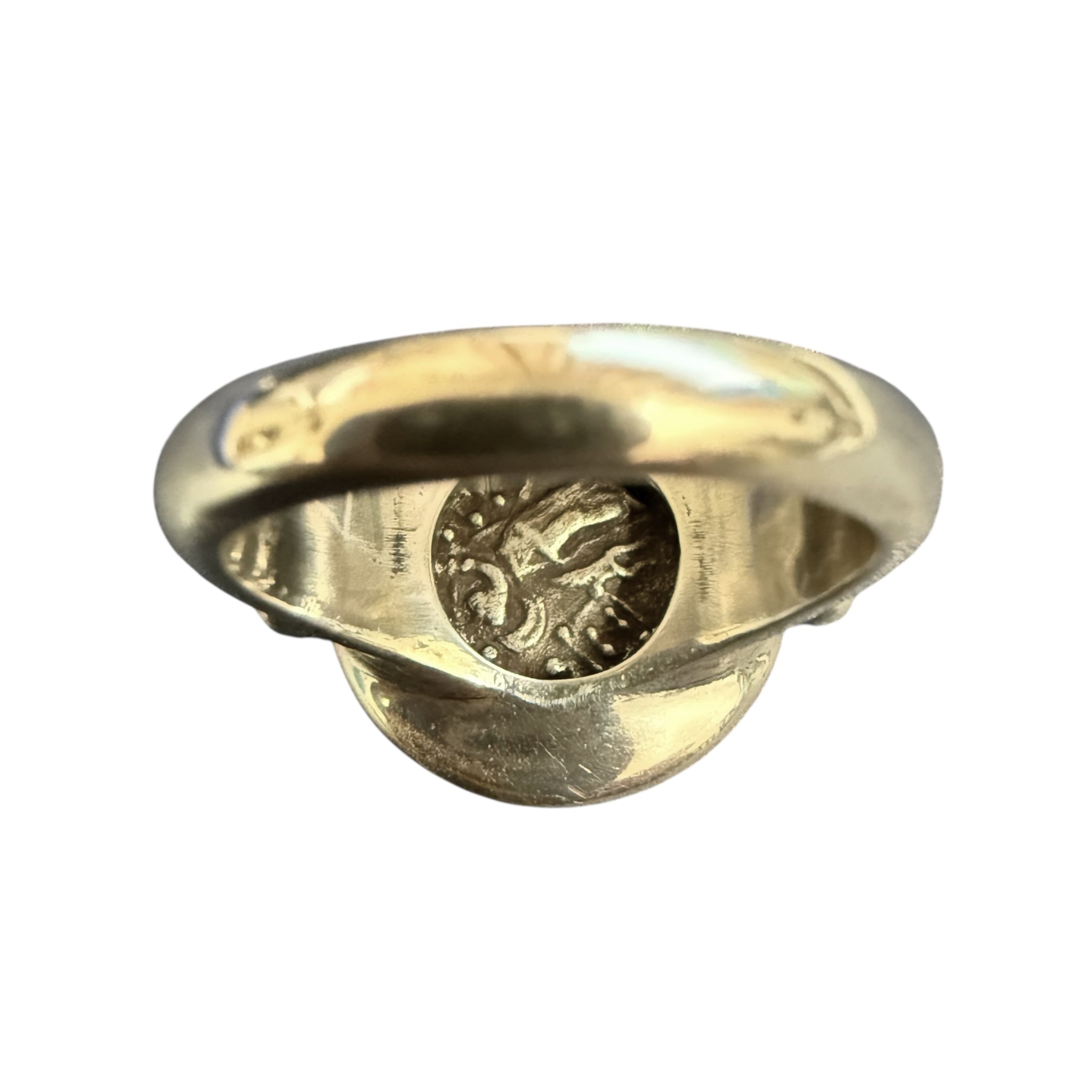 The languages of the Scythian people are all considered extinct, and very little has survived in the way of record. Translating Scythian inscriptions is near impossible for now, due to there being no definitively identified alphabet. Because Indo-Scythian coins were often inscribed with Greek on one side, we can decipher dates, the name of the king and occasionally other phrases. Unfortunately, on this coin, the letters are undecipherable.