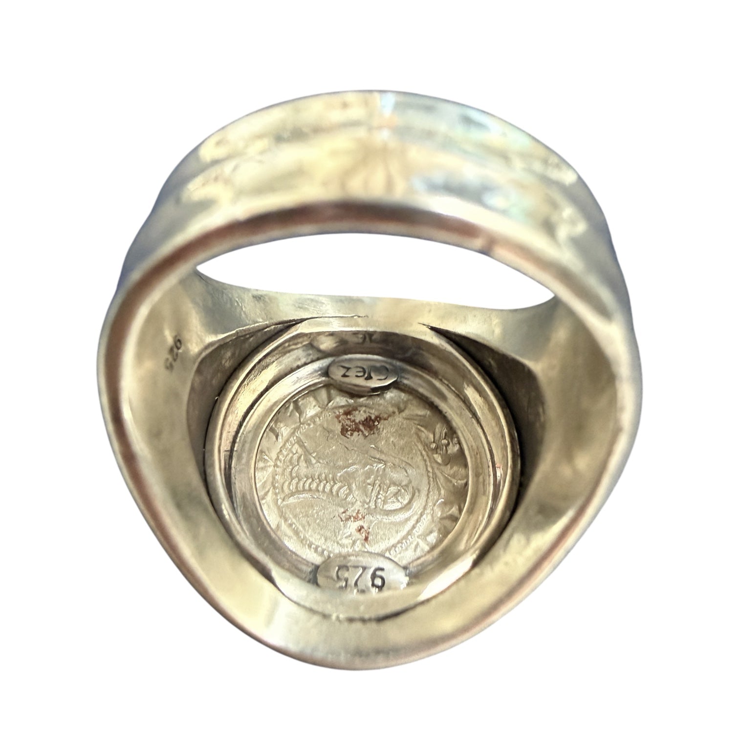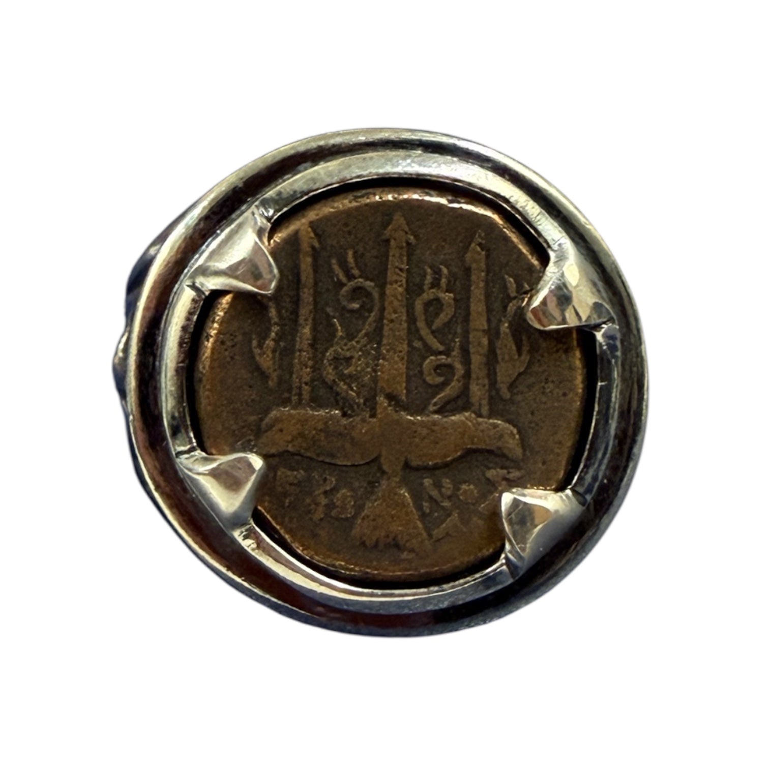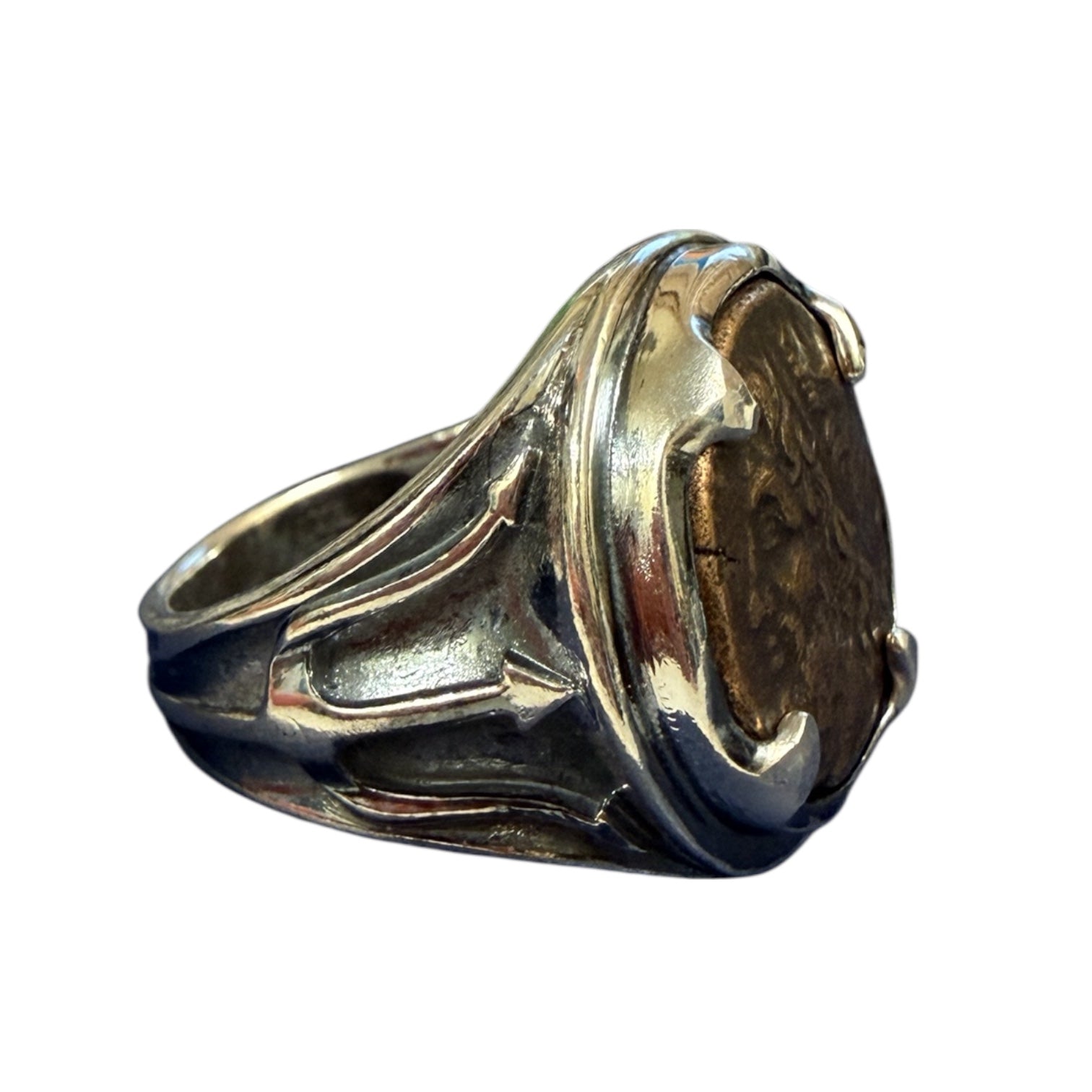 Denomination: AE Bronze Date: Circa 200-400 CE Mint: Rome Mount: Sterling Silver Ring History: The Roman Mint was established at the Temple of a Roman God Juno Moneta. The...