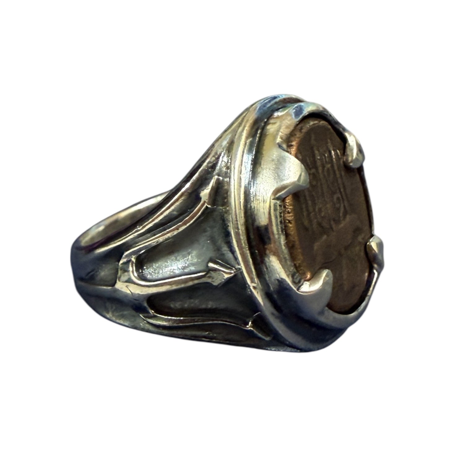 Denomination: AR Denier Date: 1163-1201 AReign:Bohemond III Mint: Antioch (Turkey) Mount: Sterling Silver Ring Description: Obverse: Helmeted bust left of knight wearing chainmail with crescent pointing up...