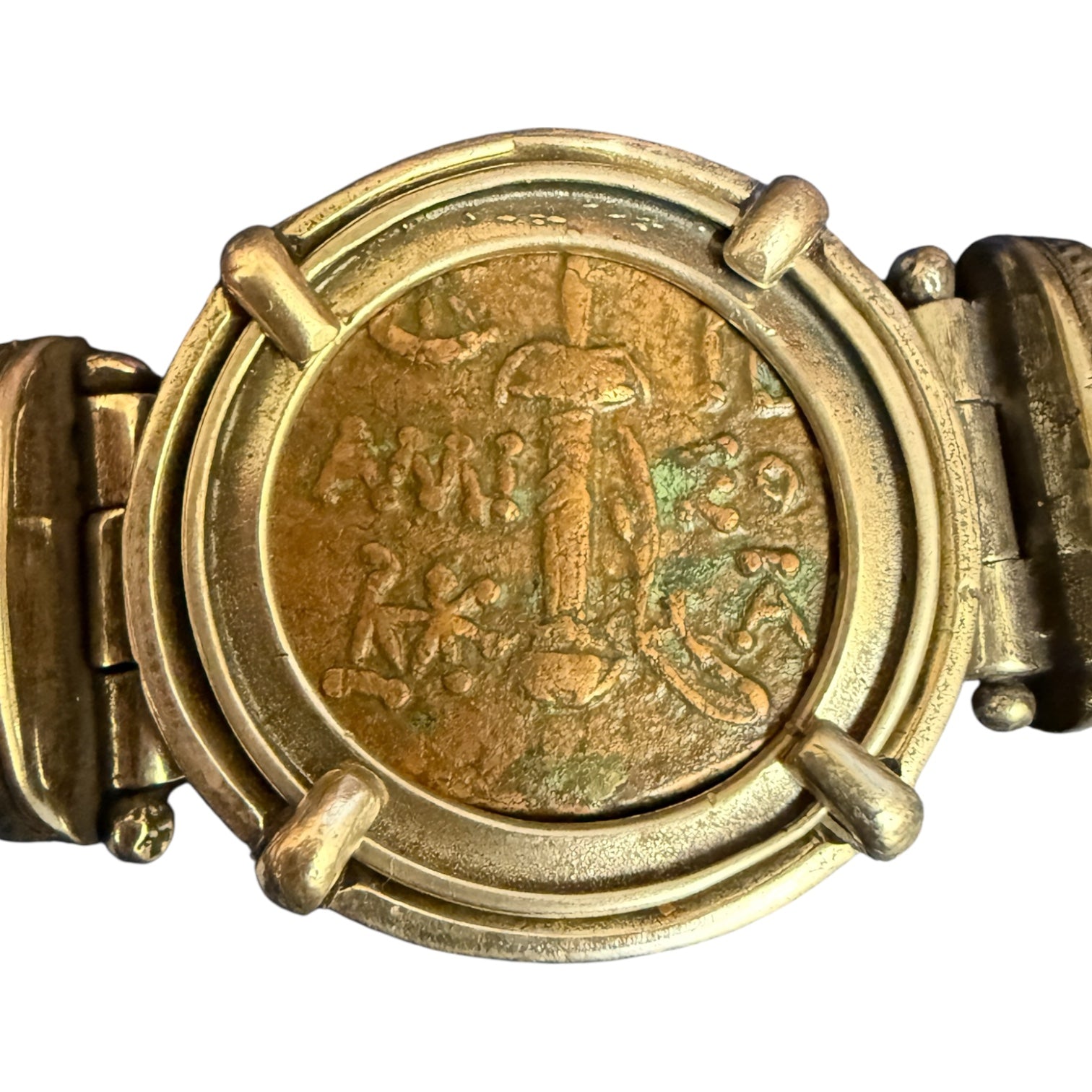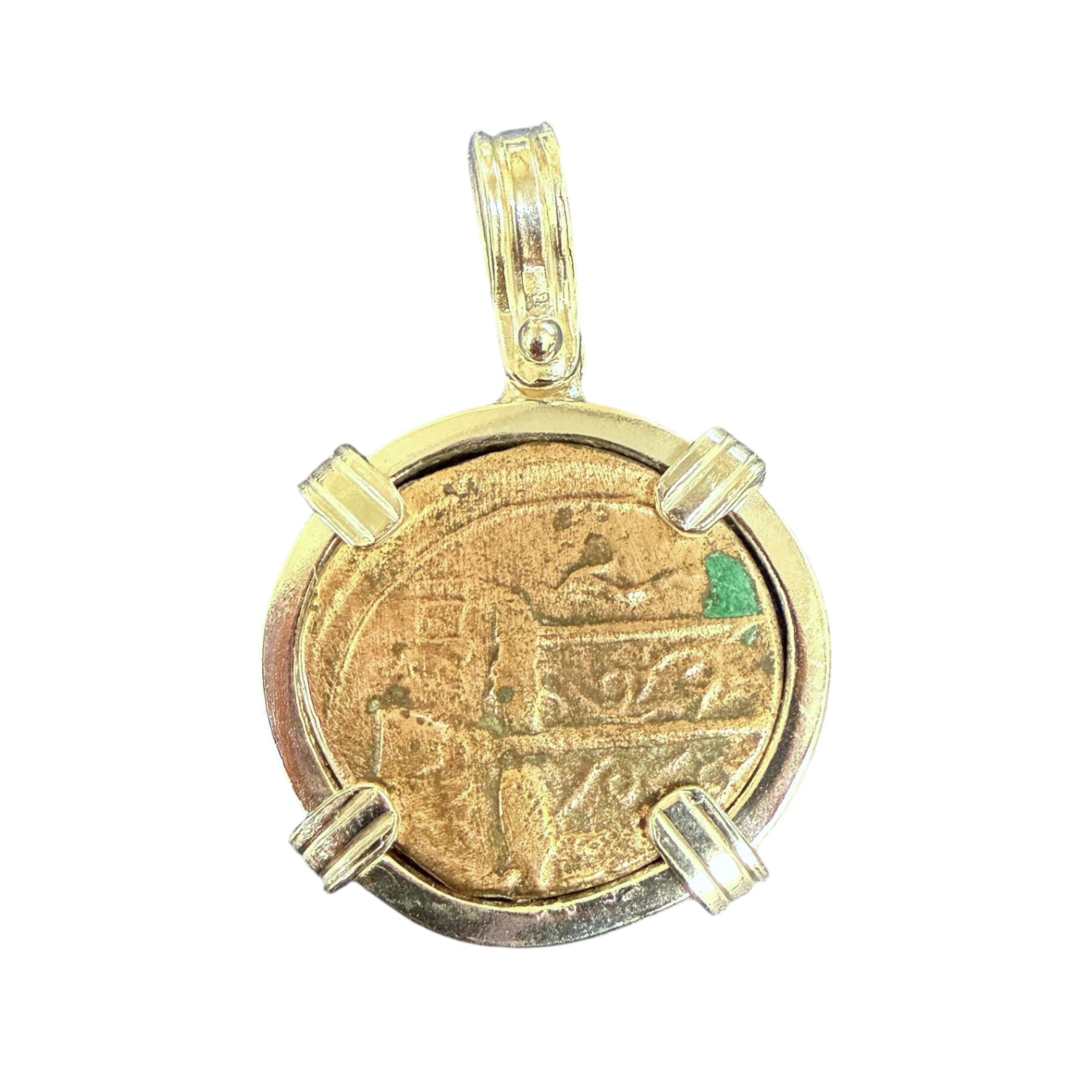 Mint: Seleucid Kingdom Denomination: Unknown Date: 138 – 129 BCE Composition: AE Bronze Weight: 4.84 gm Grade: Ungraded Mount: Sterling Silver w/ 14k Gold...