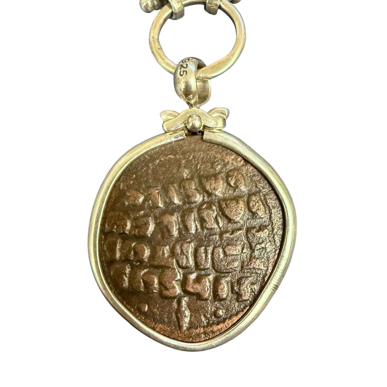 Mint: Seleucid Kingdom Denomination: Unknown Date: 138 – 129 BCE Composition: AE Bronze Weight: 4.84 gm Grade: Ungraded Mount: Sterling Silver with 14K gold...