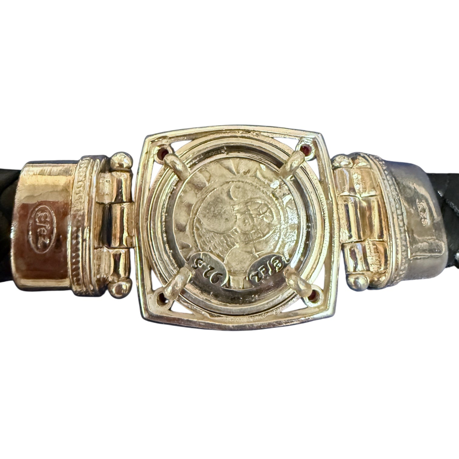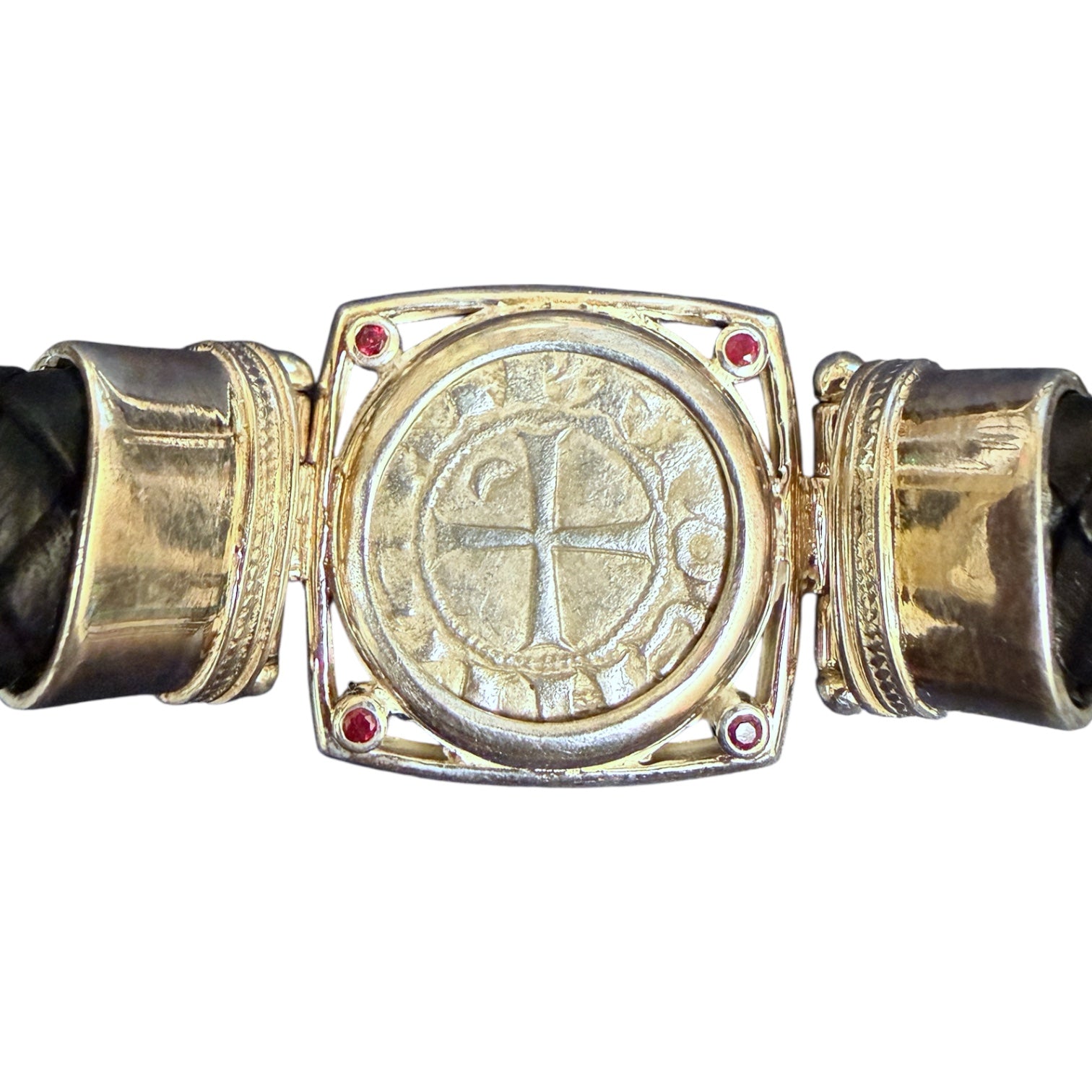 Denomination: Tornecello Date: Circa 1368-1423 CE Mint: Venice Mount: Sterling Silver Mount on Leather Bracelet Description: Obverse: Cross of the denier tournois and the...