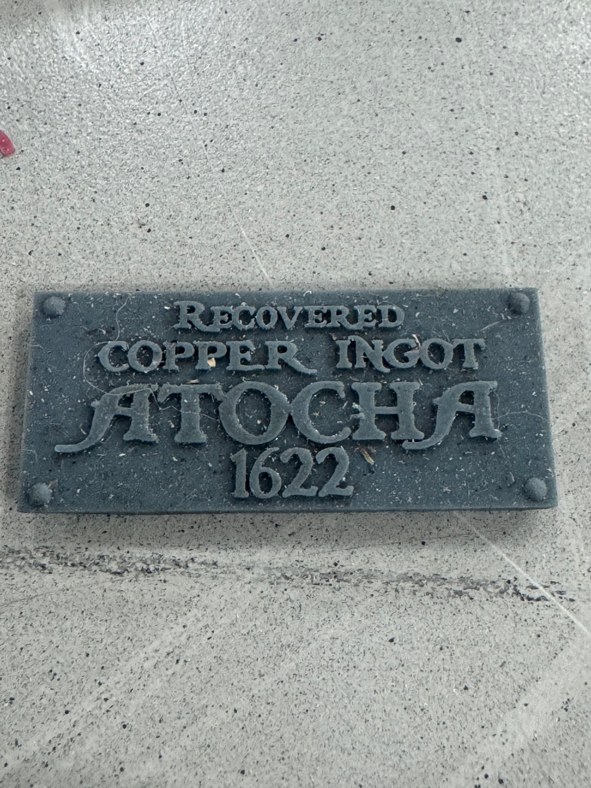 MATERIAL: Atocha Copper WEIGHT:  384  Grams SIZE: Height: 2.50"     Length: 7.75"    Thickness: 0.25" Note: Engraved with "Nuestra Señora de Atocha - 1622 -...
