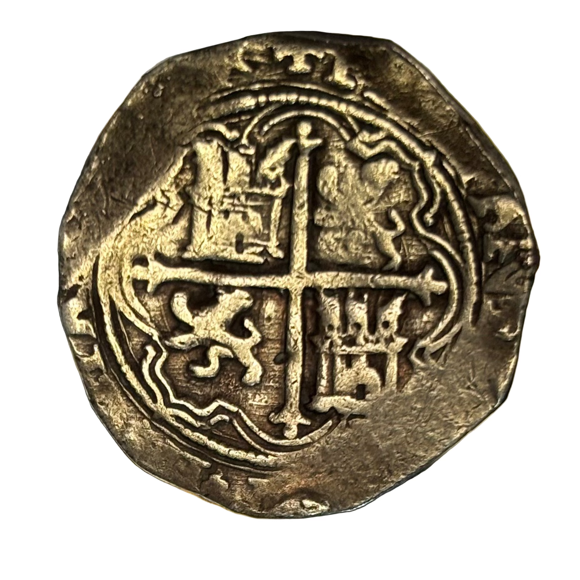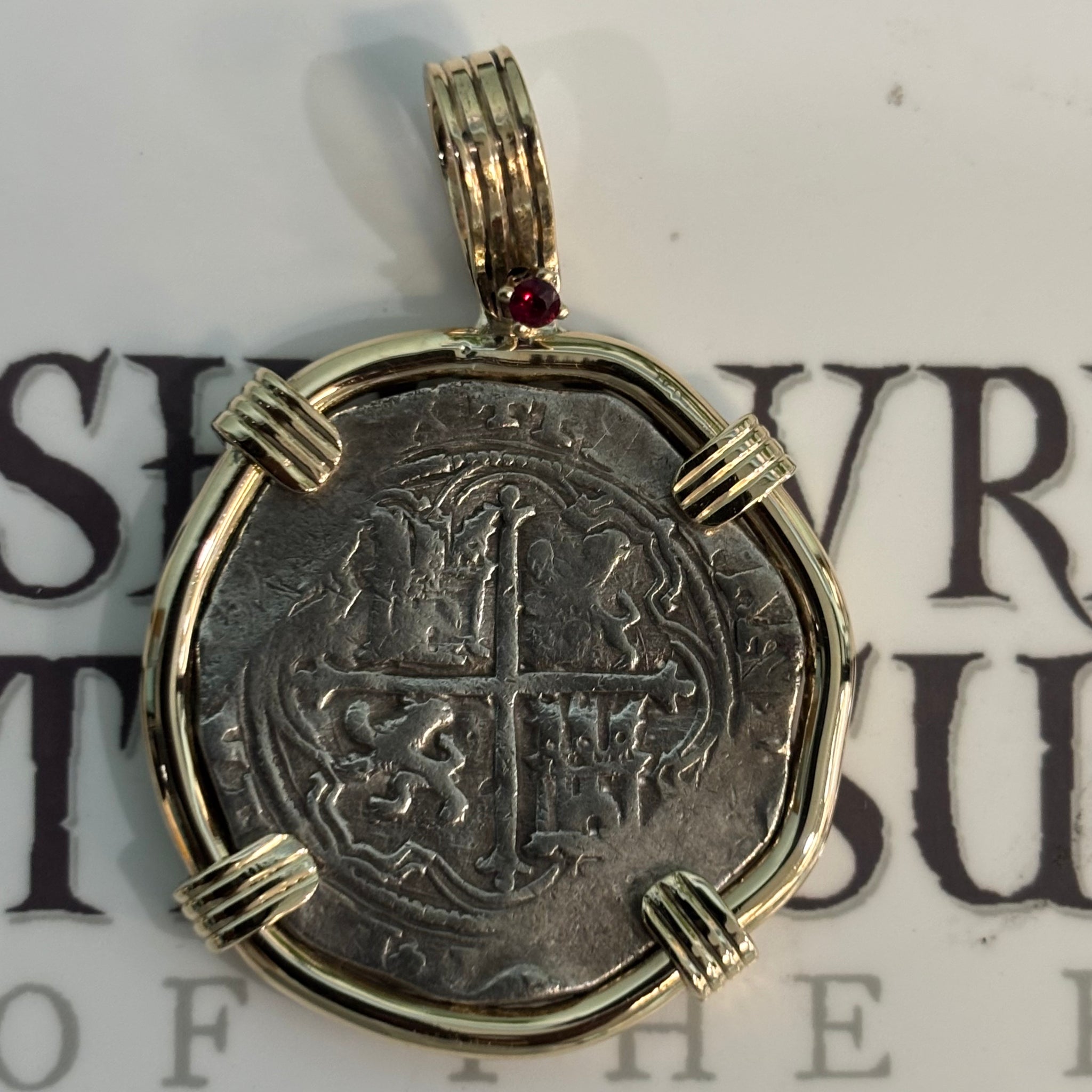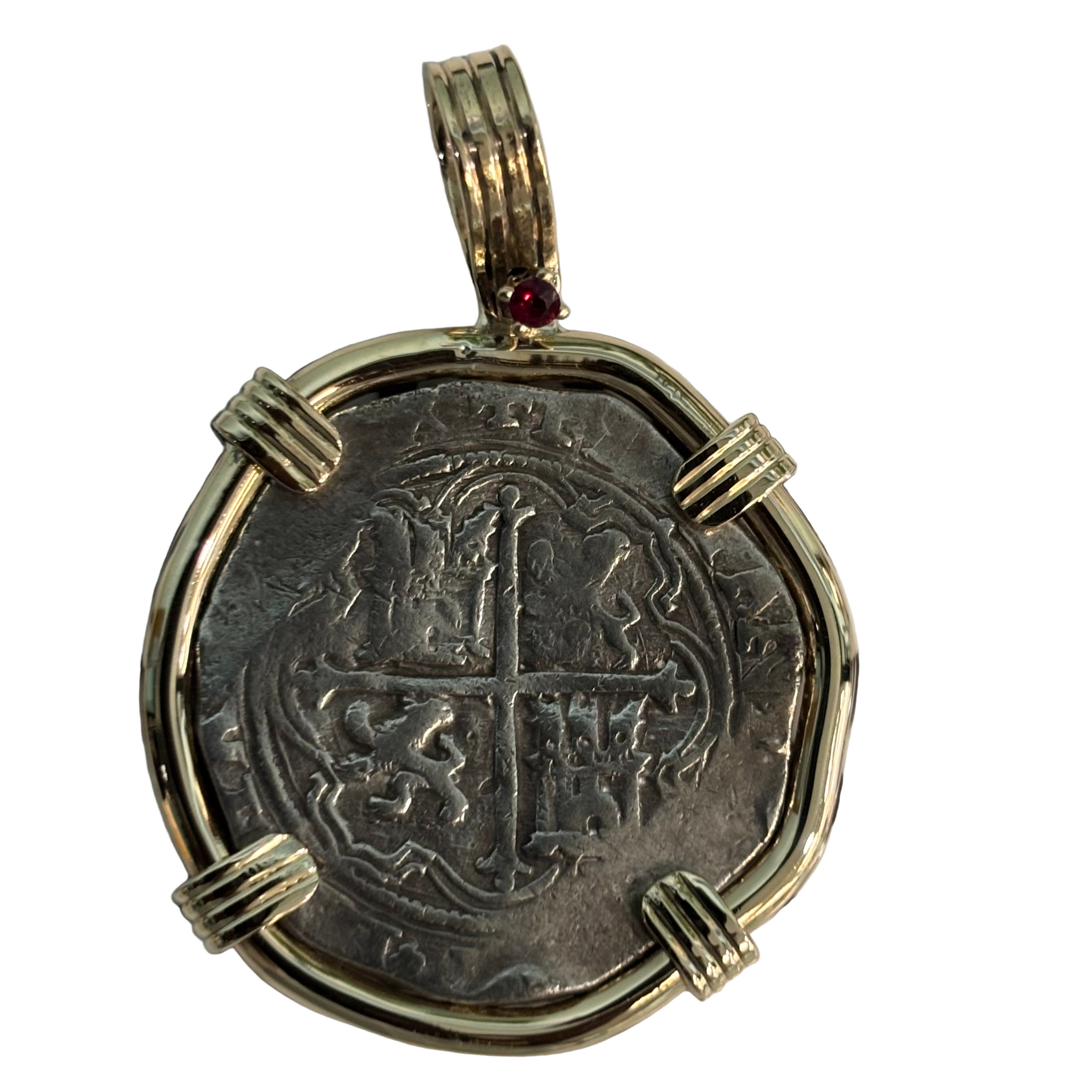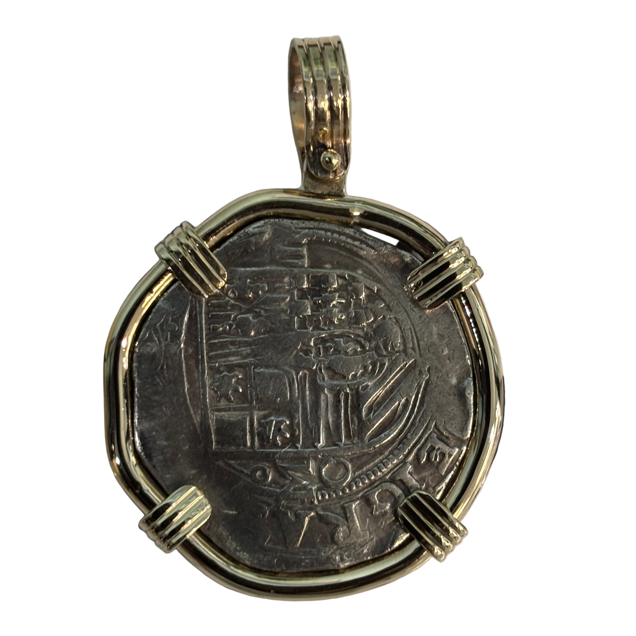 Denomination: 8 Reales Date: Circa 1589-1598 Assayer: Not Visible Reign: Philip Mount: Sterling Silver with 18k Gold Prongs & Bale Mint: Seville Description: Obverse: Crowned shield of the...