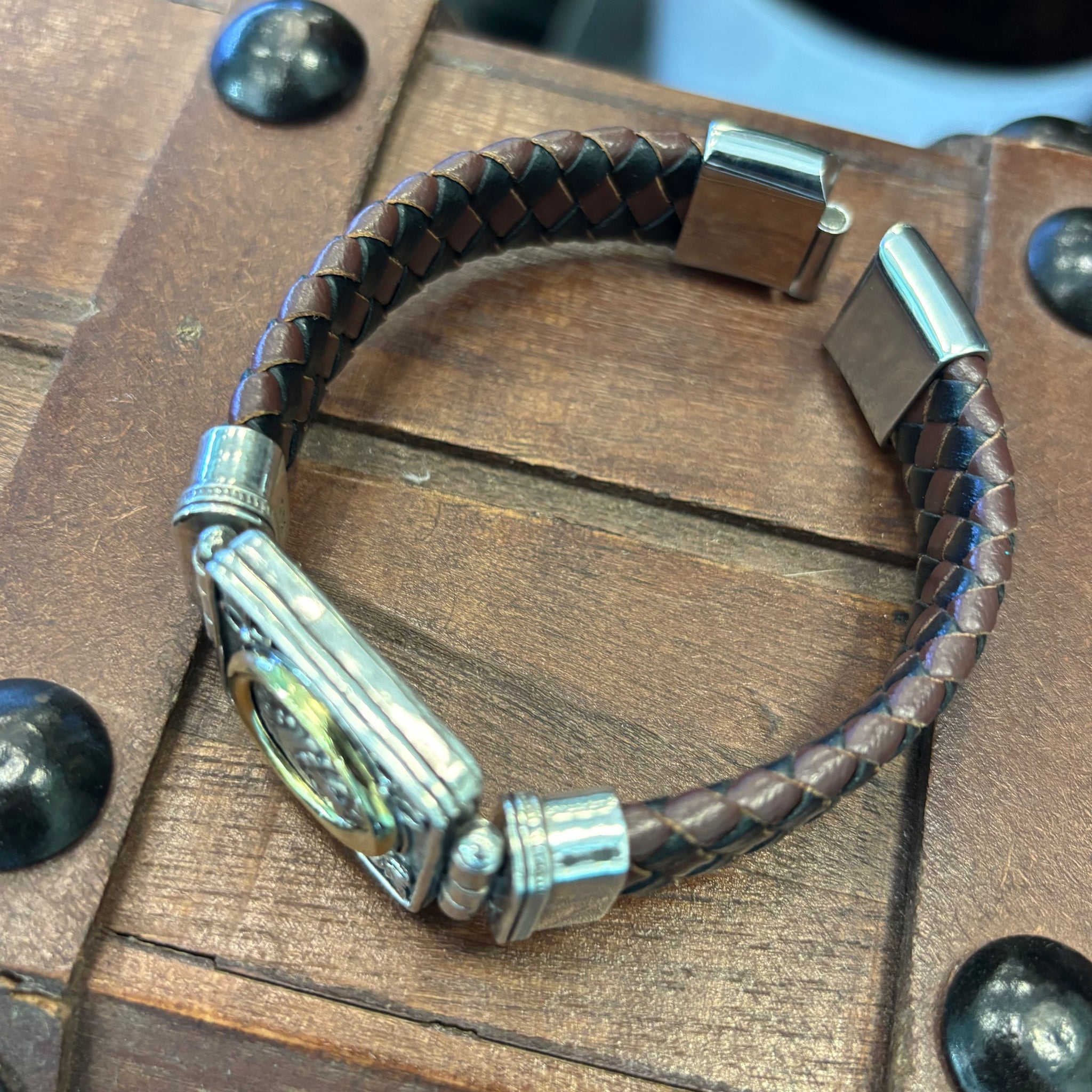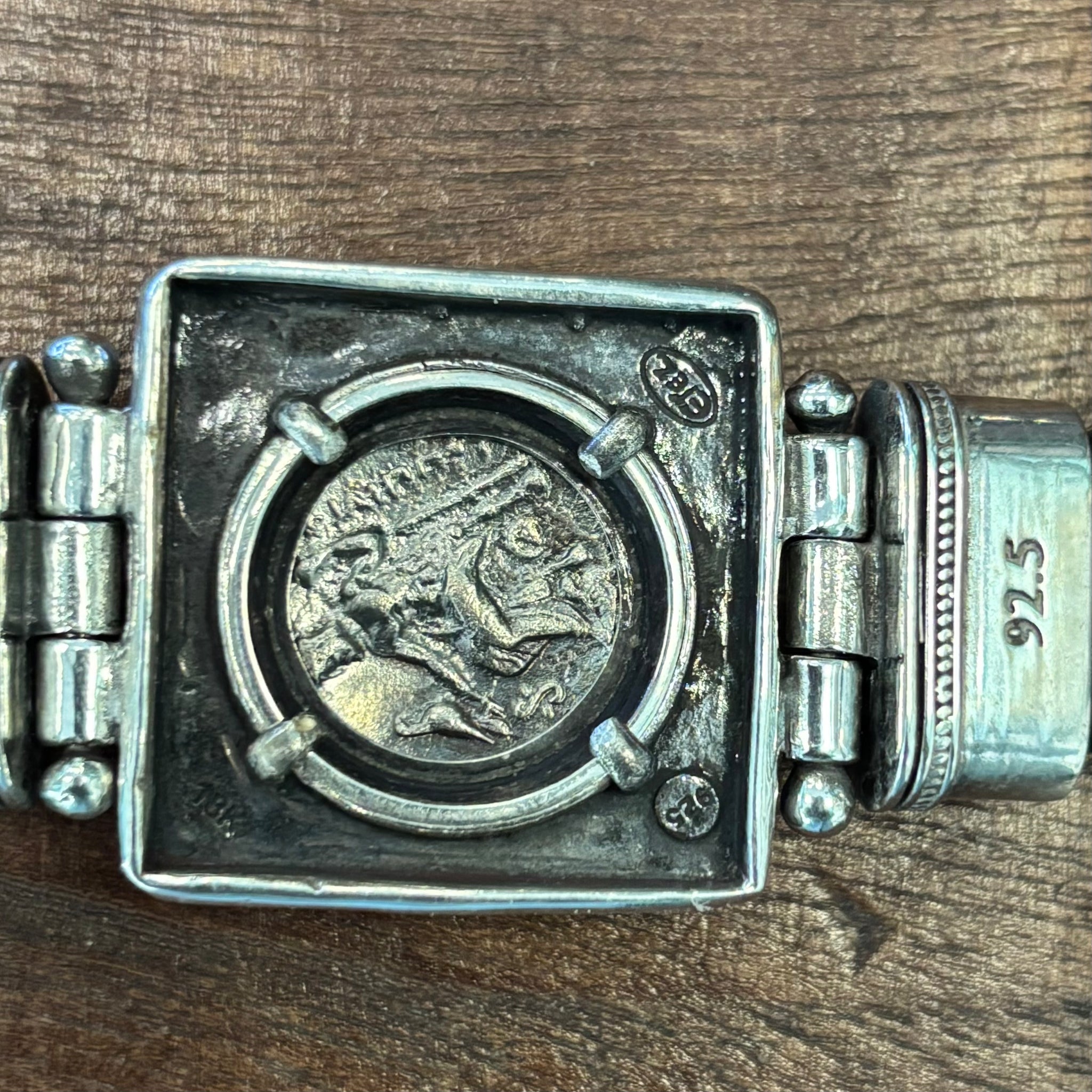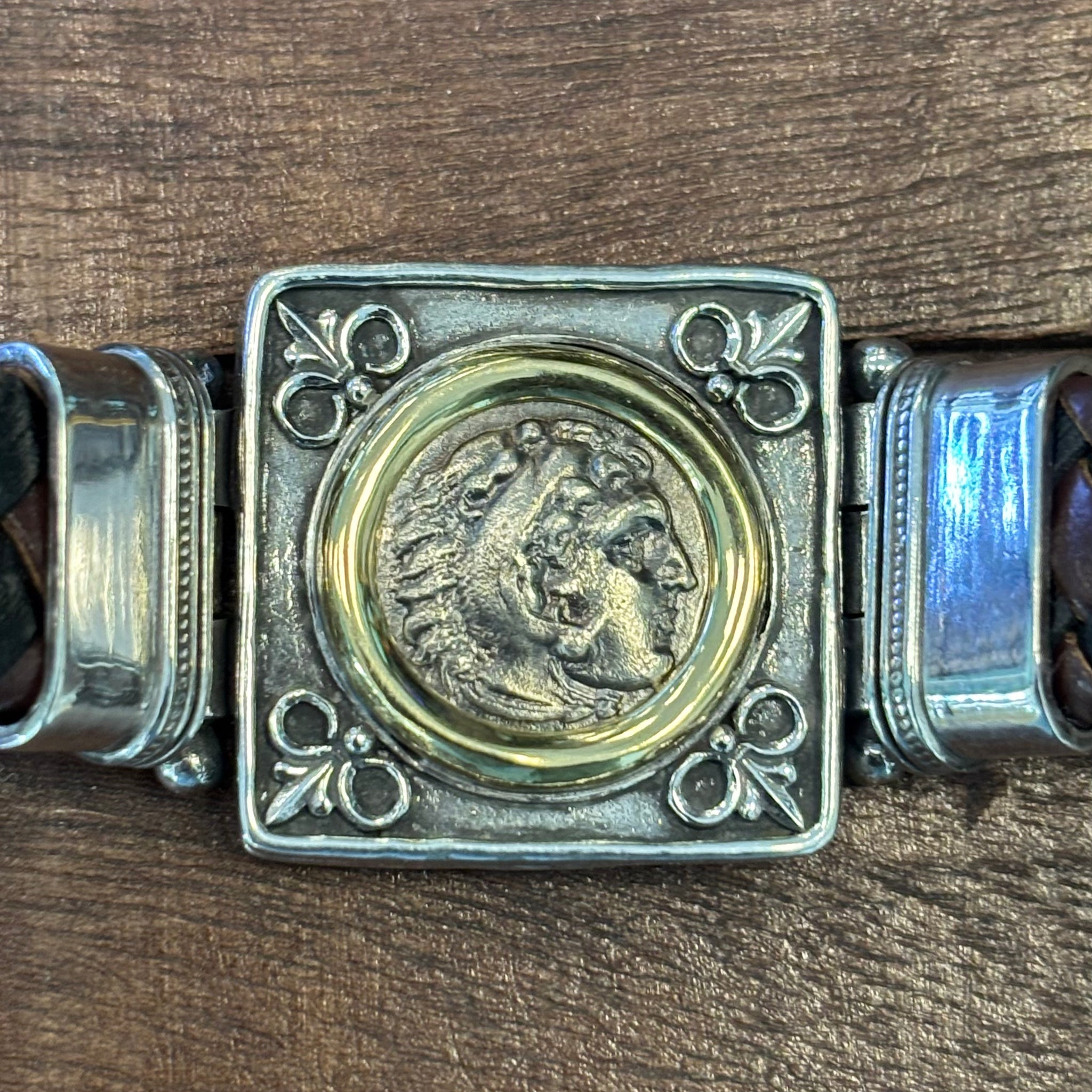 Denomination: Tornecello Date: Circa 1368-1423 CE Mint: Venice Mount: Sterling Silver Mount on Leather Bracelet Description: Obverse: Cross of the denier tournois and the...