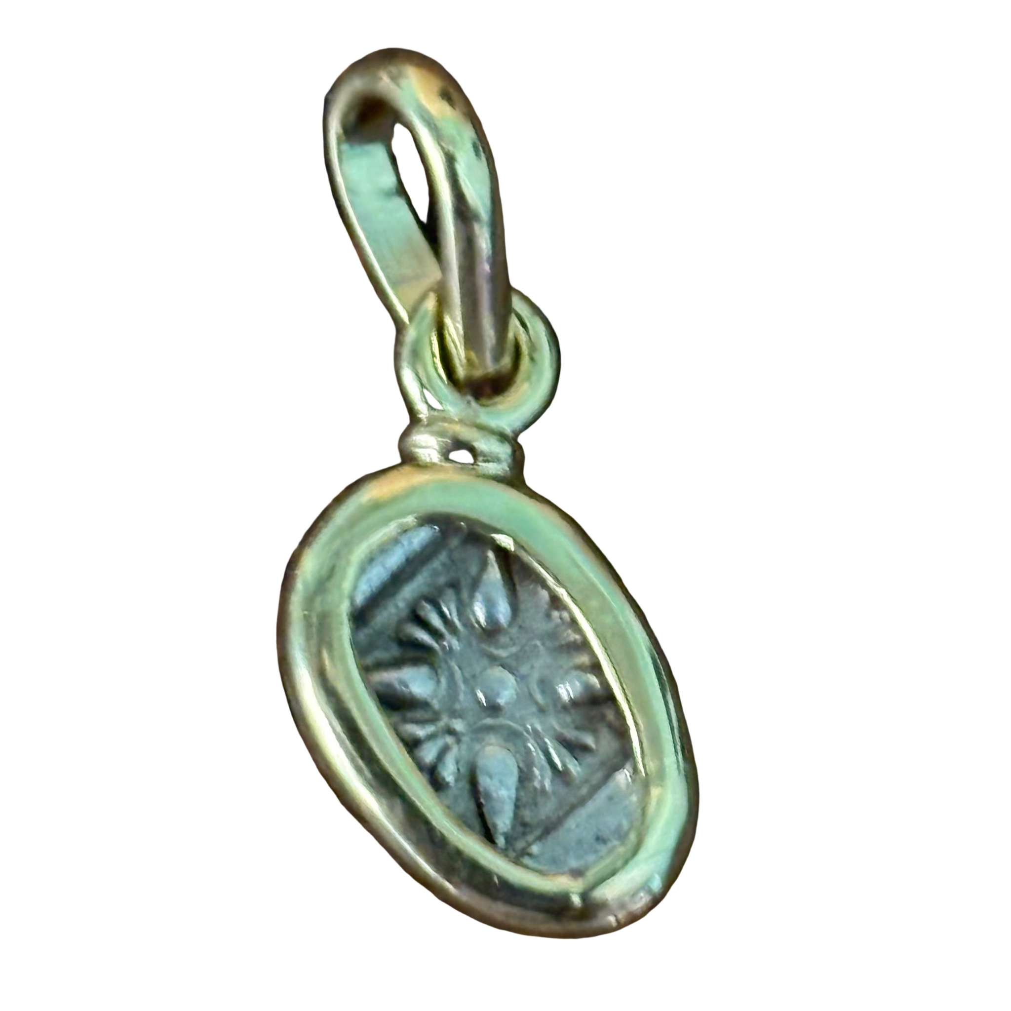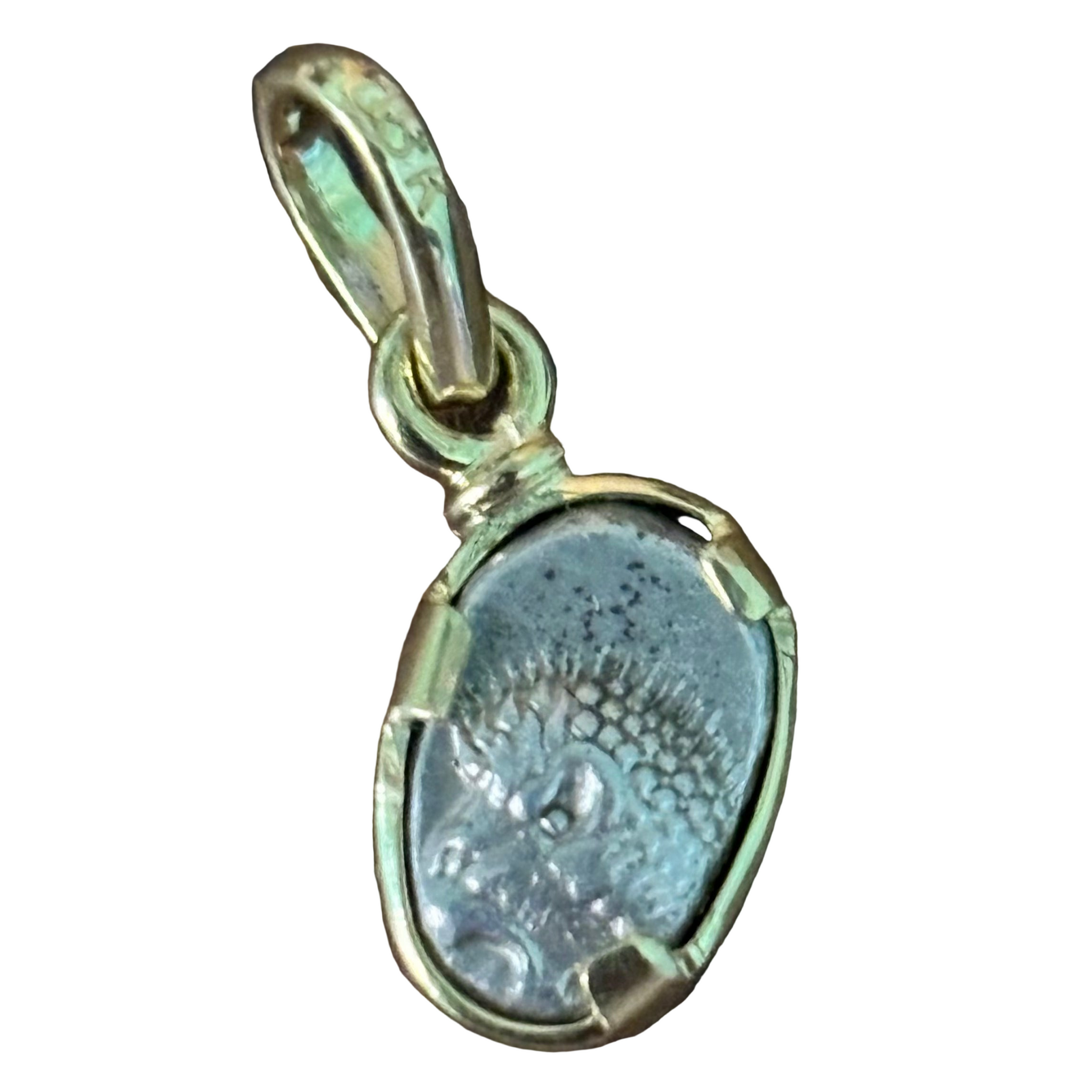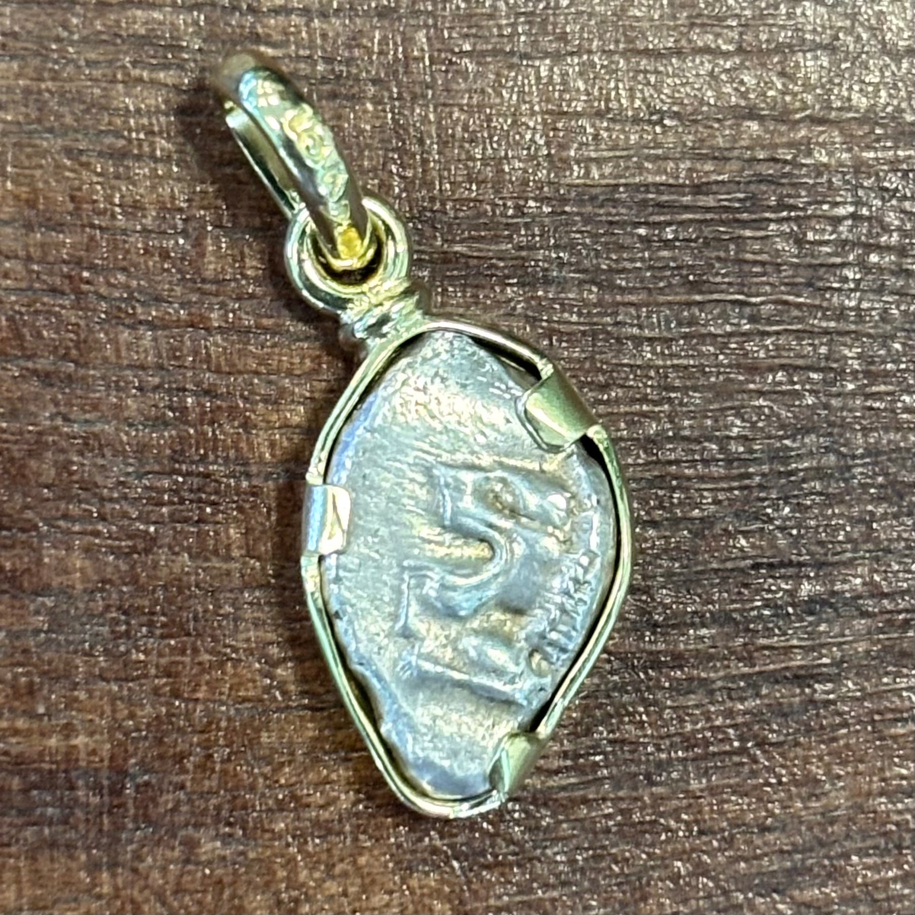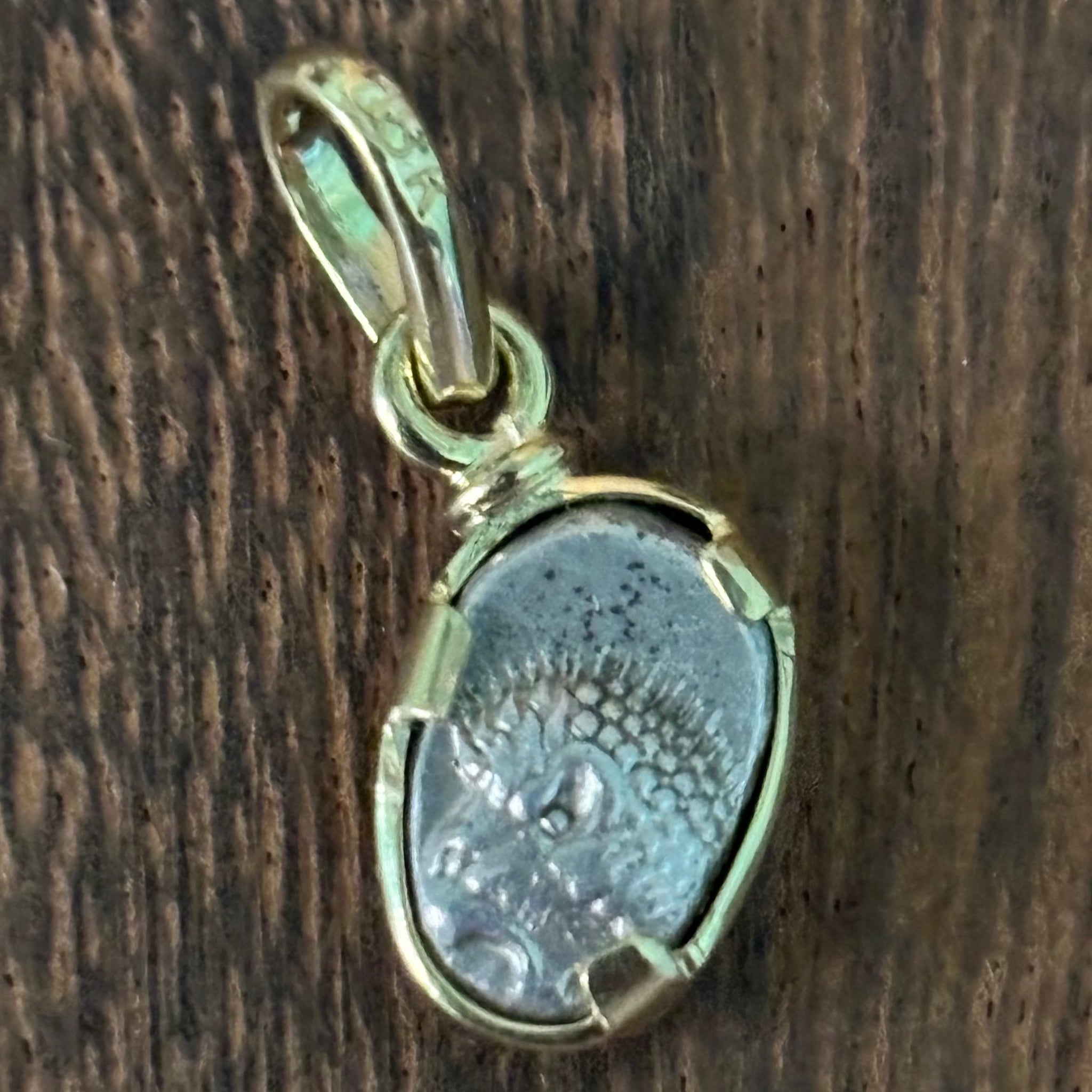 Denomination: AR Drachma Date: Circa 57-15 BCE Mint: Sakas Empire Reign: Azes II Mount: 18K gold Bale w/ Sterling Silver Ring...