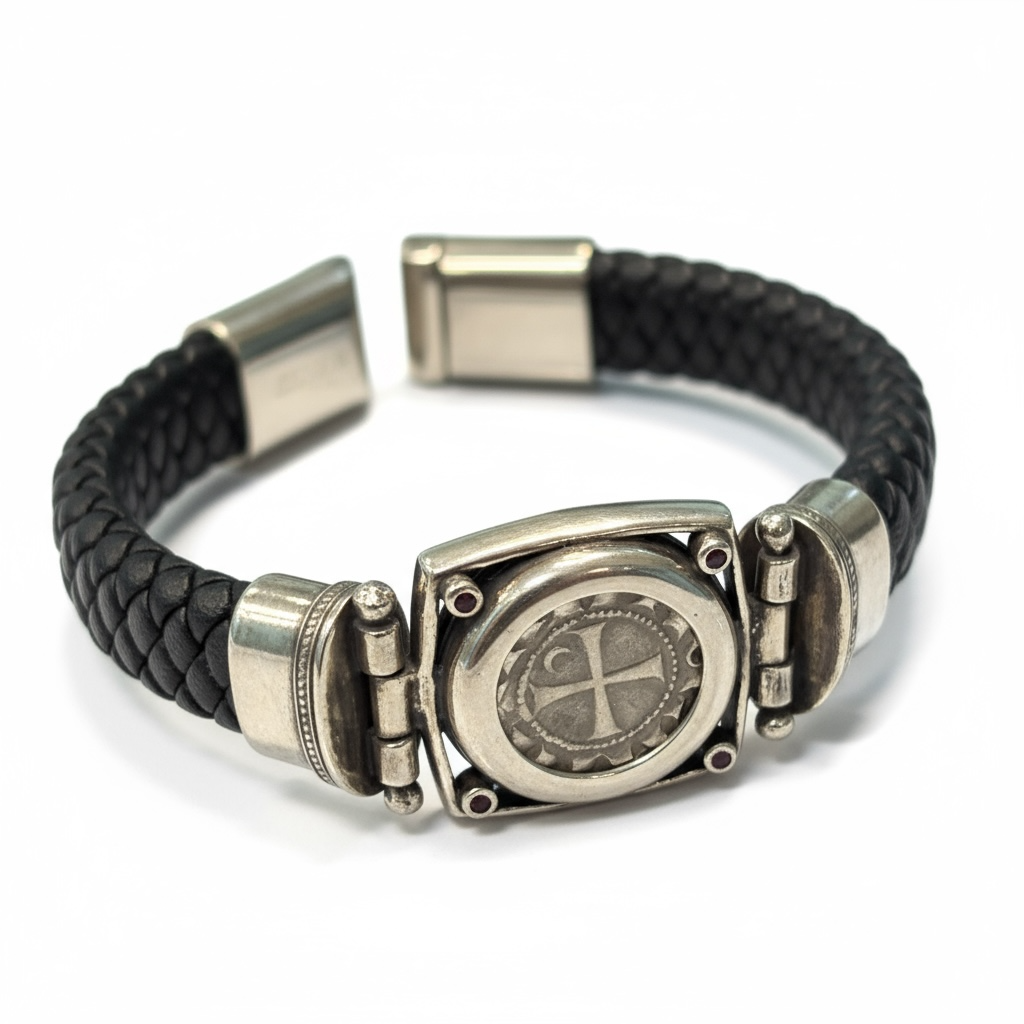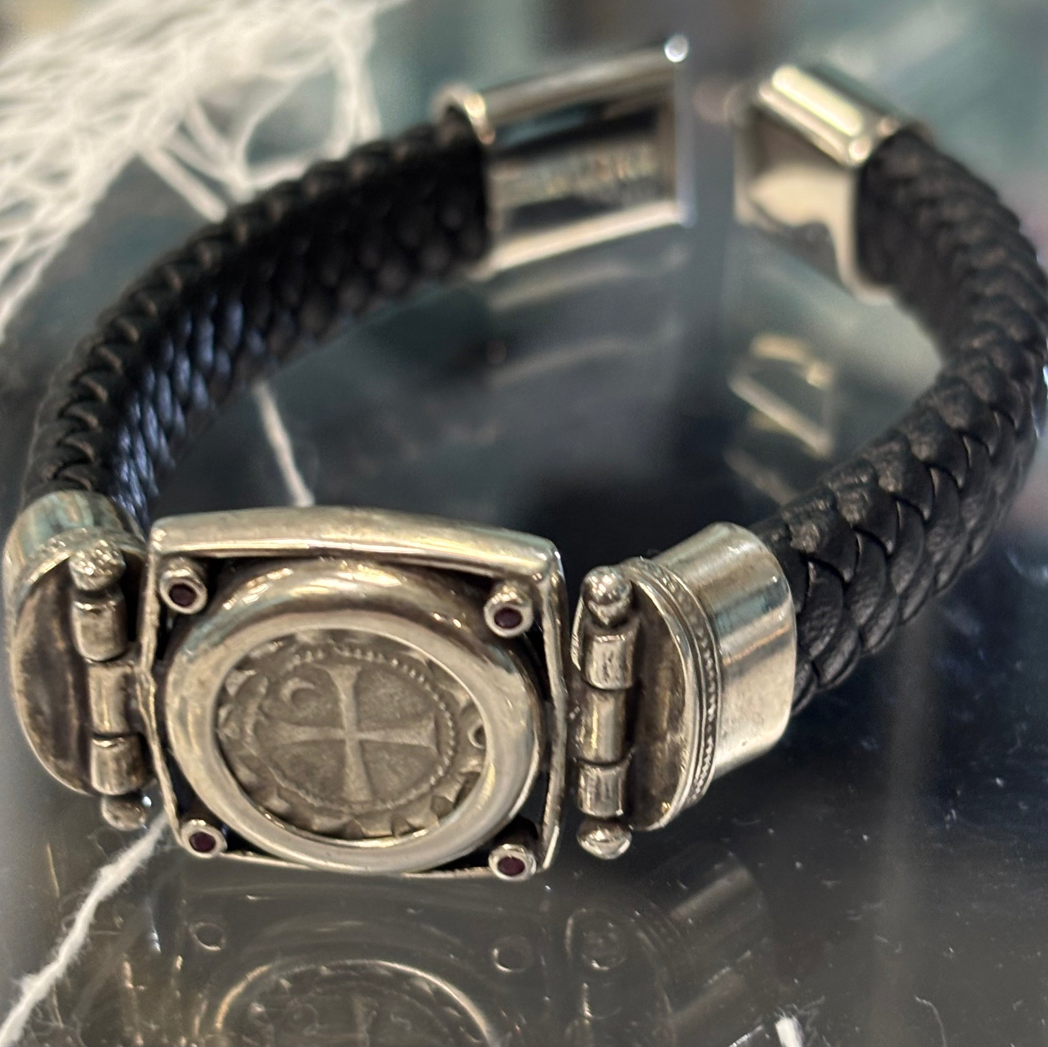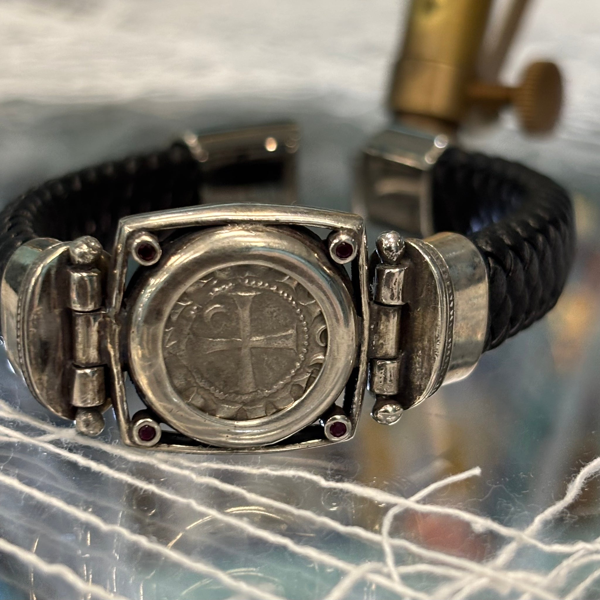 Denomination: 1/2 Reales Date: Not visible Mint: Mexico Assayer: Not Visible Mount: Sterling Silver bracelet Description: 1/2 Reales Cob. Obverse: Clear Jerusalem Cross with partially visible Lions and Castles...
