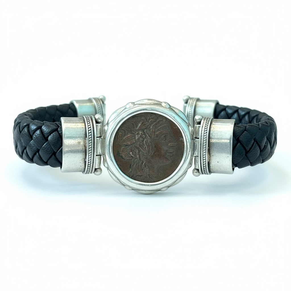 Denomination: AE Bronze Date: Circa 275-216 BCE Mint: Syracuse, Sicily Mount: Sterling silver Description: Poseidon “King of the Seas”. Time of Hieron II. Obverse: Head of Poseidon left,...