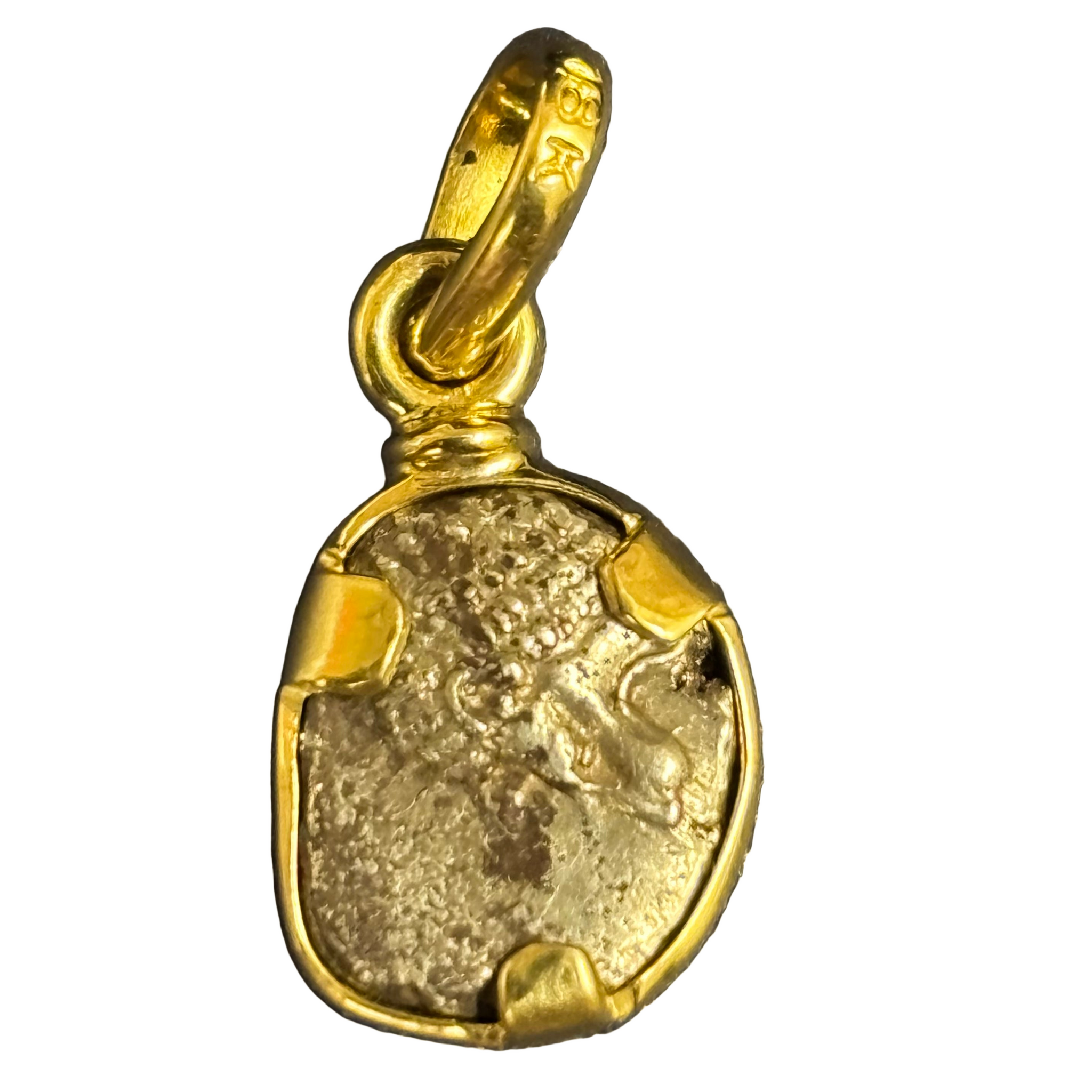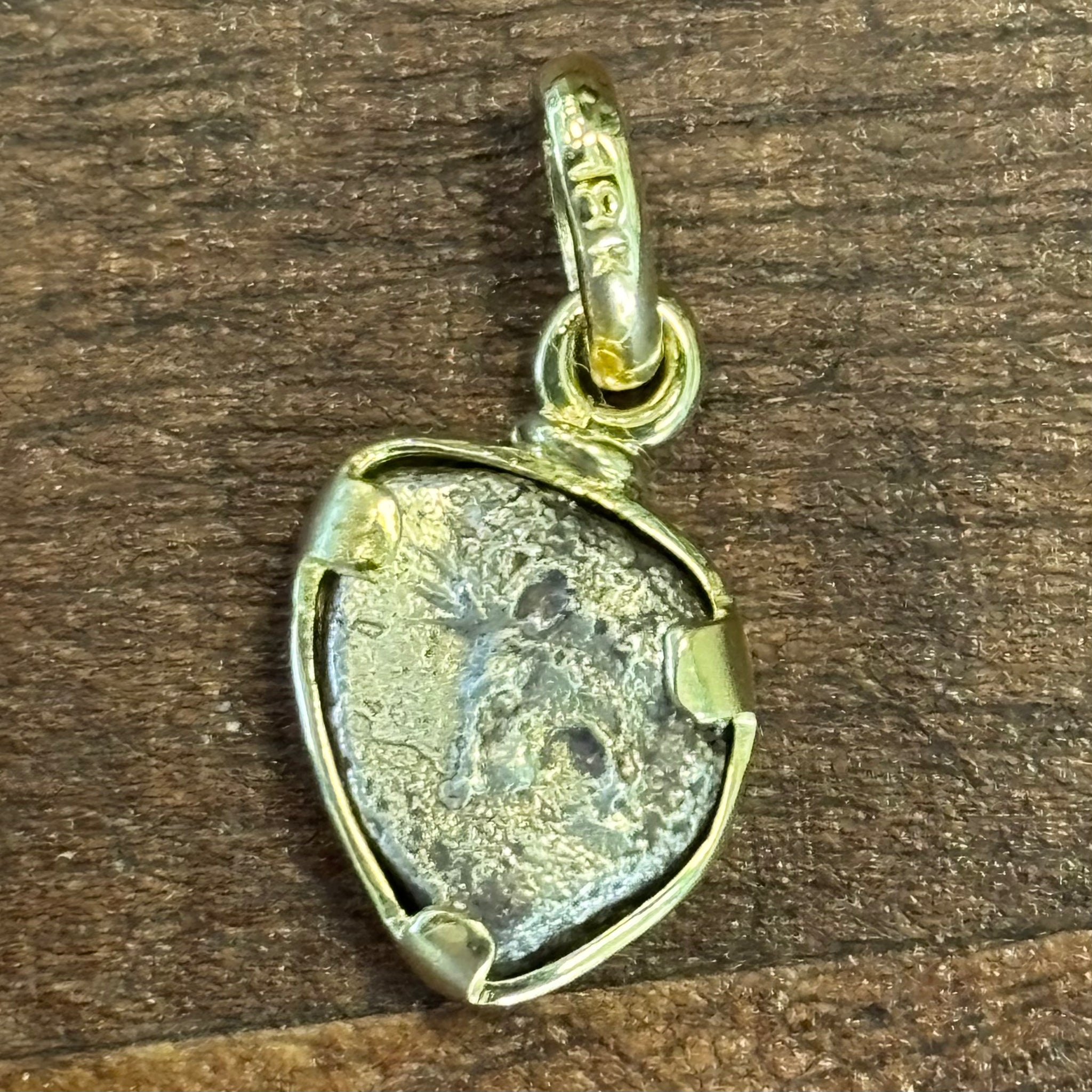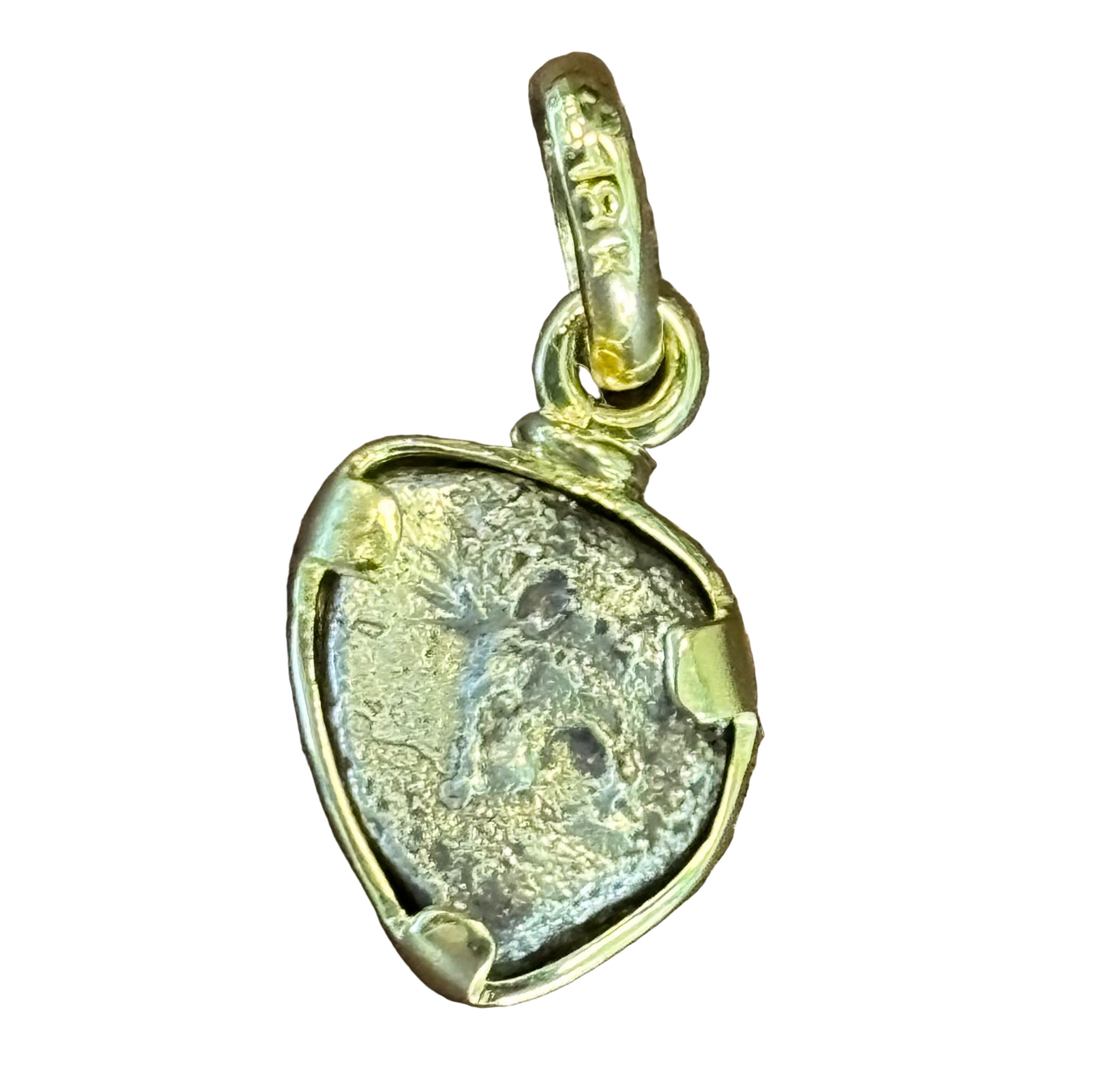 Denomination: AE Prutah Mint: Jerusalem Mint Date: 30 A.D. Grade: Very Fine Weight: 1.51 gm Mount: 14K Gold Description: JUDAEA, Procurators. Pontius Pilate. 26-36 CE. Æ Prutahin the...