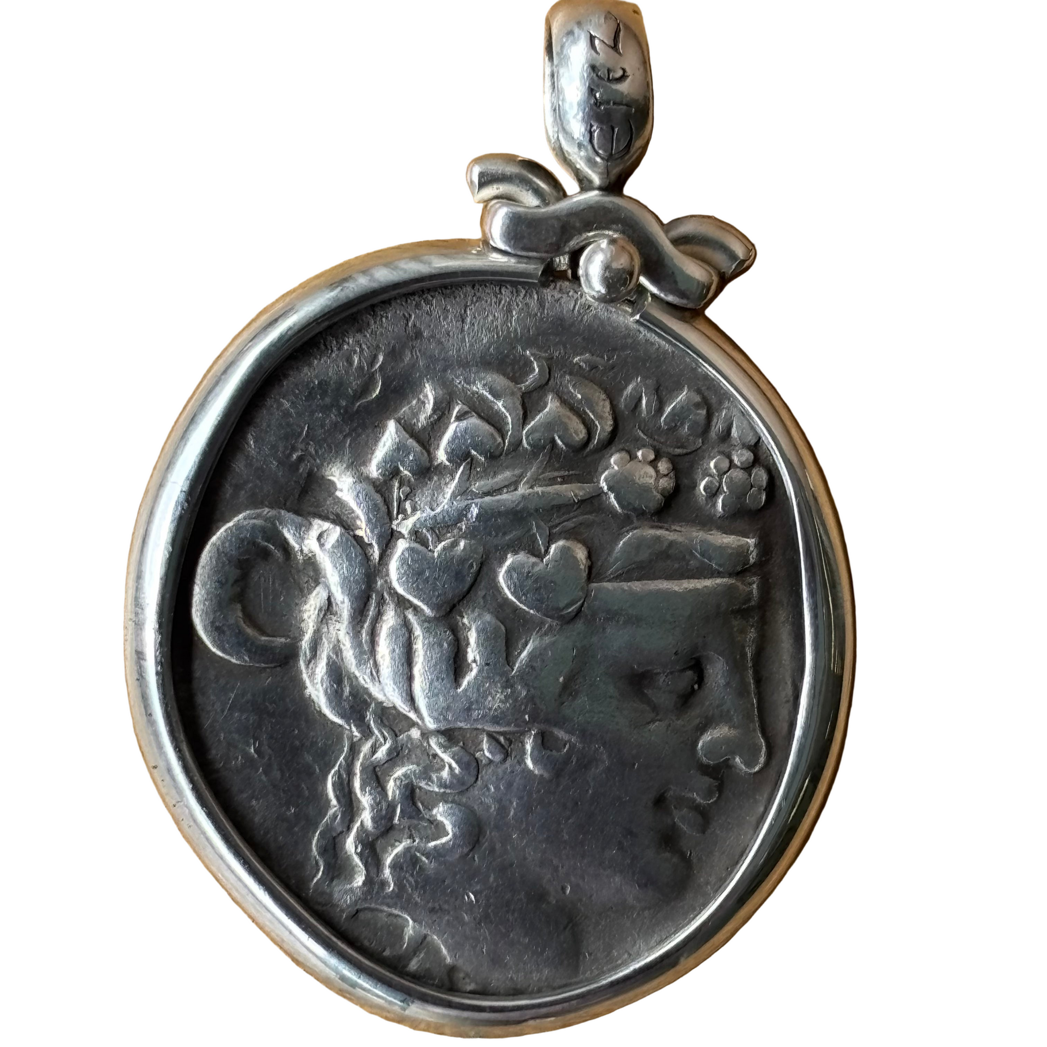 Denomination: AR Tetradrachm Date: Circa 148 BCE Mint: Thasos Mount: Sterling Silver Description: Thasos, AR Tetradrachm. Obverse: Head of Dionysos right, wreathed with...