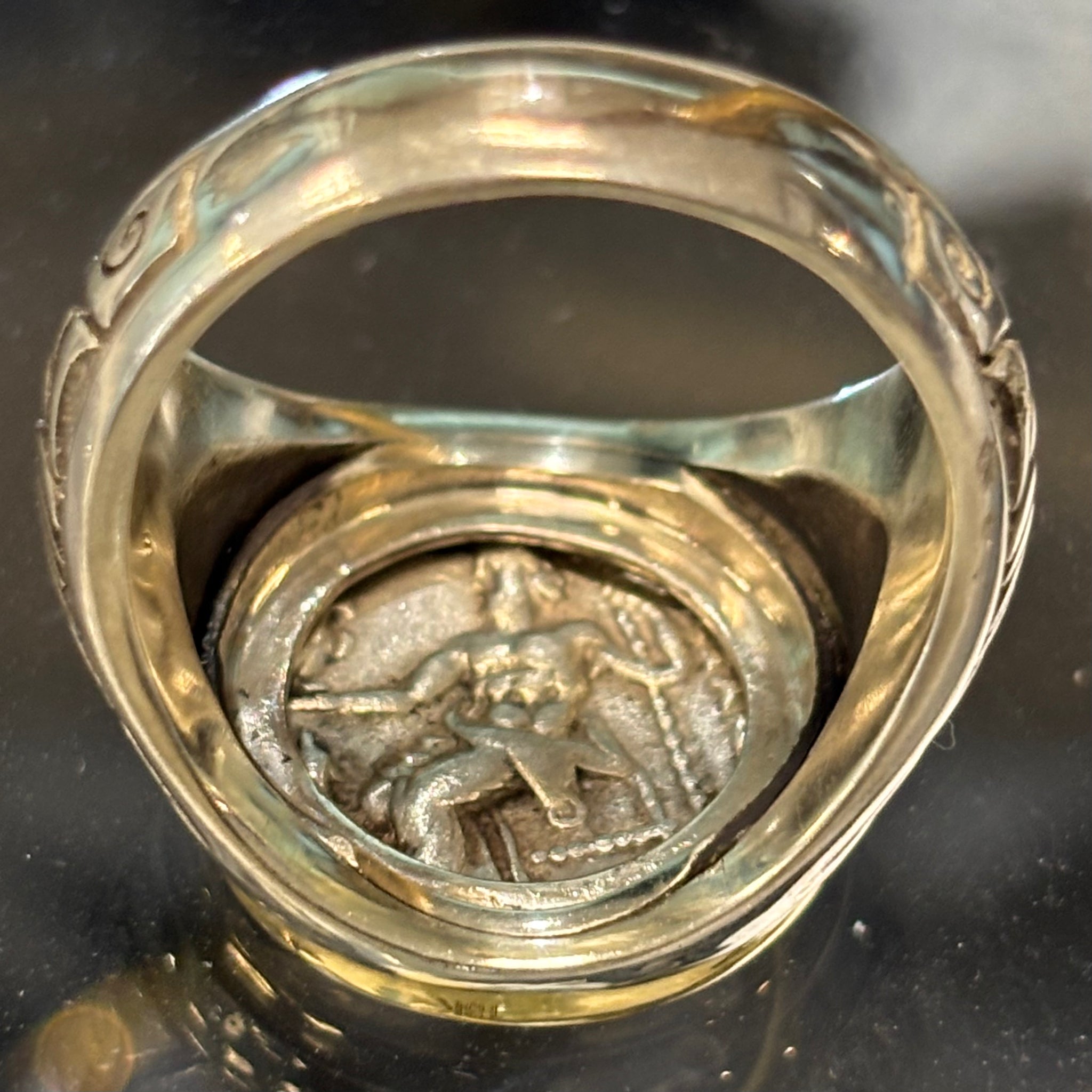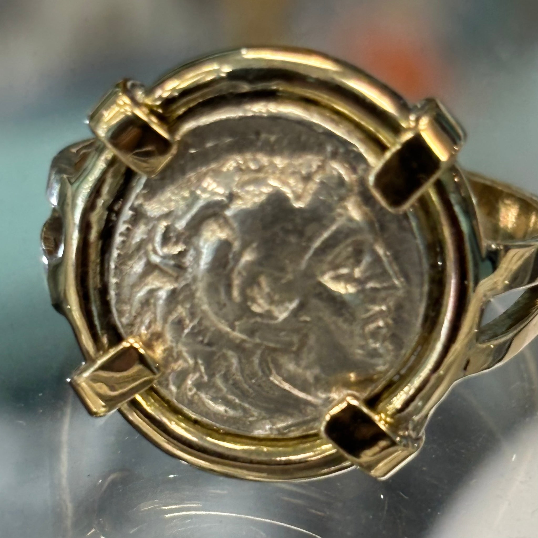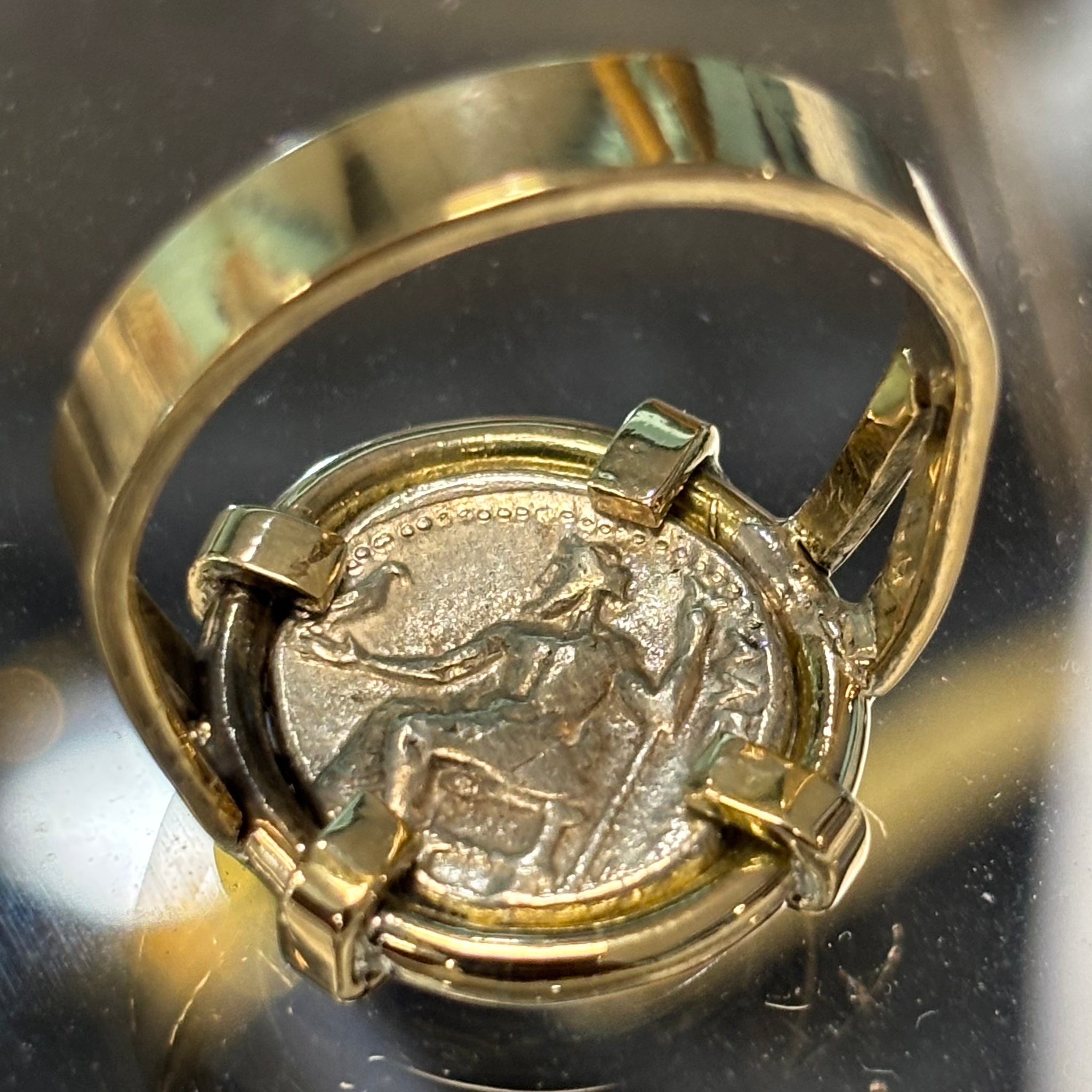 Denomination: AR Drachm Mint: Macedonia Kingdom Date: Circa (325-320) BCE Mount: Sterling Silver ring with 18K gold bezel. Note: Please let us know your ring...