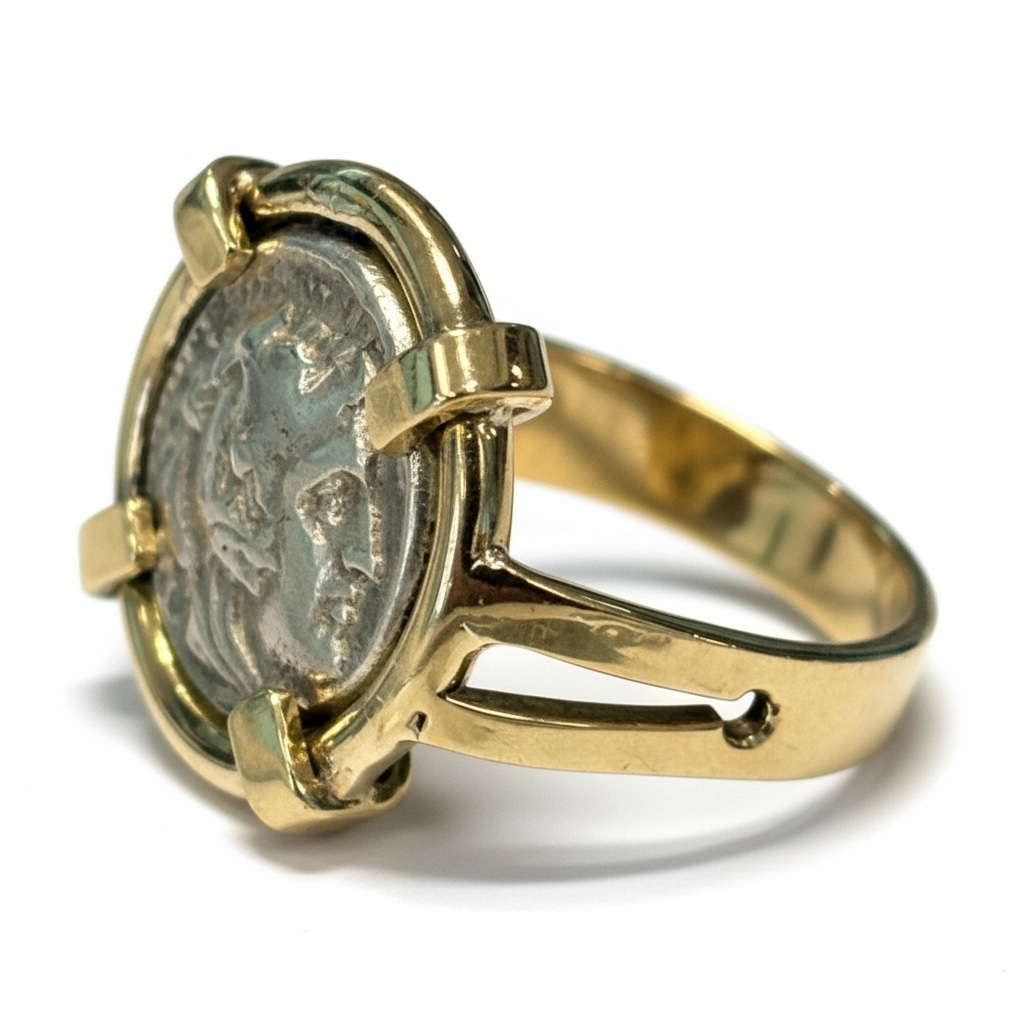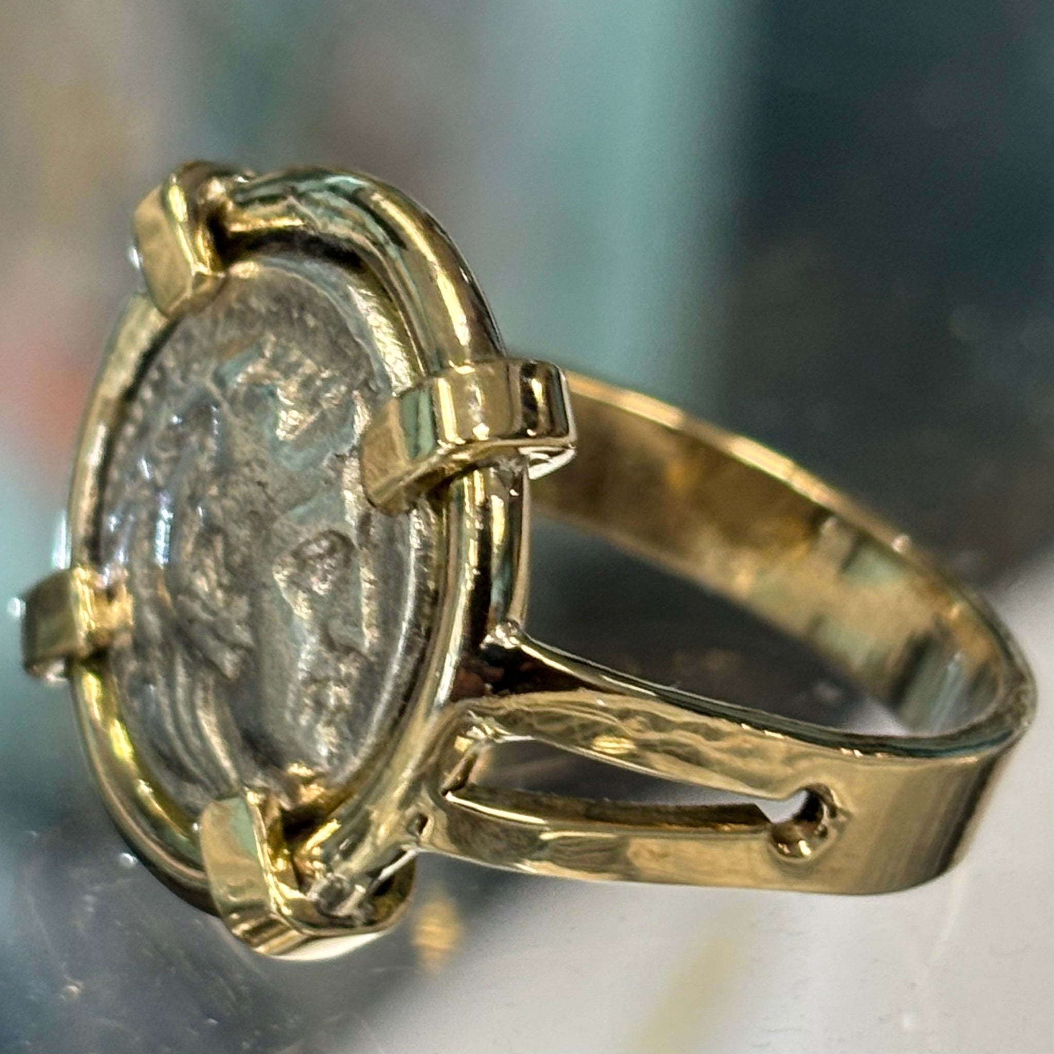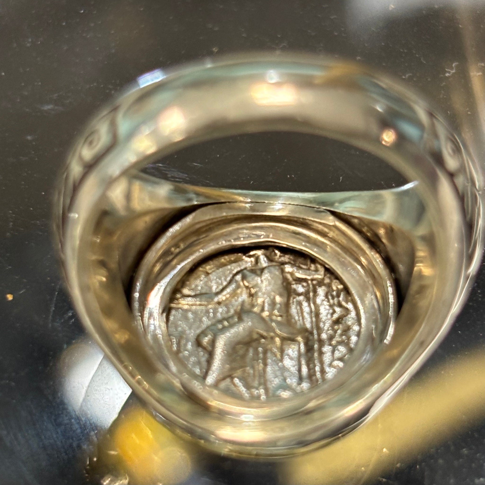 Denomination: AR Drachm Mint: Macedonia Kingdom Date: Circa (325-320) BCE Mount: Sterling Silver ring with 18K gold bezel. Note: Please let us know your ring...