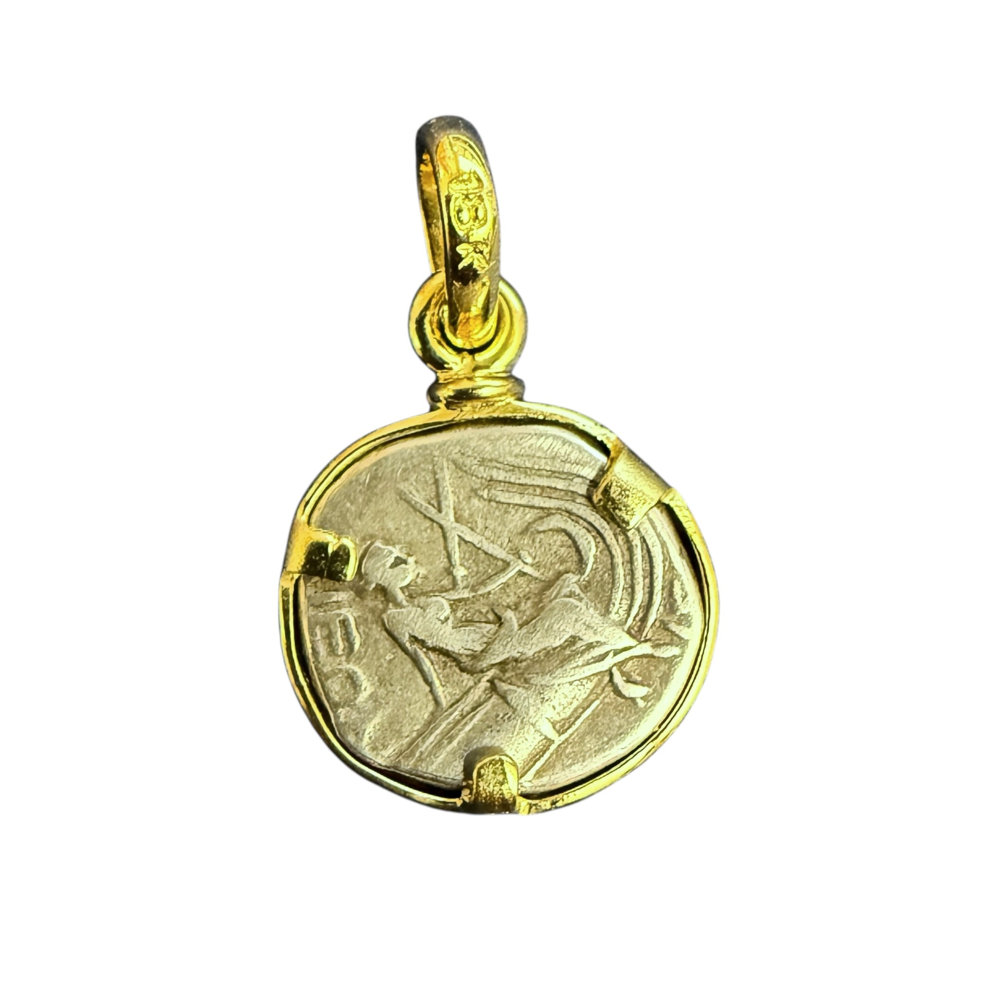 Denomination: Silver "Indian" weight drachm. Date: Circa 174-165 BCE Weight: 2.38 gm., Dim: 15 x 16 mm Mount: 14K gold Description: Obverse: Elephant walking right,...