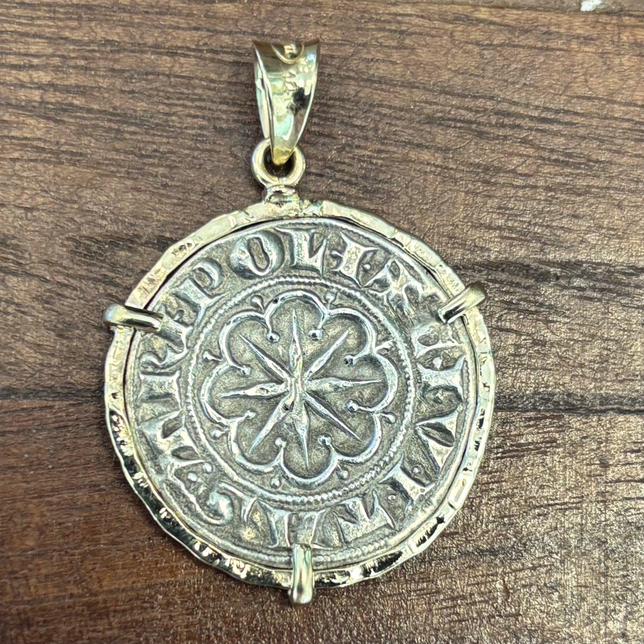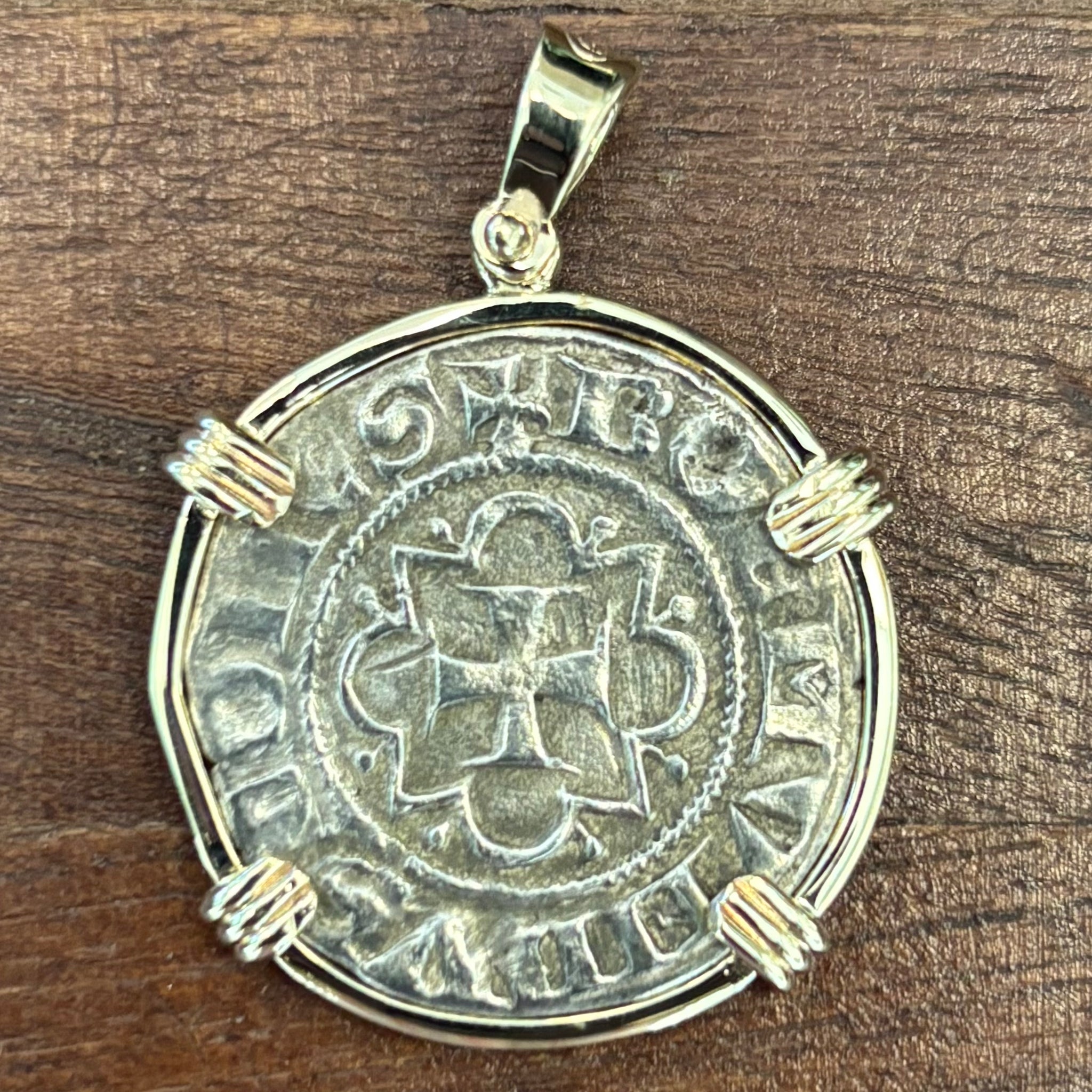 Denomination: Denier Date: Circa 1252-1268 ADReign: Bohemond VI Mint: TripoliMount: 14K Gold Description: Obverse: 8-point star within octofoil. Legend; +C.I.V.I.TAS: TR.I.POL.I, Translation (City of Tripoli). Reverse:Cross in lobated...