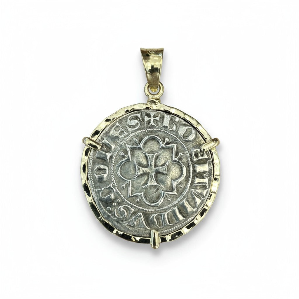 Denomination: 1 Reales Date: Circa 1497-1504 Mint: Toledo, Spain Assayer: “M” Mount: Sterling Silver frame with custom 14K prongs and bale Grade: NGC 6870824-004. VF Details Description: Obverse: Coat of arms in...