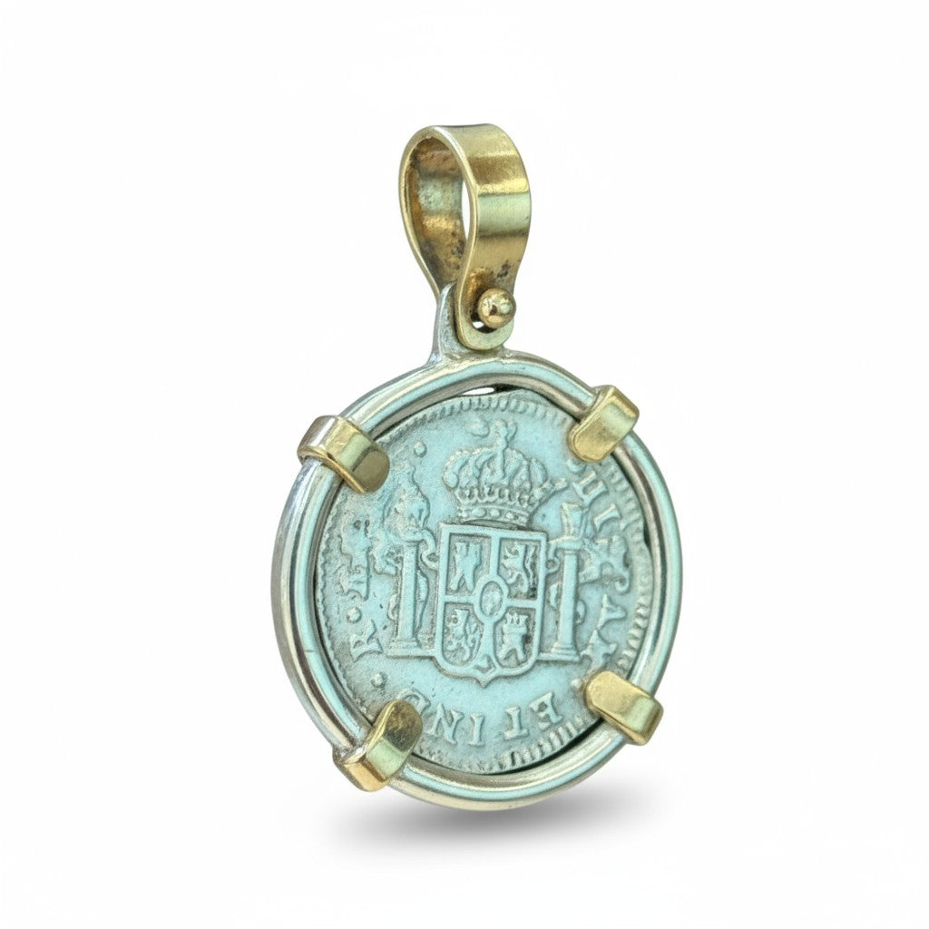 "The Shipwreck that changed the world" Denomination: 1/2 Reales Date: 1773 Reign: Carolus III Mint: Mexico Assayer: F.M. Weight: 1.4 gm Grade: Mint Mount: 14K Gold flip...