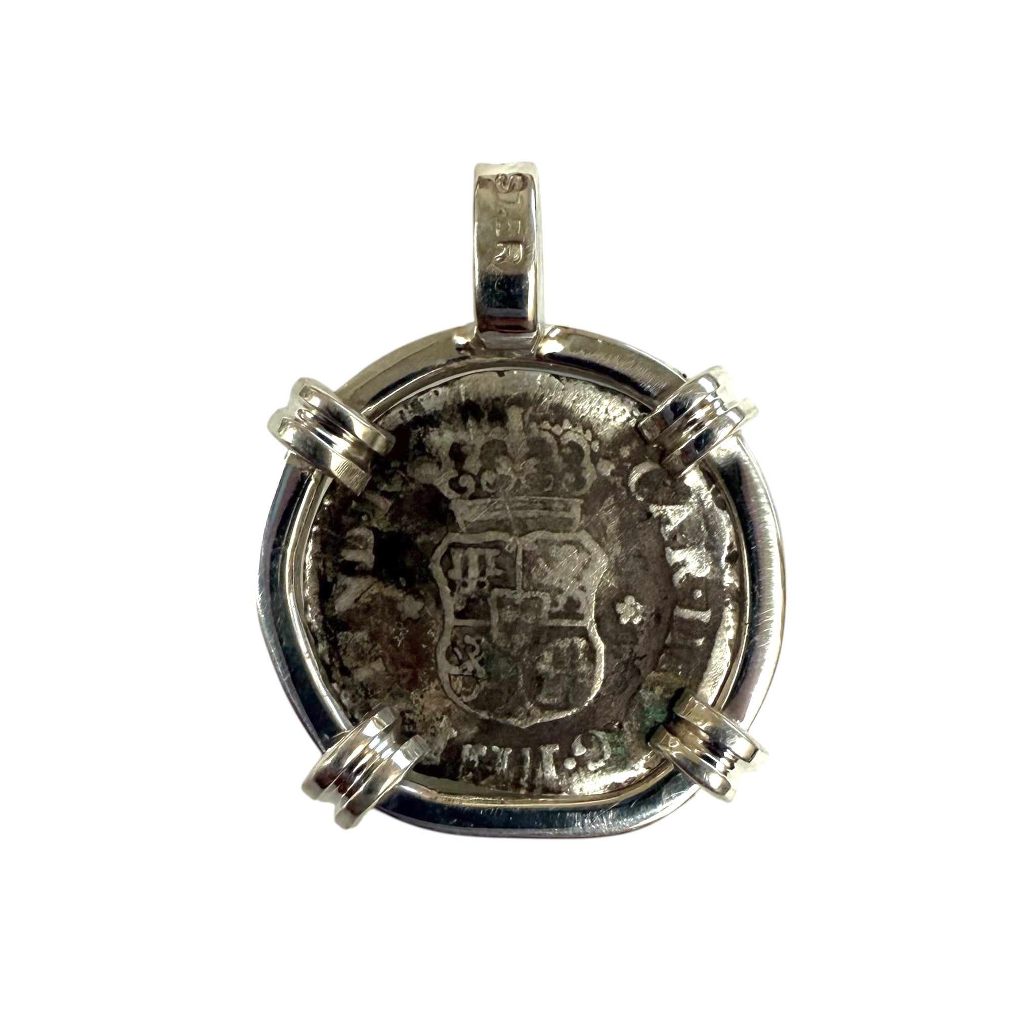 Denomination: 2 Reales Date: 1757 Reign: Carolus III Mint: Mexico Assayer: F.M. Weight: 6.80 gm Grade: 1 (One) Mount: Sterling Silver with sapphire accent on bale Description: Reverse:...