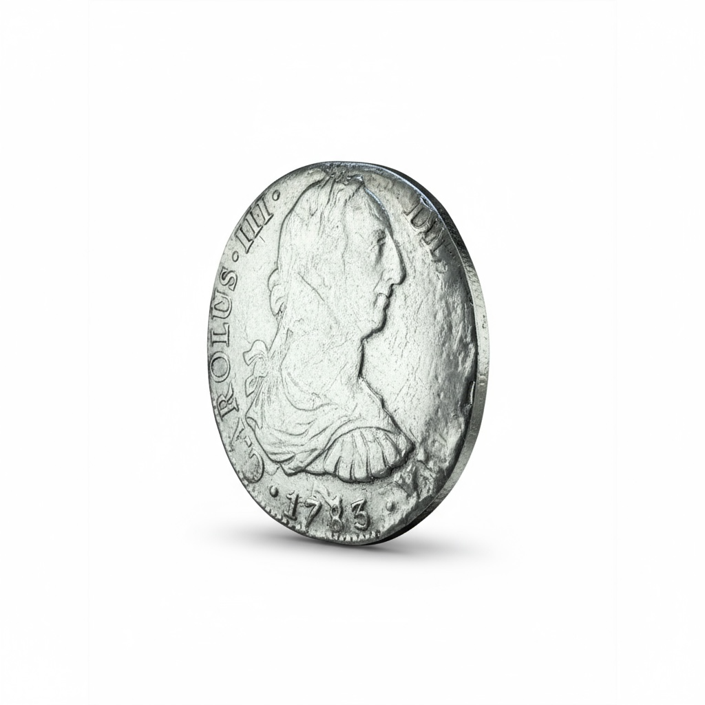 Denomination: 8 Reales Date: 1783 Reign: Carolus III Mint: Mexico Assayer: F.F. Weight: 22.6 grams Grade: Fine Plus Description: Reverse: Crowned shield of Spain in between Pillars...