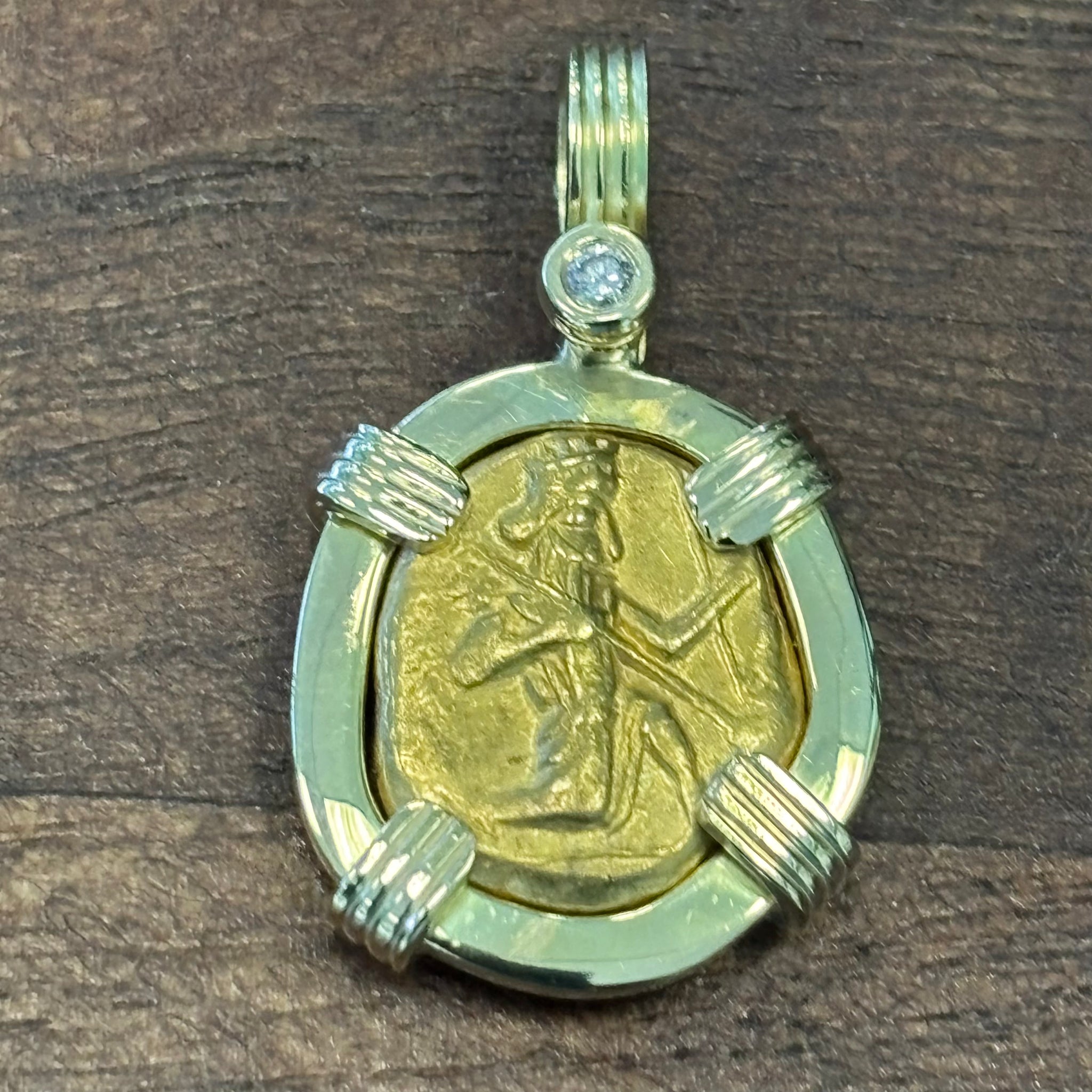 Denomination: Escudos Reign: Charles and Joanna Date: Before 1550 Mint: Seville, Spain Assayer: “D” – (Square D) Weight: 3.26 grams Grade: AU details Mount: 18K gold with...
