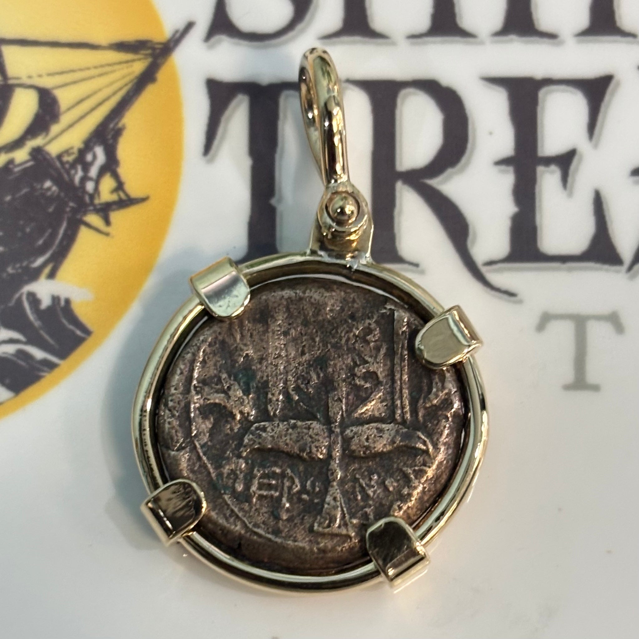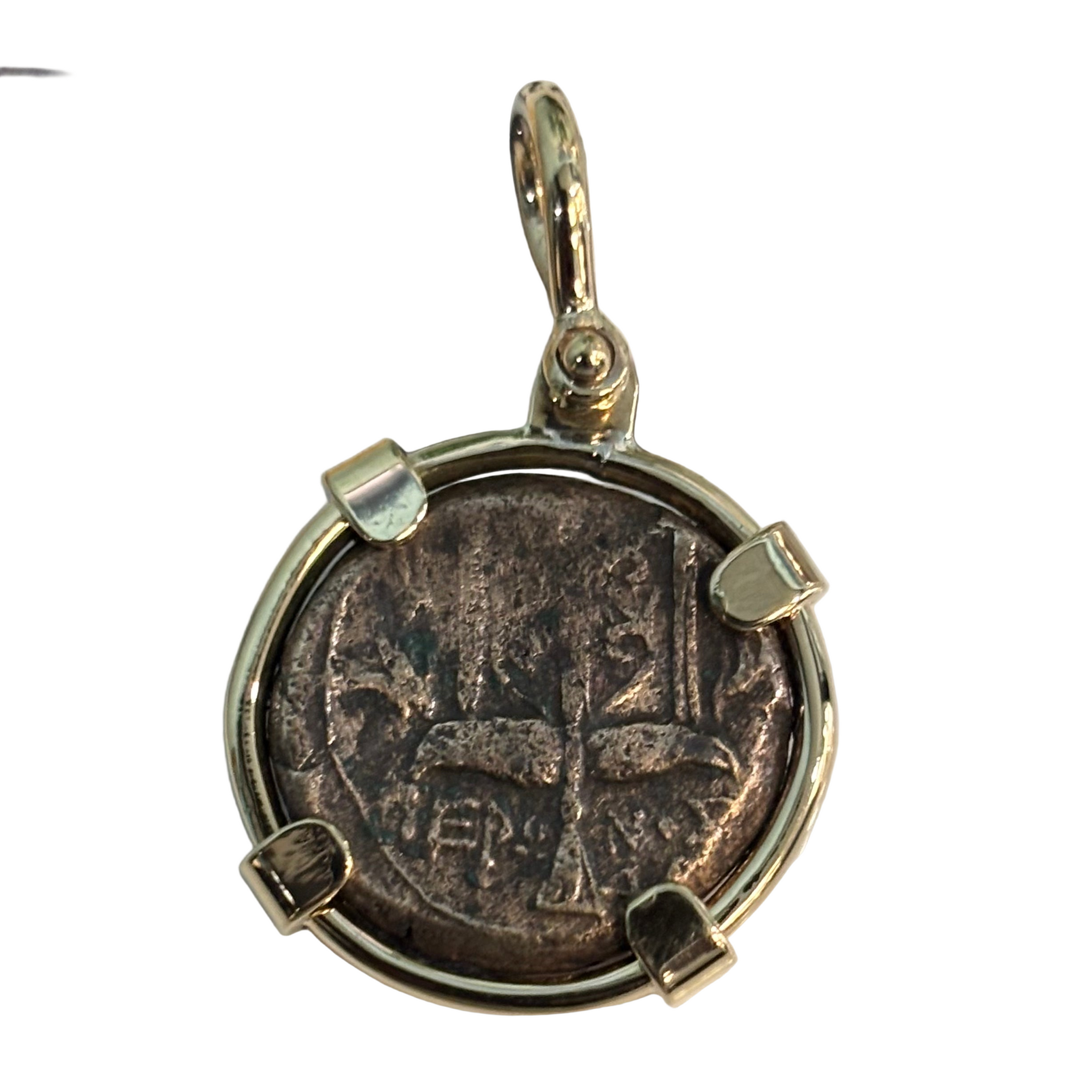 Description: Poseidon “King of the Seas”. Time of Hieron II. Obverse: Head of Poseidon left, wearing taenia Reverse: EPW-NOS, trident head, with scrolls decoration between prongs; lotiform shaft, flanked by dolphins.