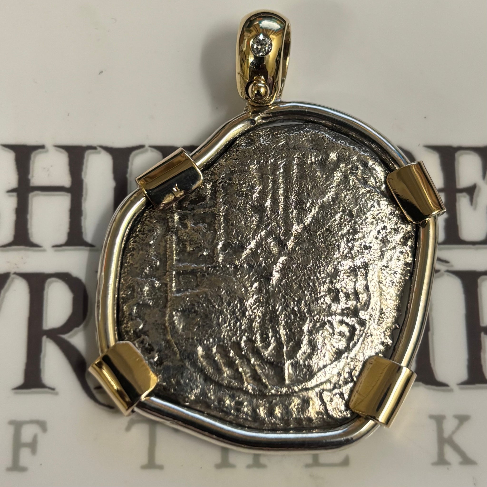 Denomination: 8 Reales Grade: Grade (Three) 3 Mint: Mexico Assayer: Not Visible Reign: King Philip III Weight: 17.60 gm Date: Not Visible Mount: 14K Gold with diamond...