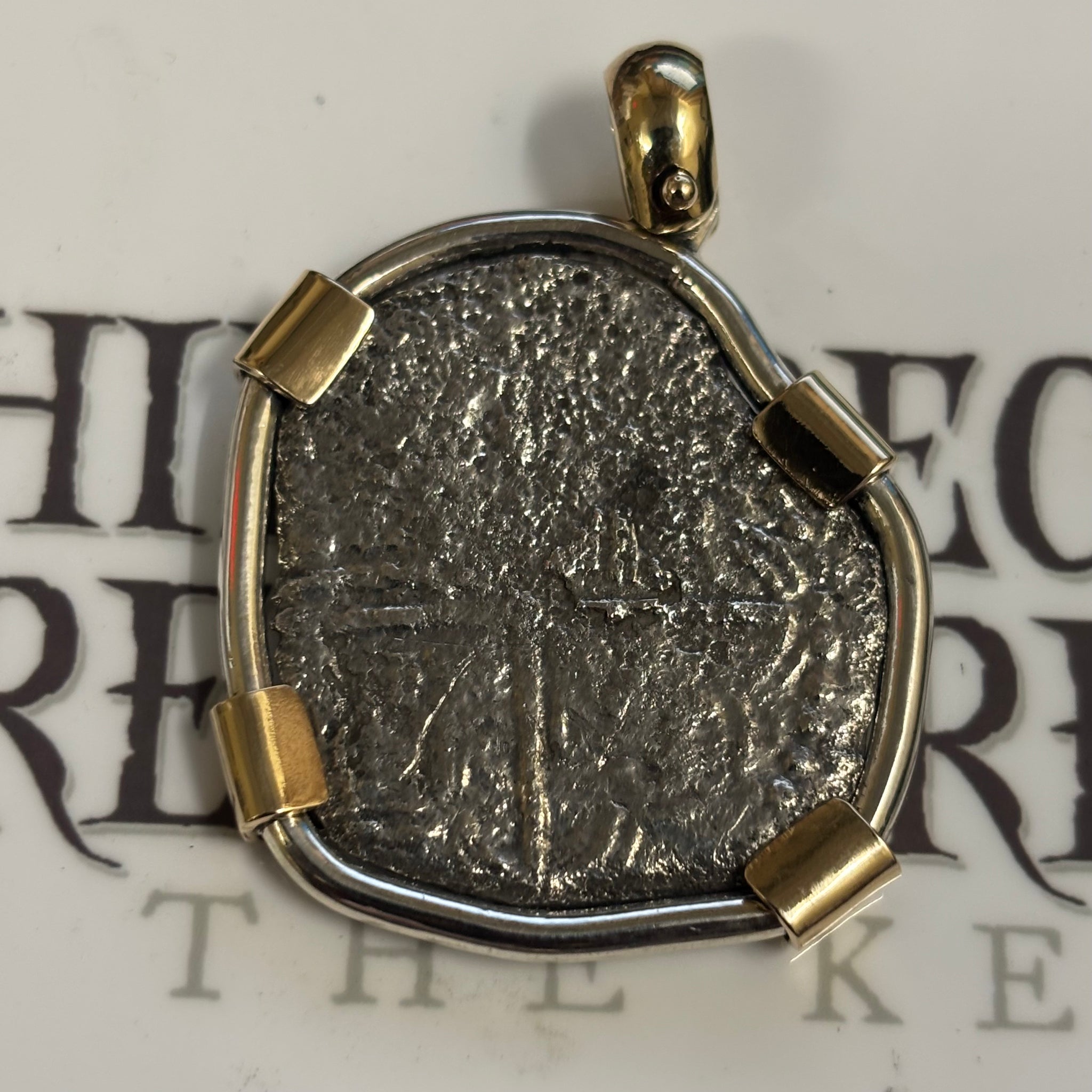 Denomination: 8 Reales Grade: Grade (Two) 2 Mint: Potosi Assayer: Not Visible Weight: 19.10 gm Date: Not Visible Mount: 14K gold (hammered) with Sterling Octopus...
