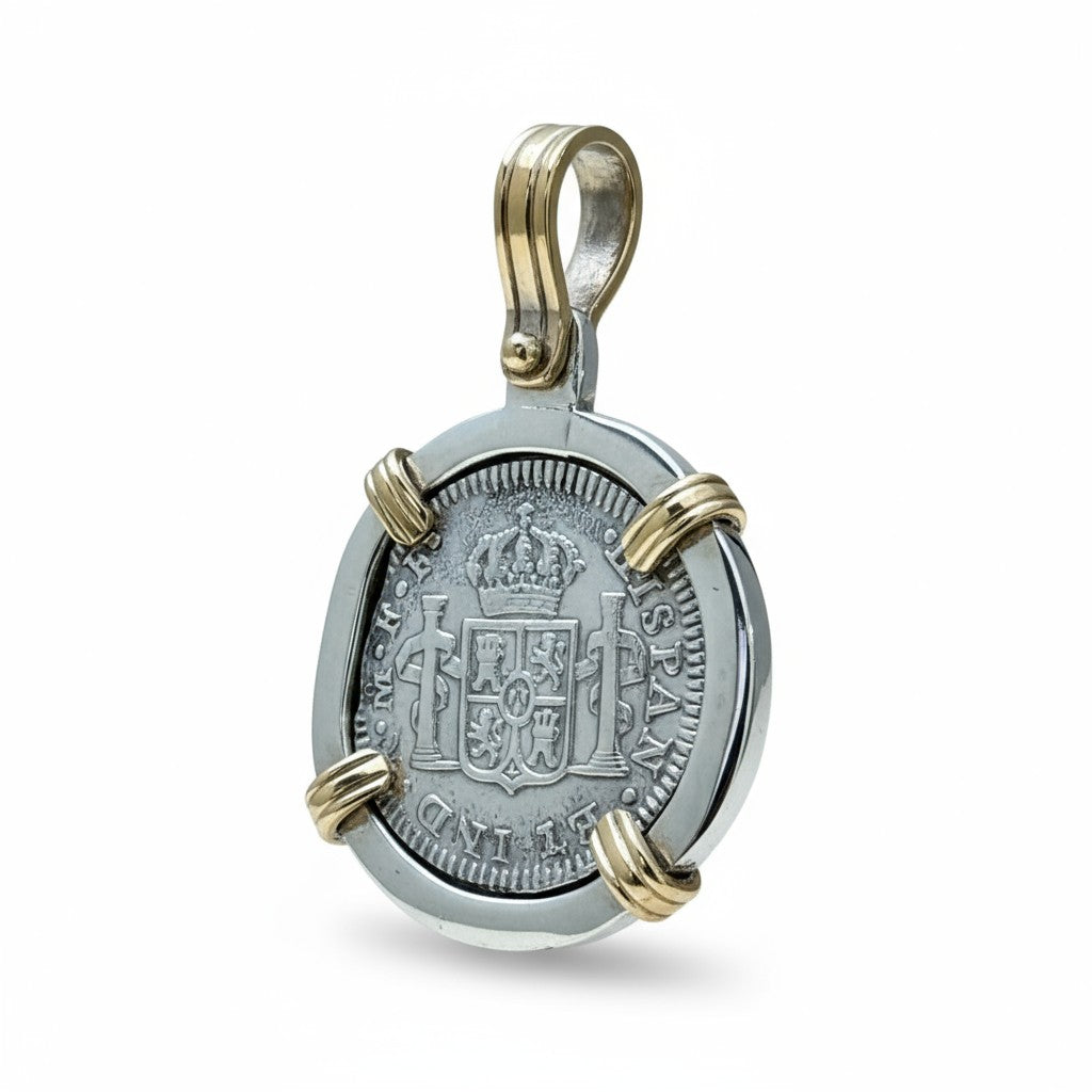 "The Shipwreck that changed the world" Denomination: 1/2 Reales Date: 1773 Reign: Carolus III Mint: Mexico Assayer: F.M. Weight: 1.4 gm Grade: Mint Mount: 14K Gold flip...