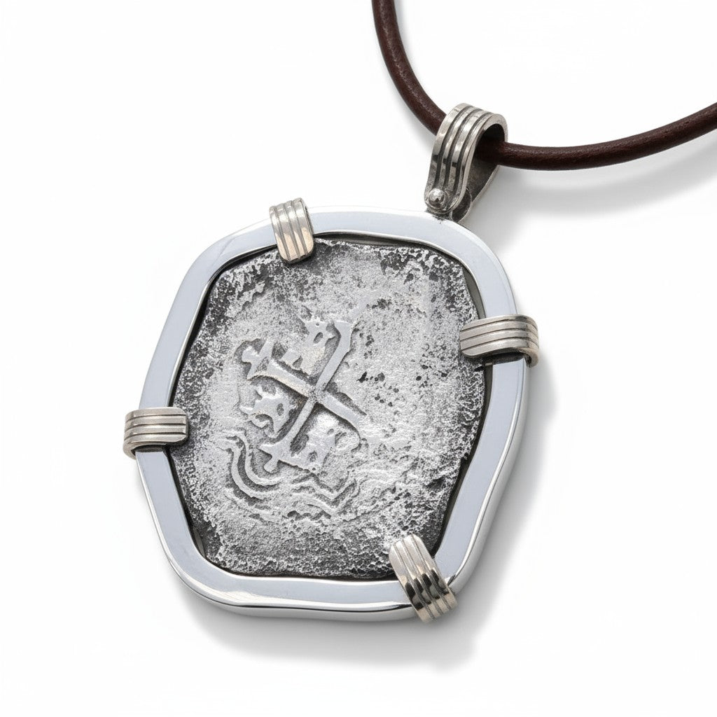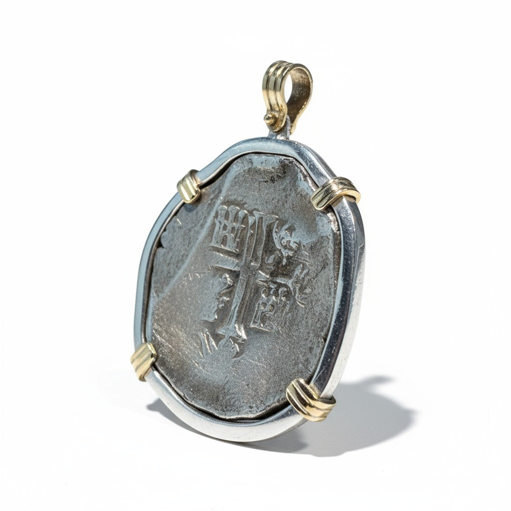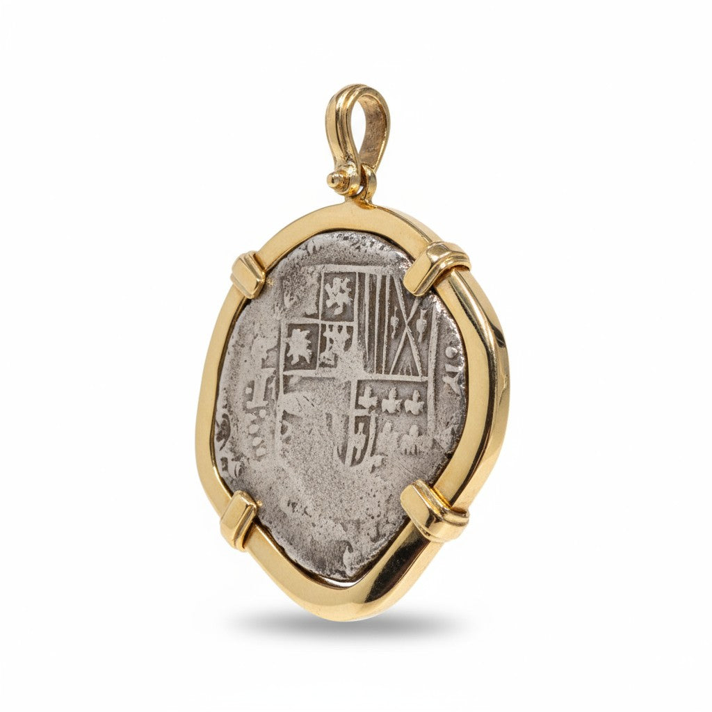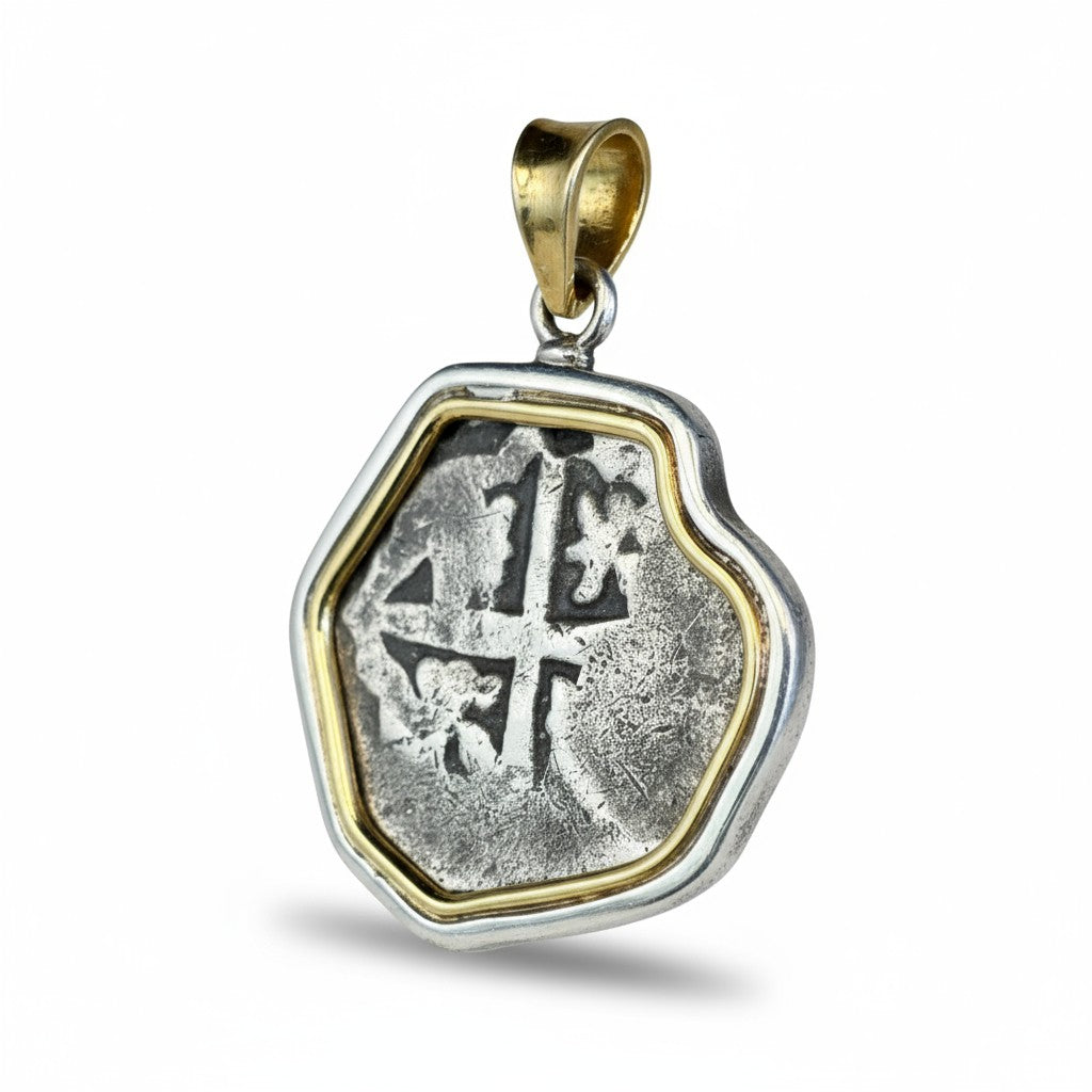 Denomination: 8 Reales Mint: Mexico City Date: Not Visible Assayer: G Reign: Charles II Mount: Sterling Silver with 14K prongs and bale History: Already a...