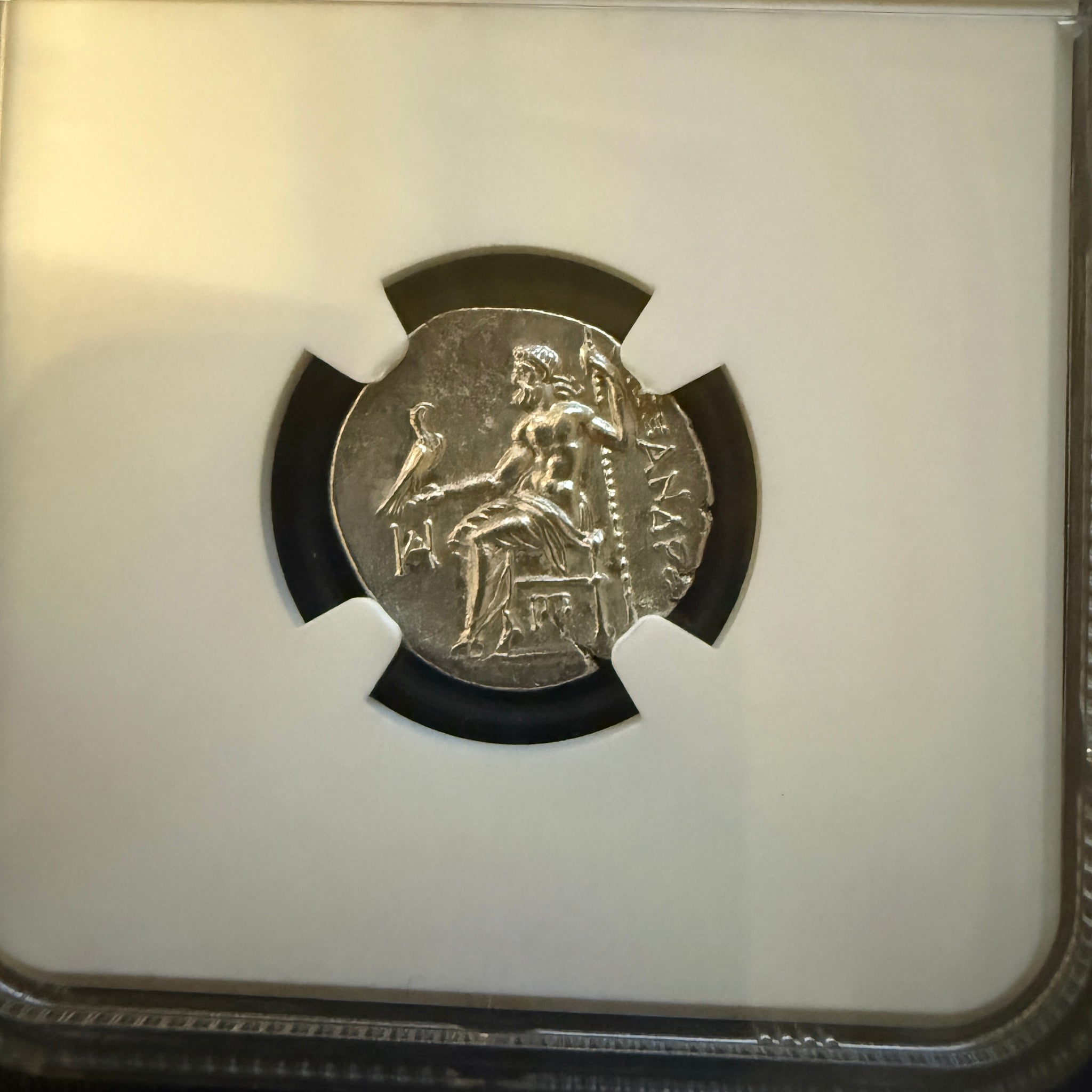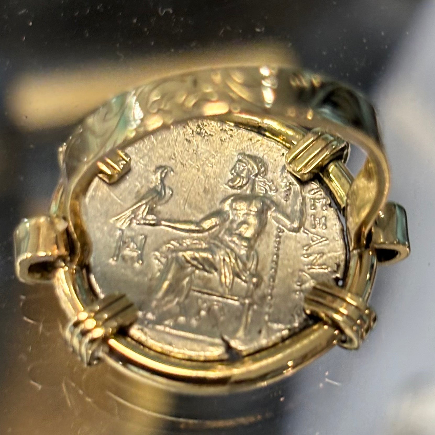 Denomination: AR Drachma Mint: Macedonia Kingdom Ruler: Alexander III the Great Date: 336-323 BC Frame: 14K Gold Ring Description: Alexander III, AR drachm, Obverse: Head of...