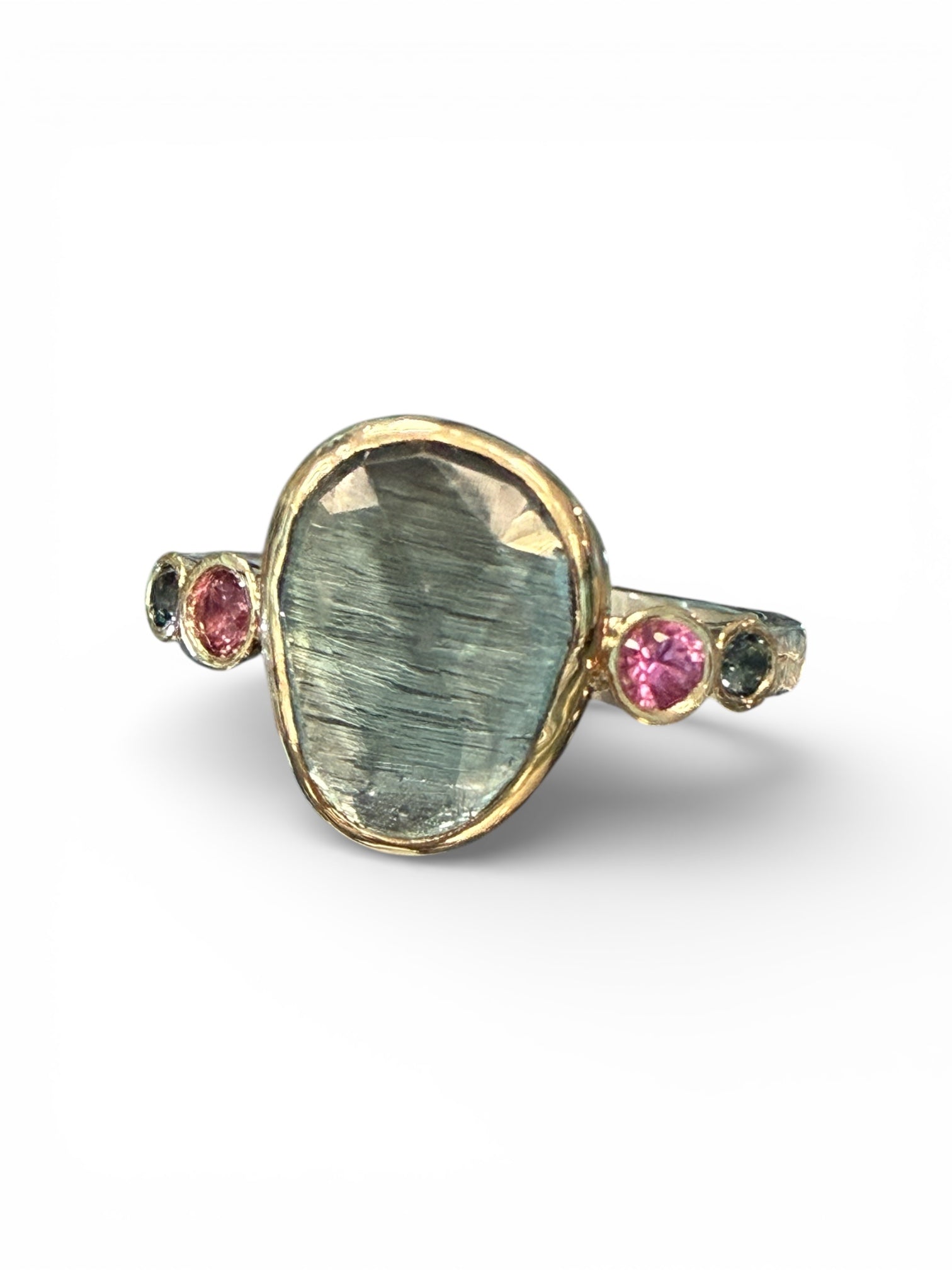 Gorgeous bi-color tourmaline delicately set in 14k gold. Our hand fabricated settings are intended to show case the stone for all of its beauty in...