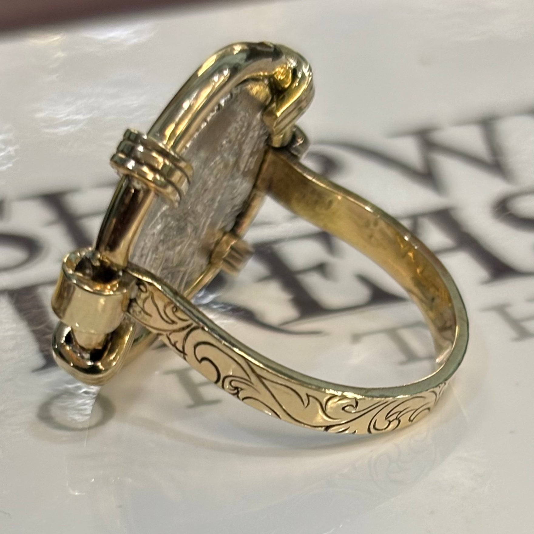 Denomination: 1/2 Reales Mint: Not Visible Assayer: Not Visible Date: Not Visible Mount: Sterling Silver burnished ring with 14K gold bezel. Size 11 Description: 1 Reales Spanish...