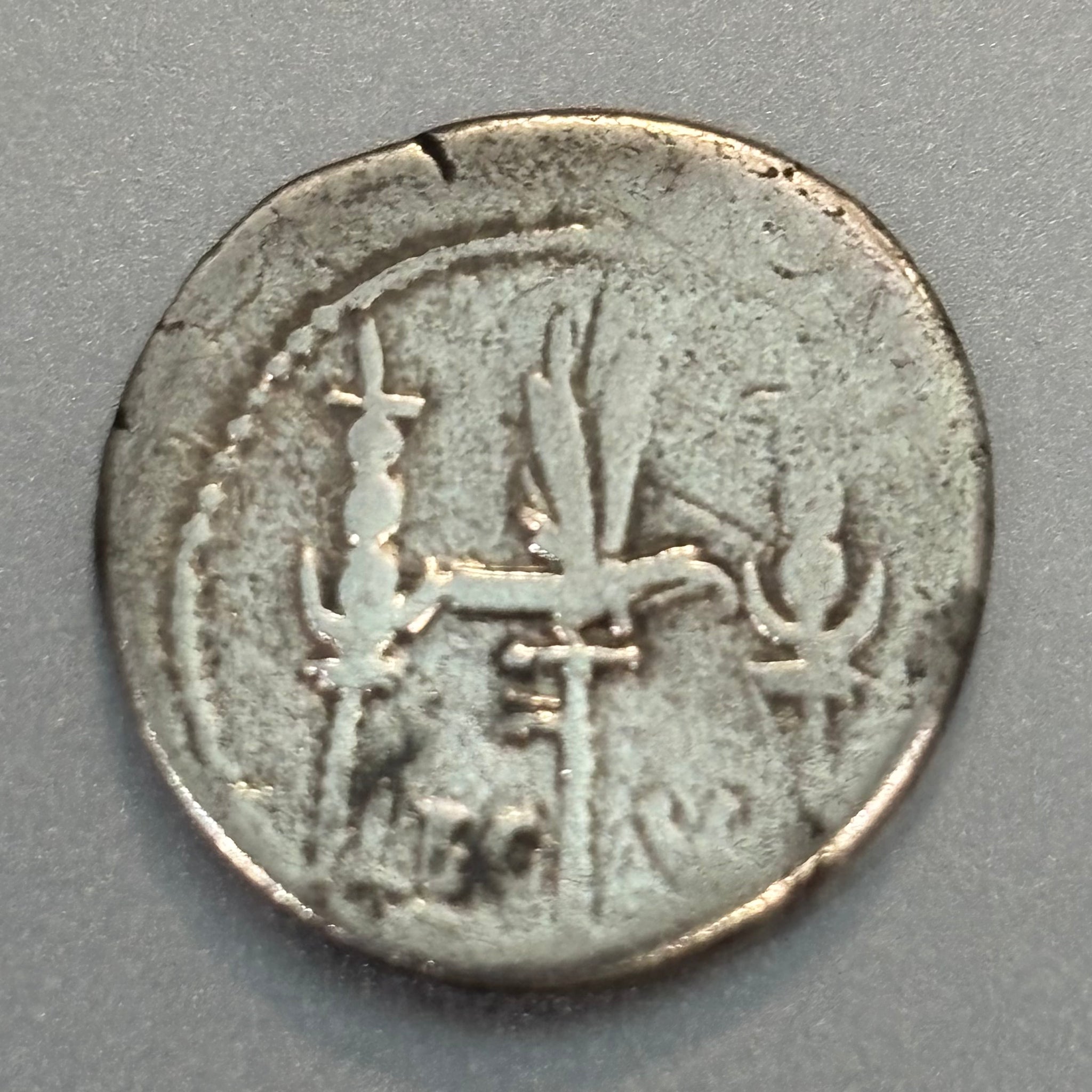Description: Marc Antony. The Triumvirs. Legionary issue. Obverse: Aquila (Eagle of Zeus) between two signa. Reverse: Praetorian galley right.\; LEG VII across lower field.