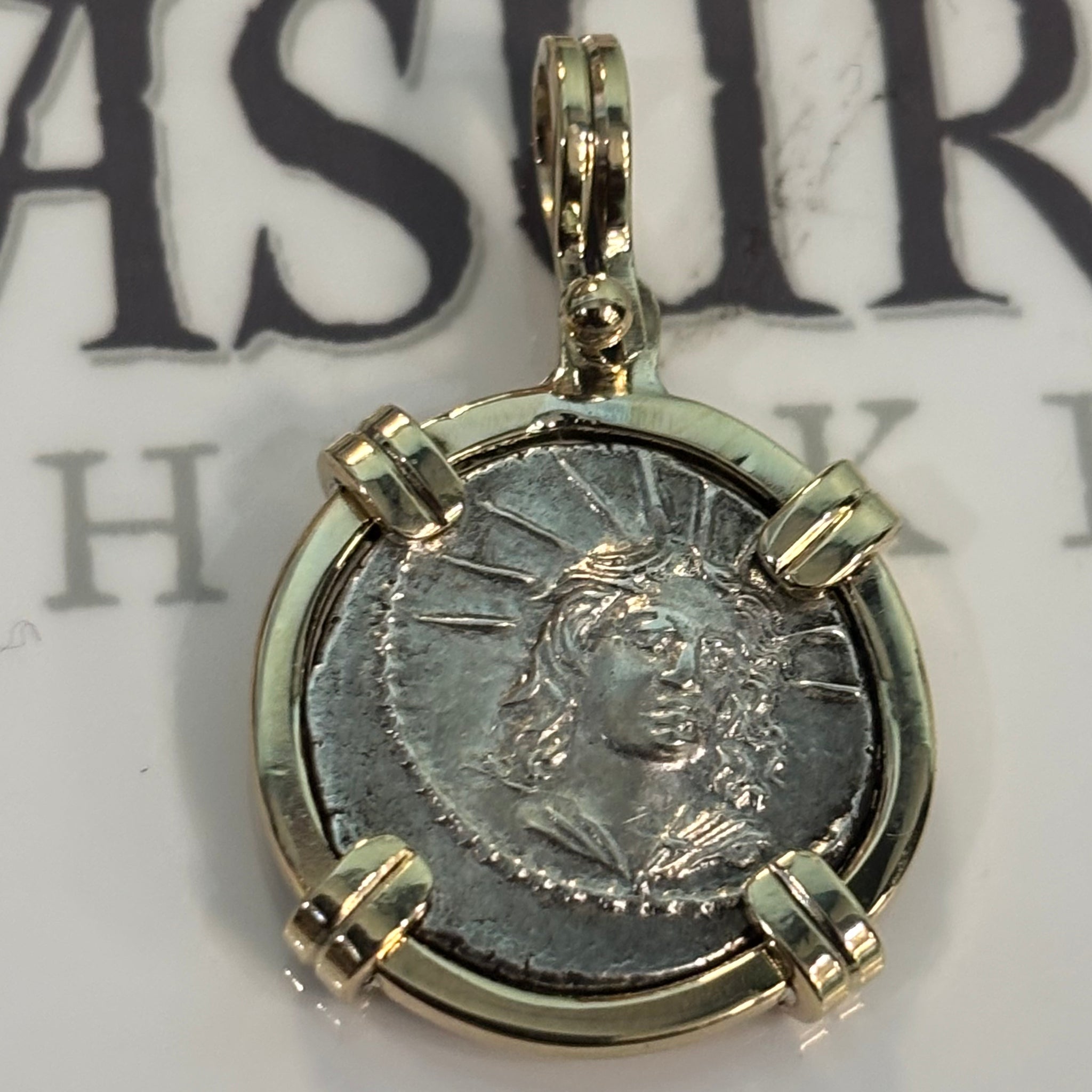 There was an explosion of solar imagery on coins minted by the Caesarians in 42 BC. In addition to the type, the Sn god was shown in profile on the obverse. These types were taken as a reference to the coming campaign in the East against Brutus and Cassius and to plans for a new temple of Sol in Rome.