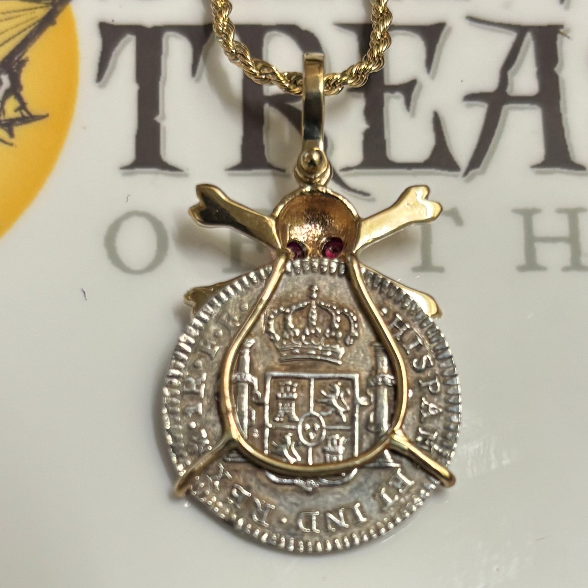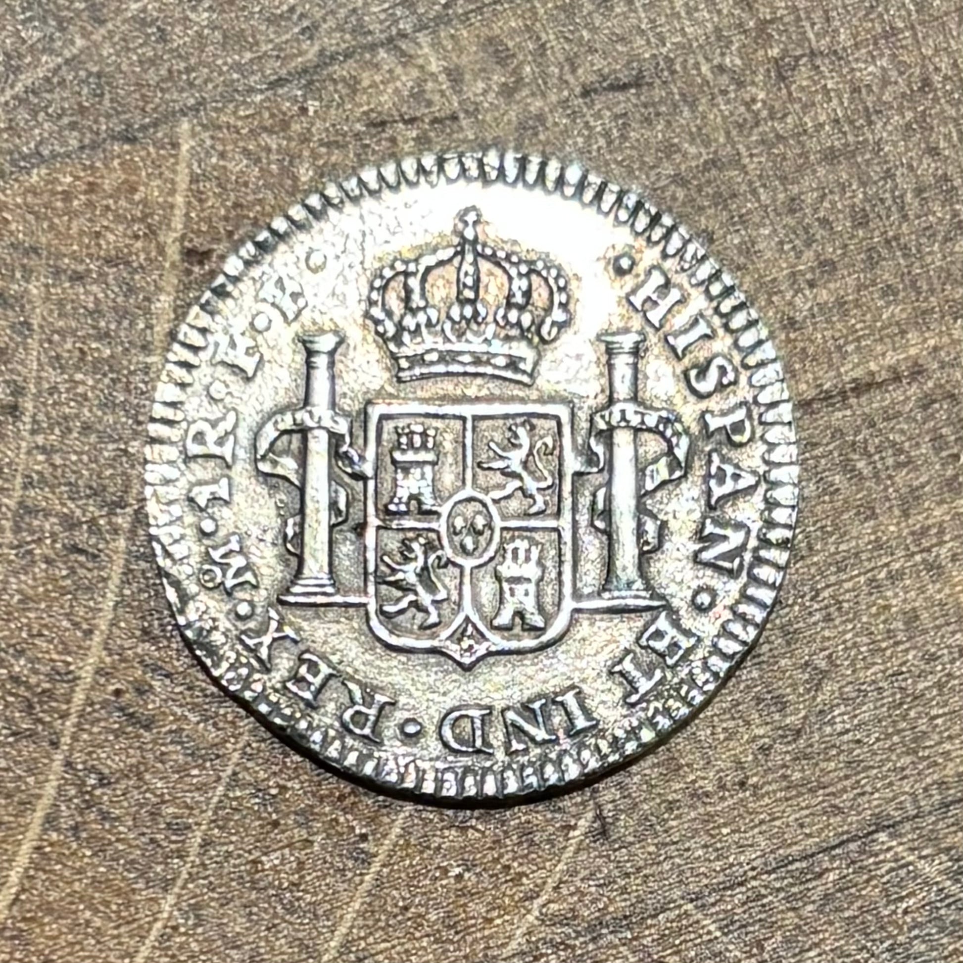 Description: Spanish Cob from the wreck of the El Cazador. Obverse: Legend (Carolus III – DEI GRATIA). Translation: “By the grace of god”. Bust of Carolus III facing left. Reverse: Shield between two Pillars (Pillars of Hercules). Legend: (HISPAN ET IND REX). Translation: “By the Grace of God, King of Spain and the Indies”.